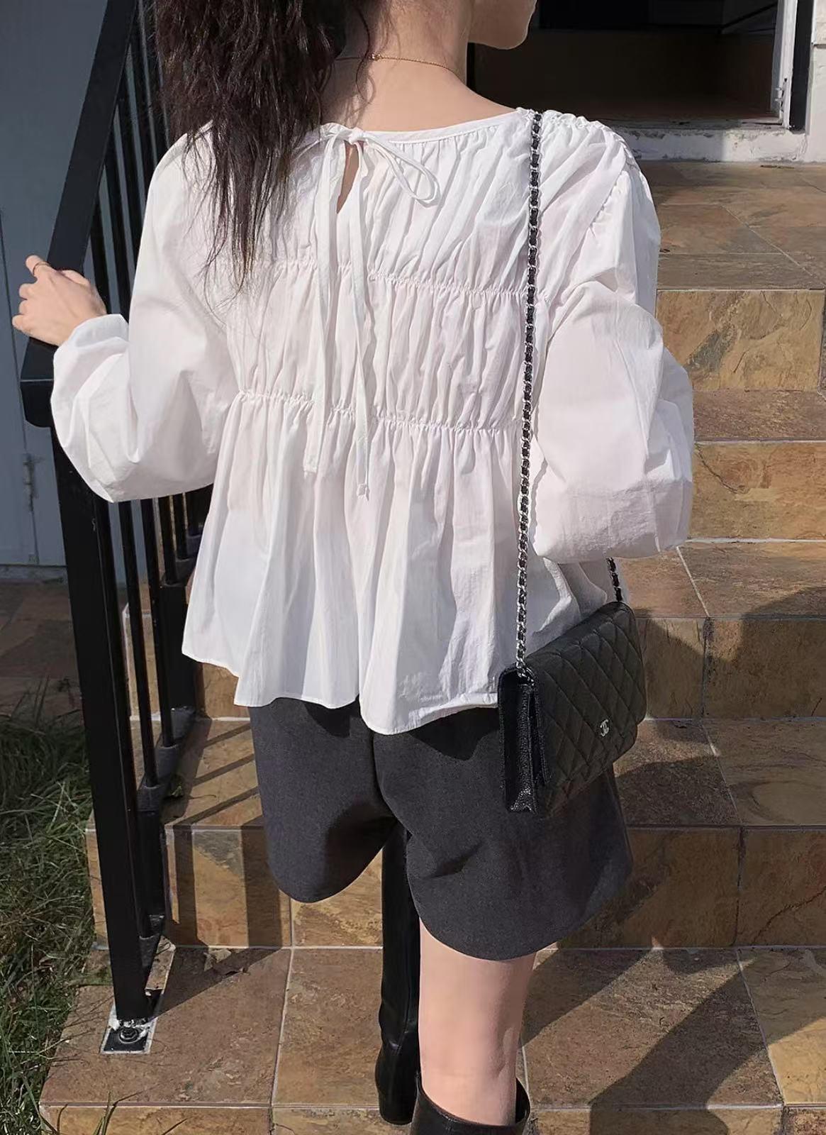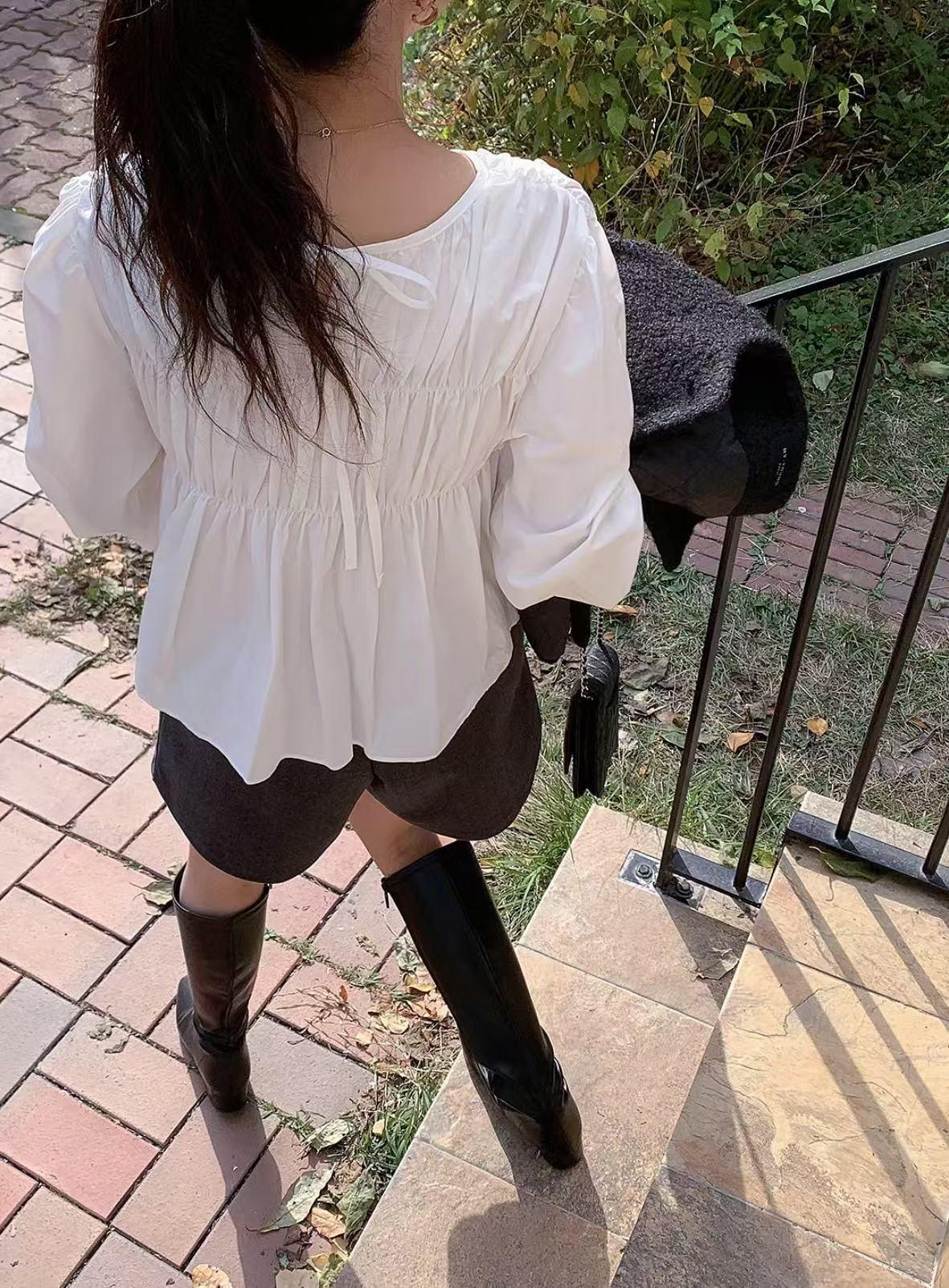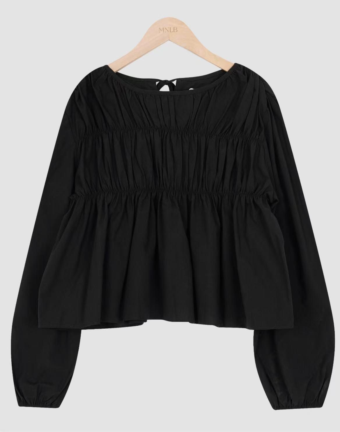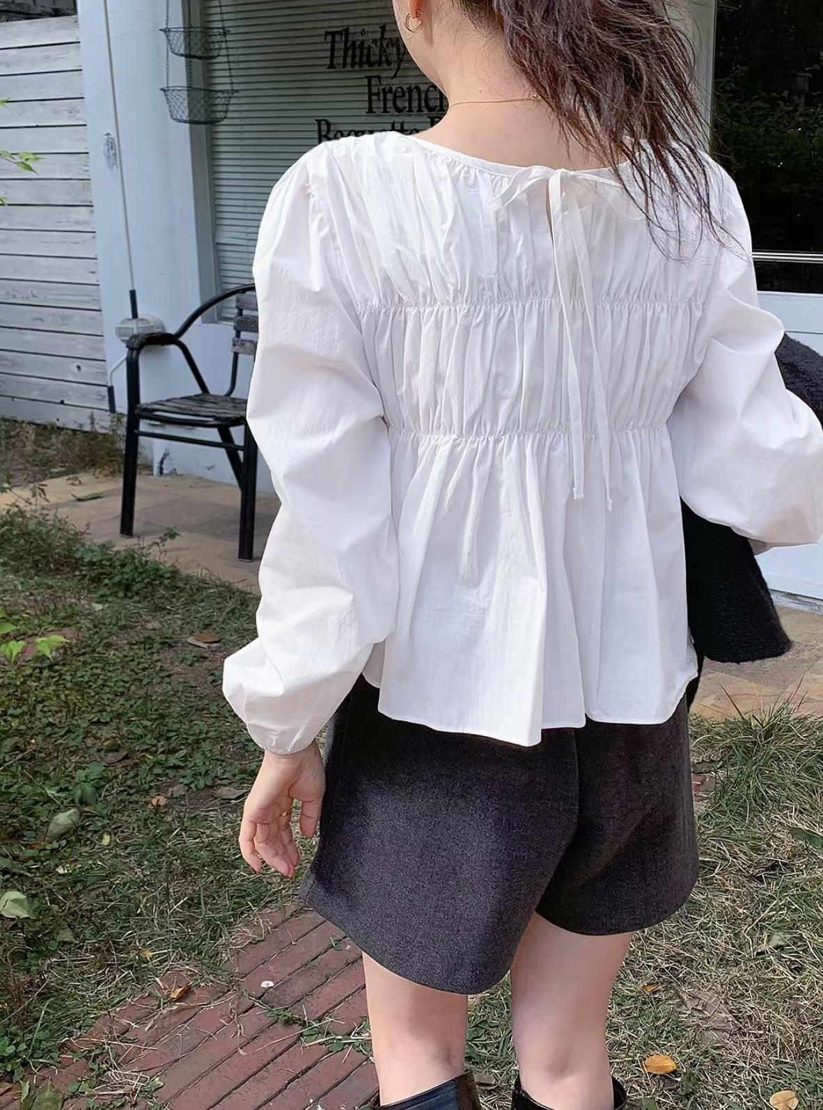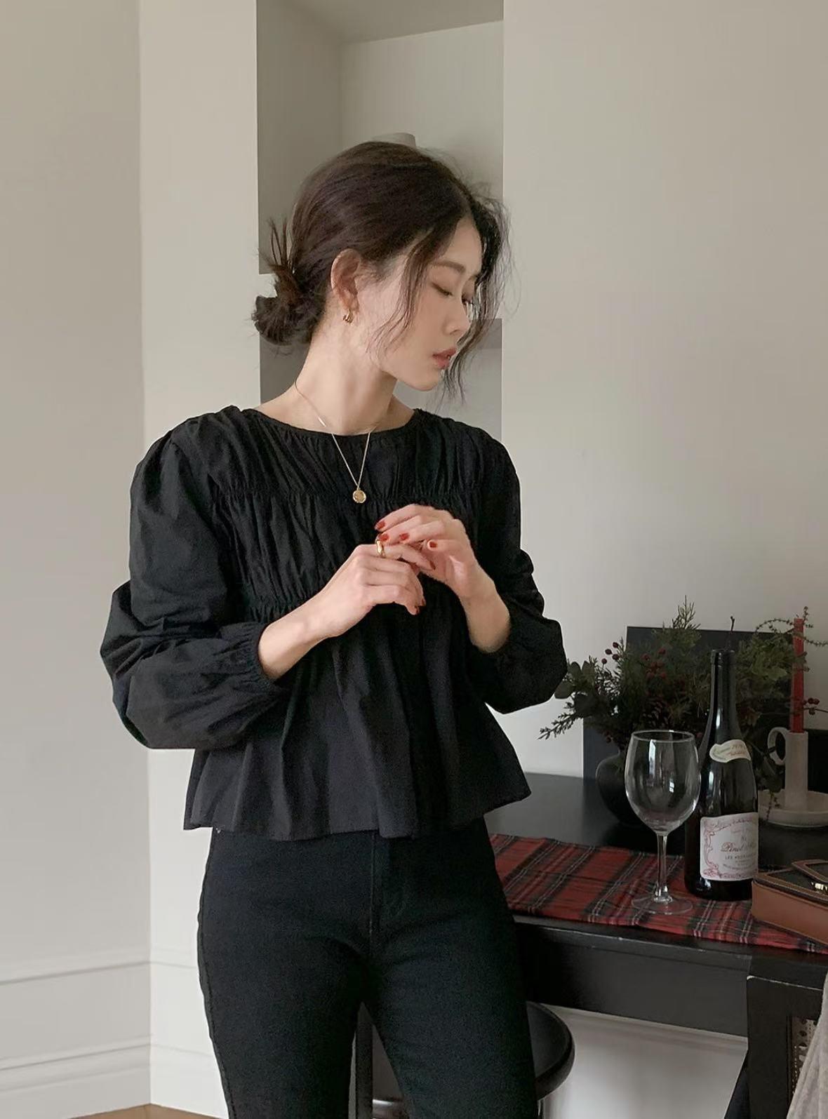 Camisa Chic de Cuello Redondo Plisada Holgada de Manga Larga para Mujer de Corea del Sur