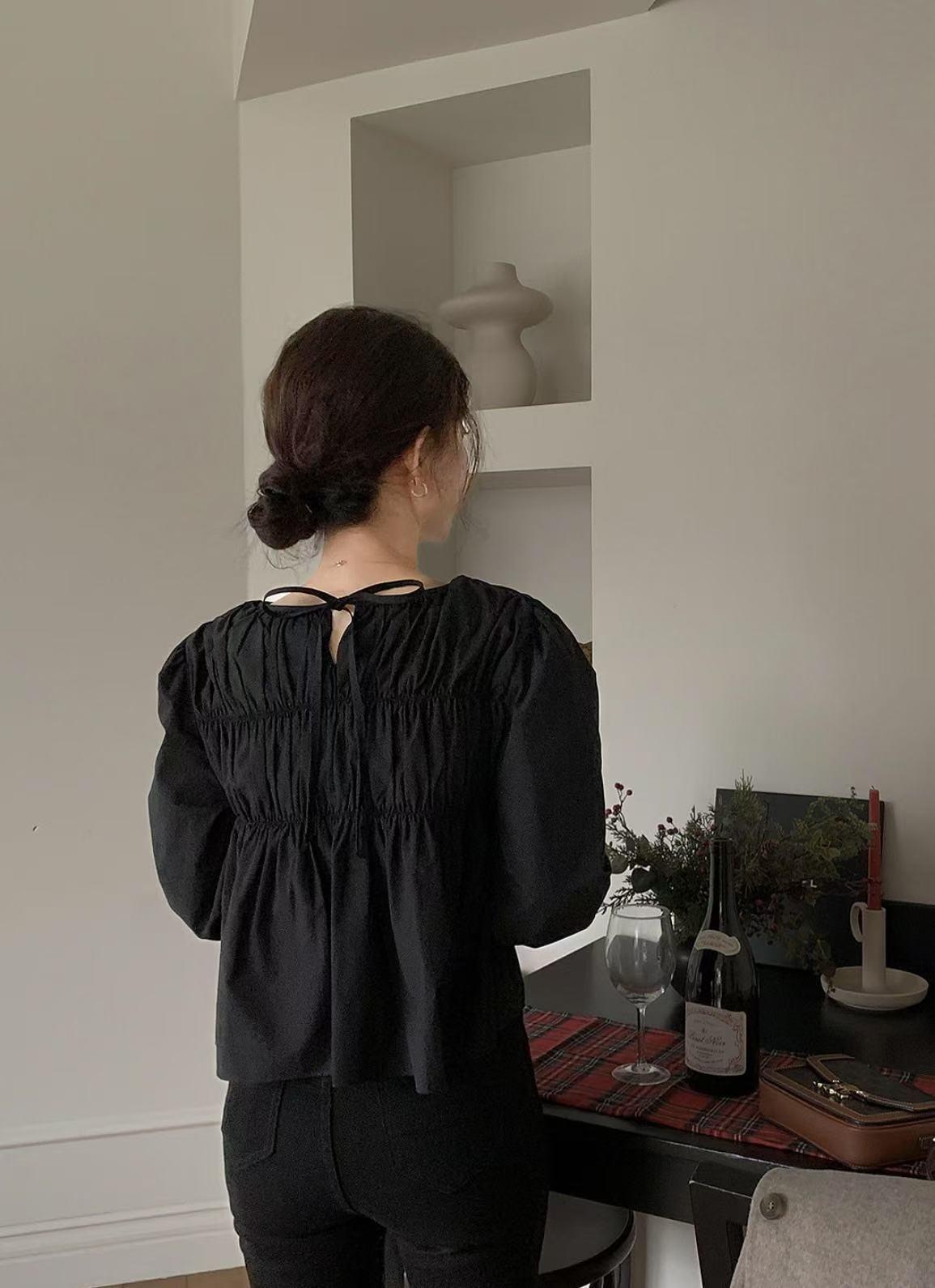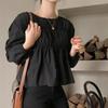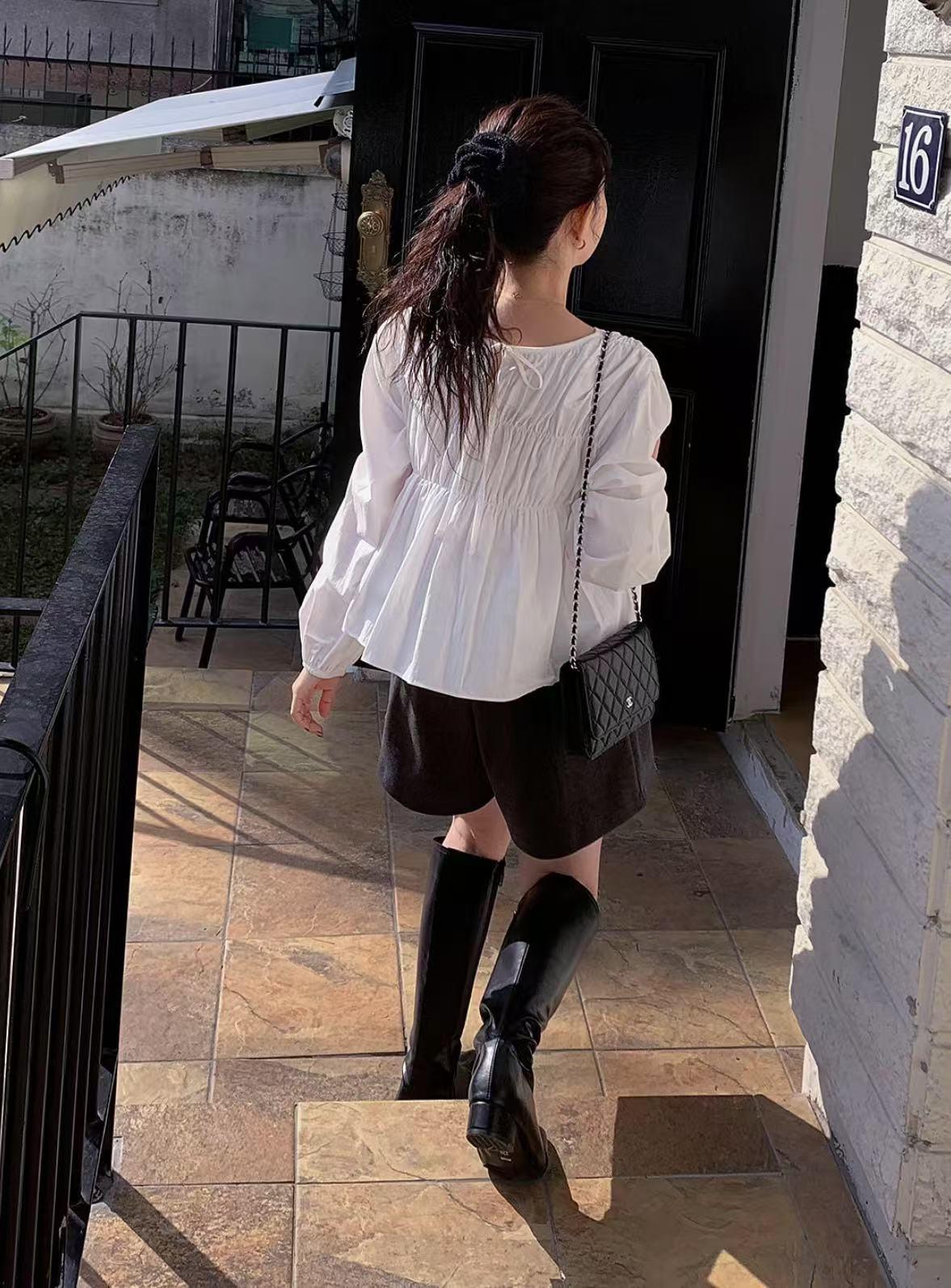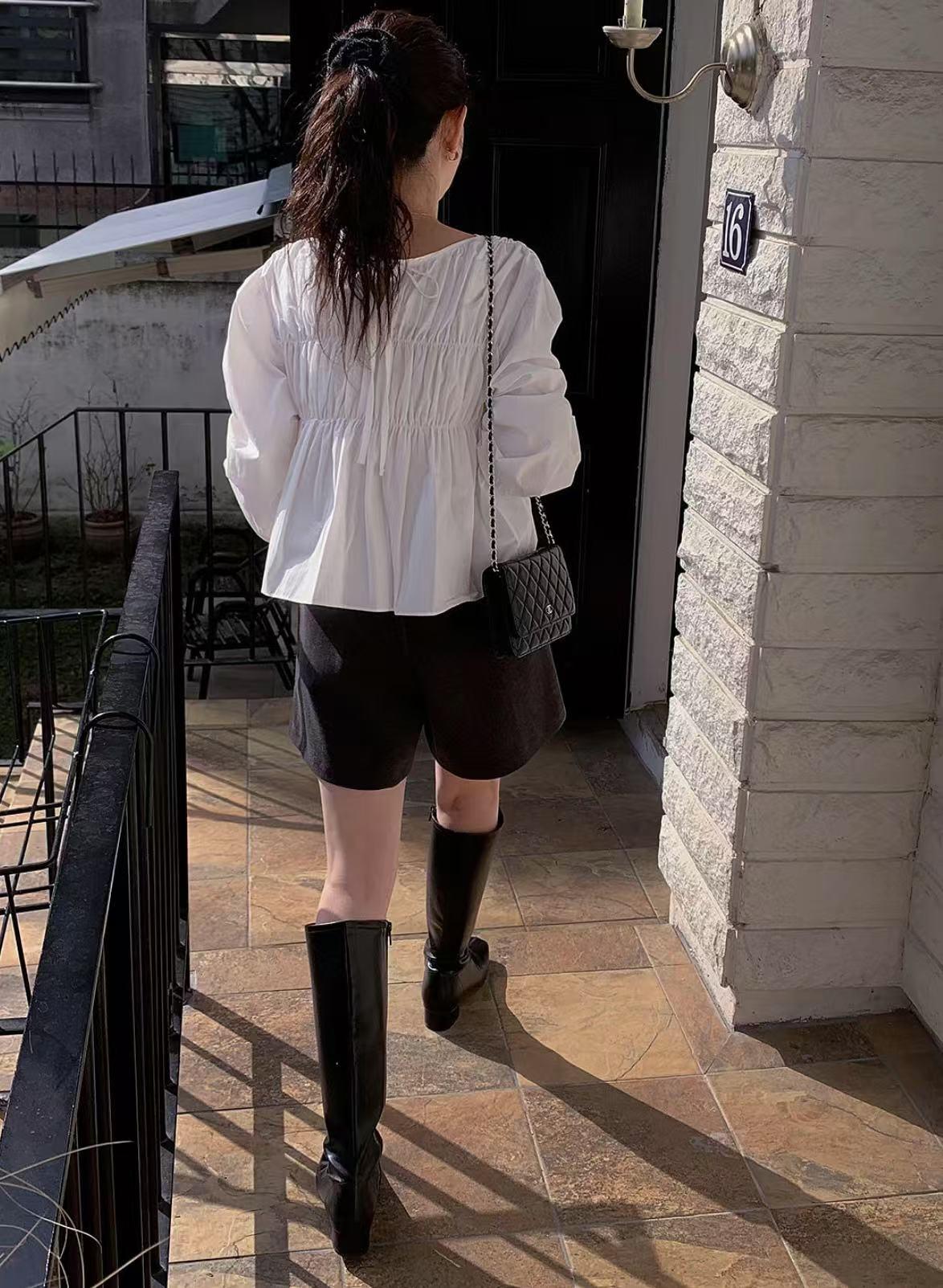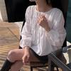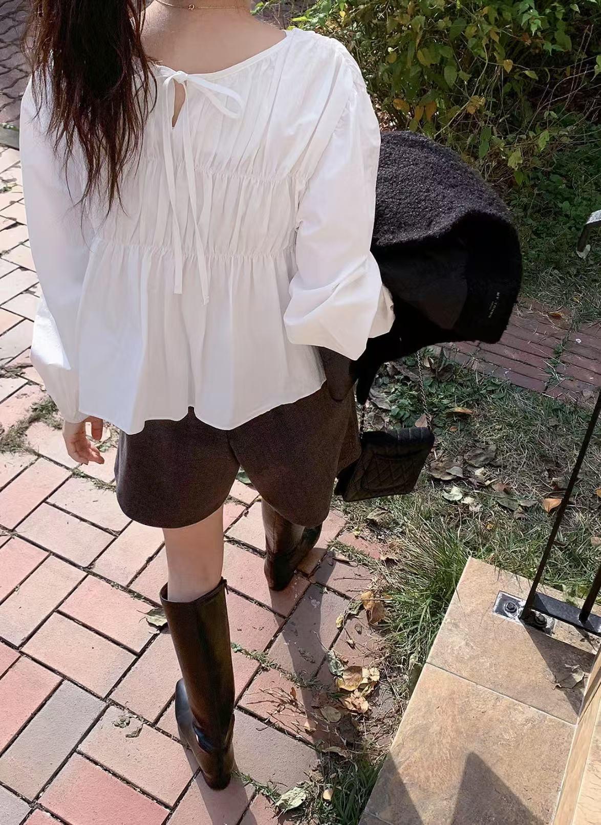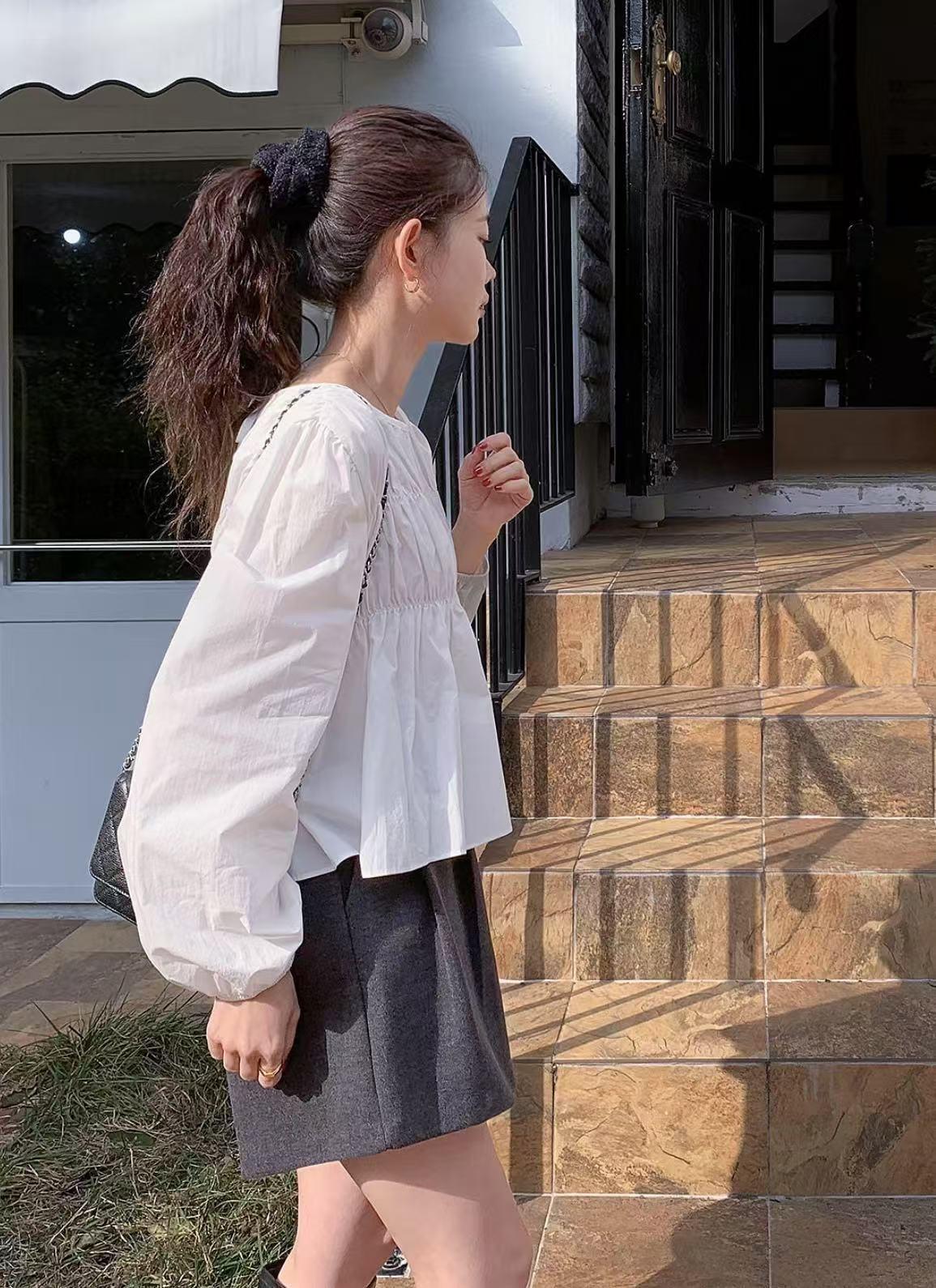 Camisa Chic de Cuello Redondo Plisada Holgada de Manga Larga para Mujer de Corea del Sur
