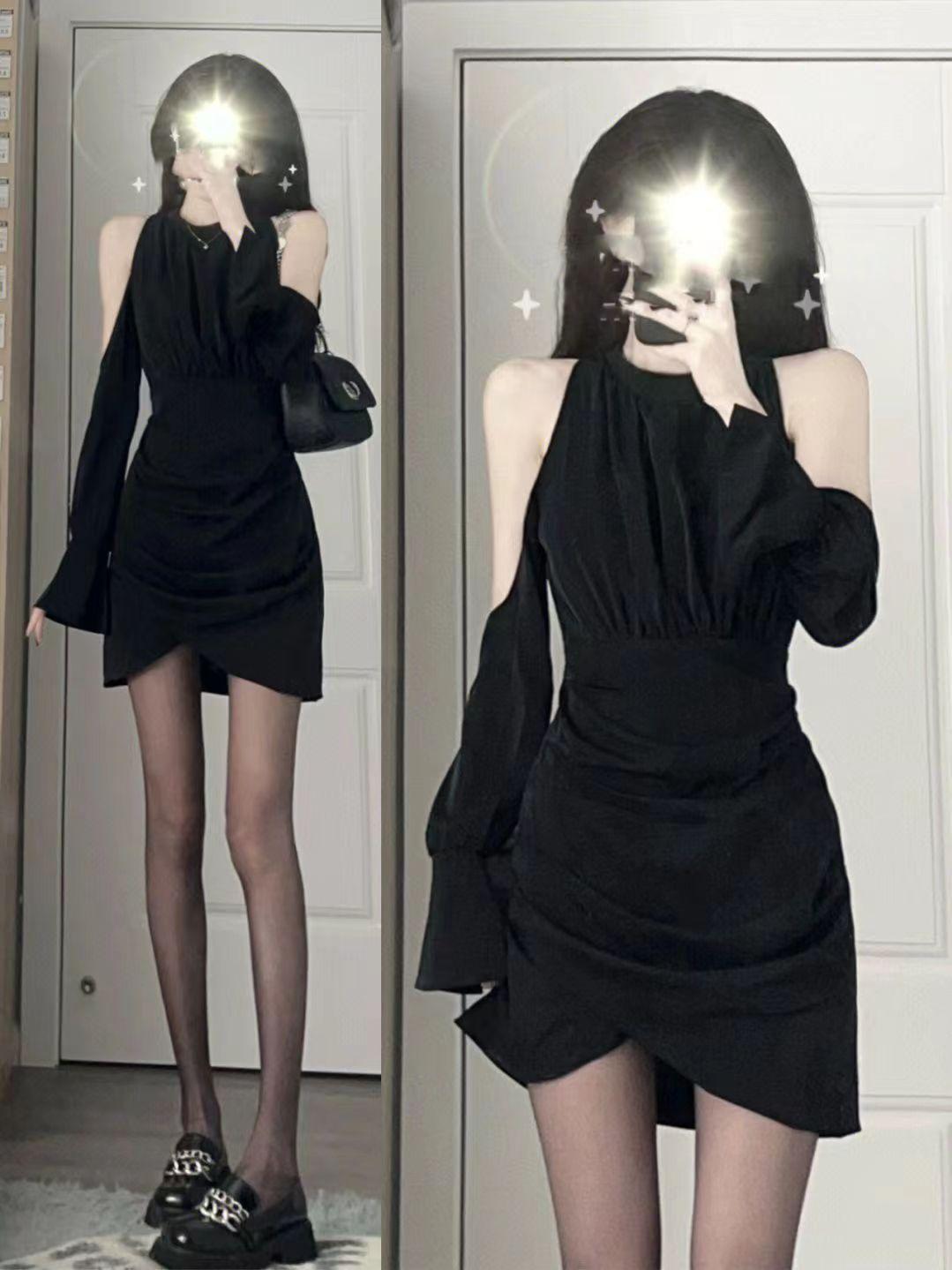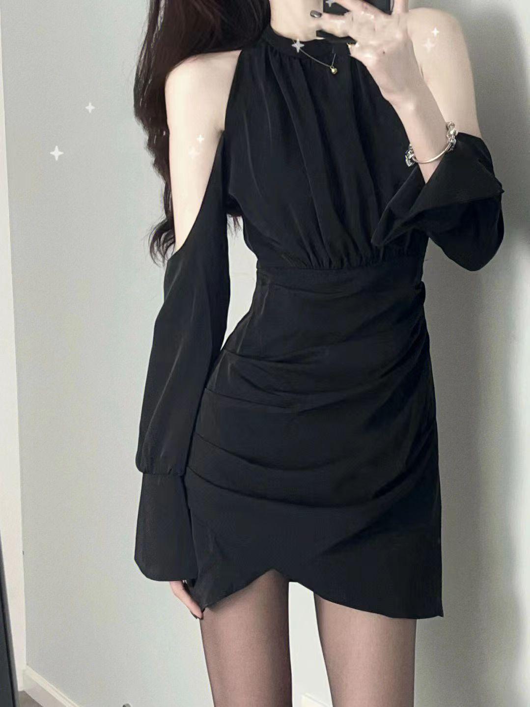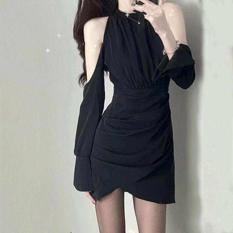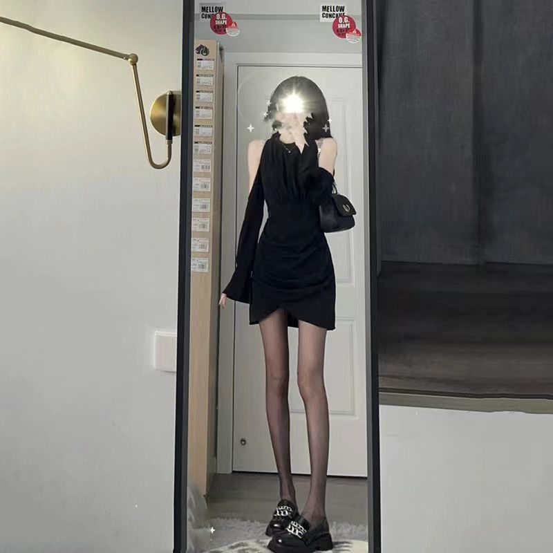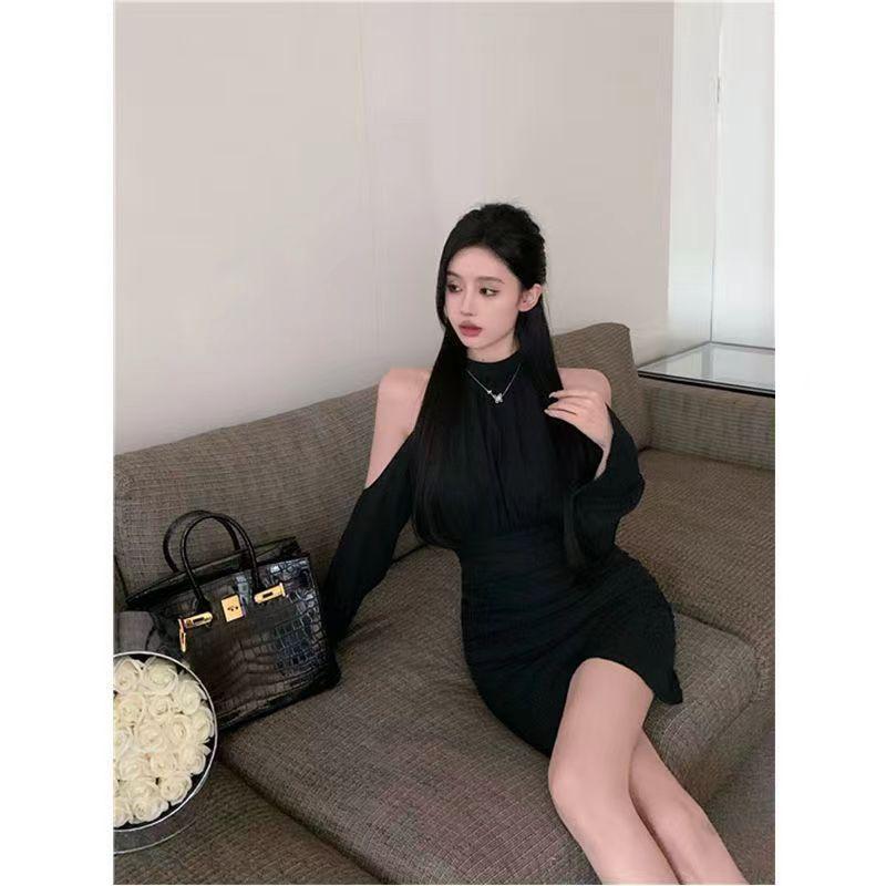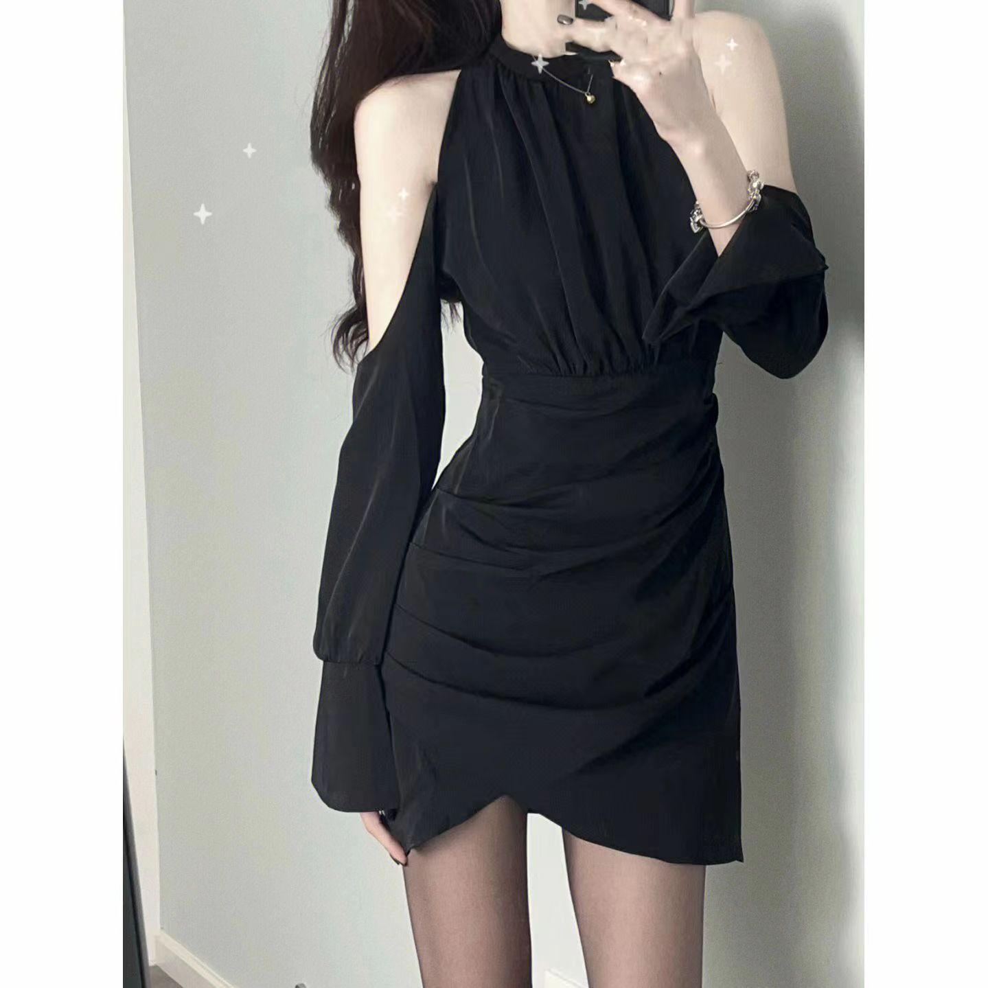 Vestido Halter Negro de Deseo Puro con Hombros Descubiertos para Mujer, Otoño Nuevo Estilo, Hermoso Cintura Plisado Temperamento Celebridad Falda de Cadera