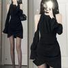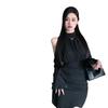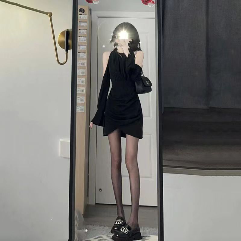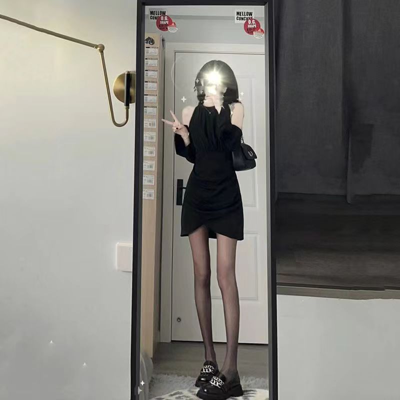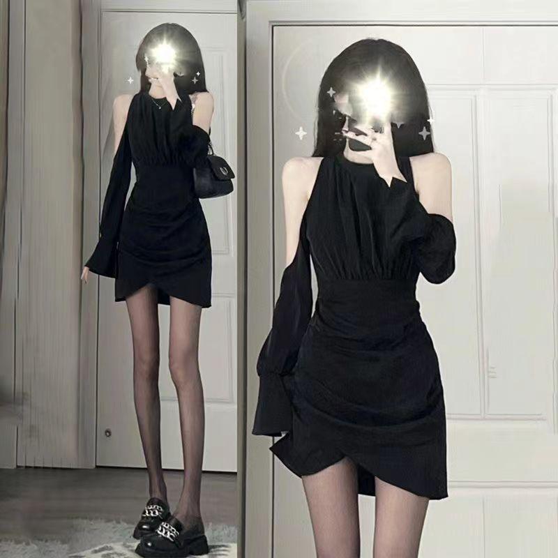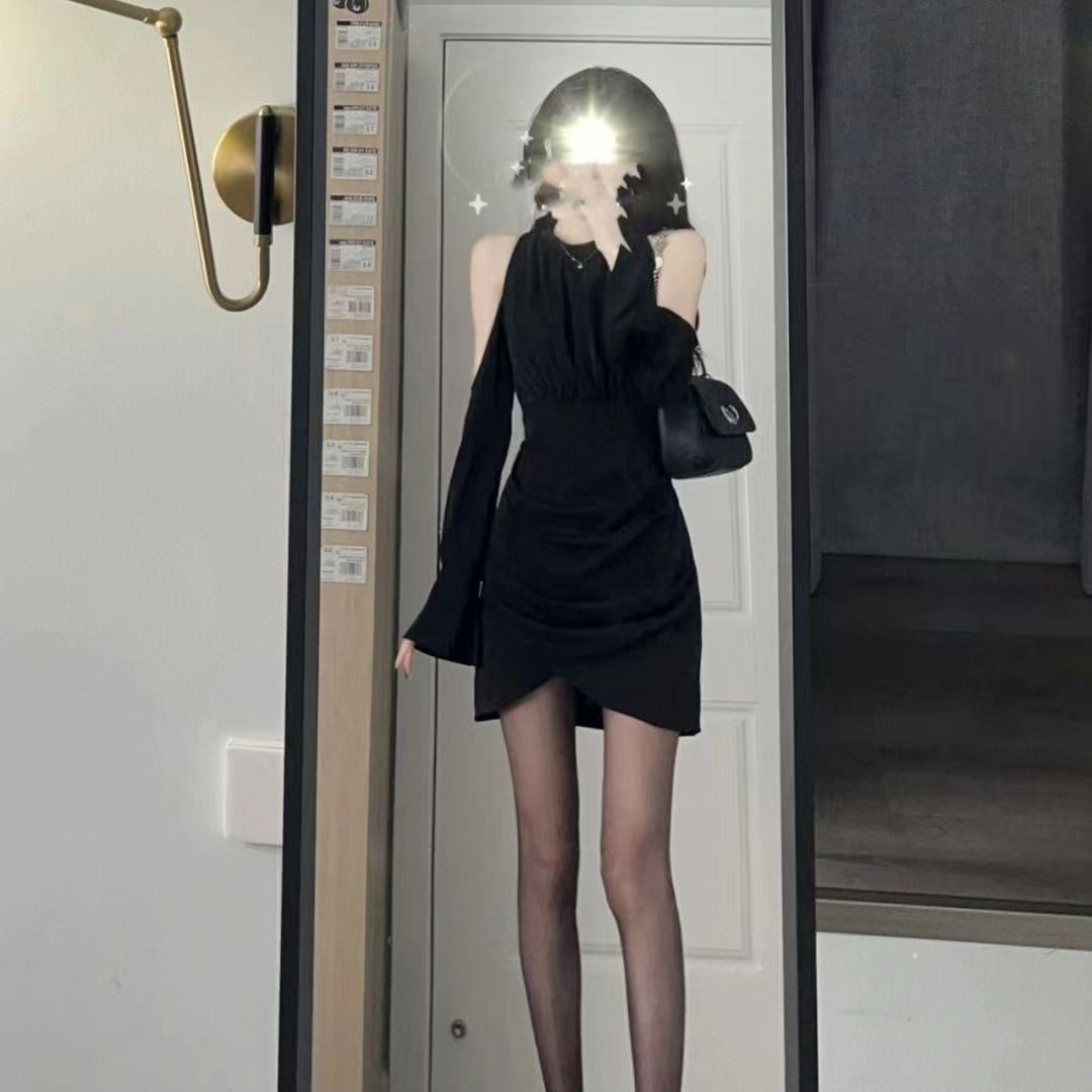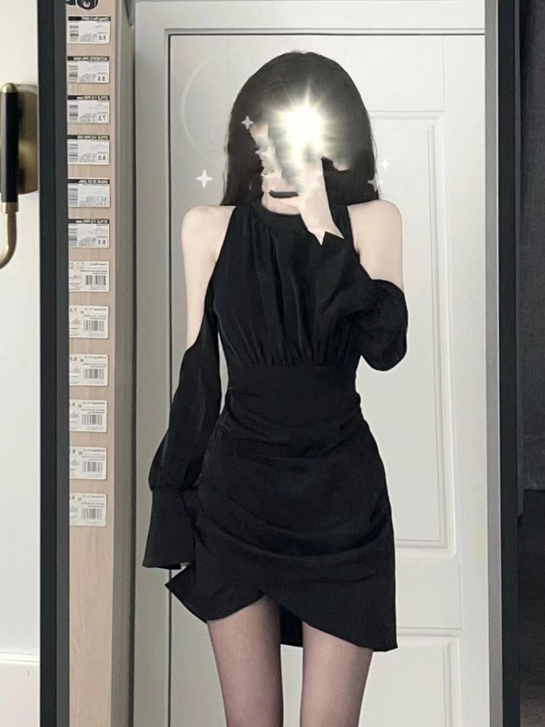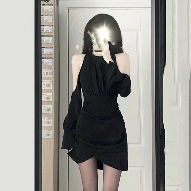 Vestido Halter Negro de Deseo Puro con Hombros Descubiertos para Mujer, Otoño Nuevo Estilo, Hermoso Cintura Plisado Temperamento Celebridad Falda de Cadera