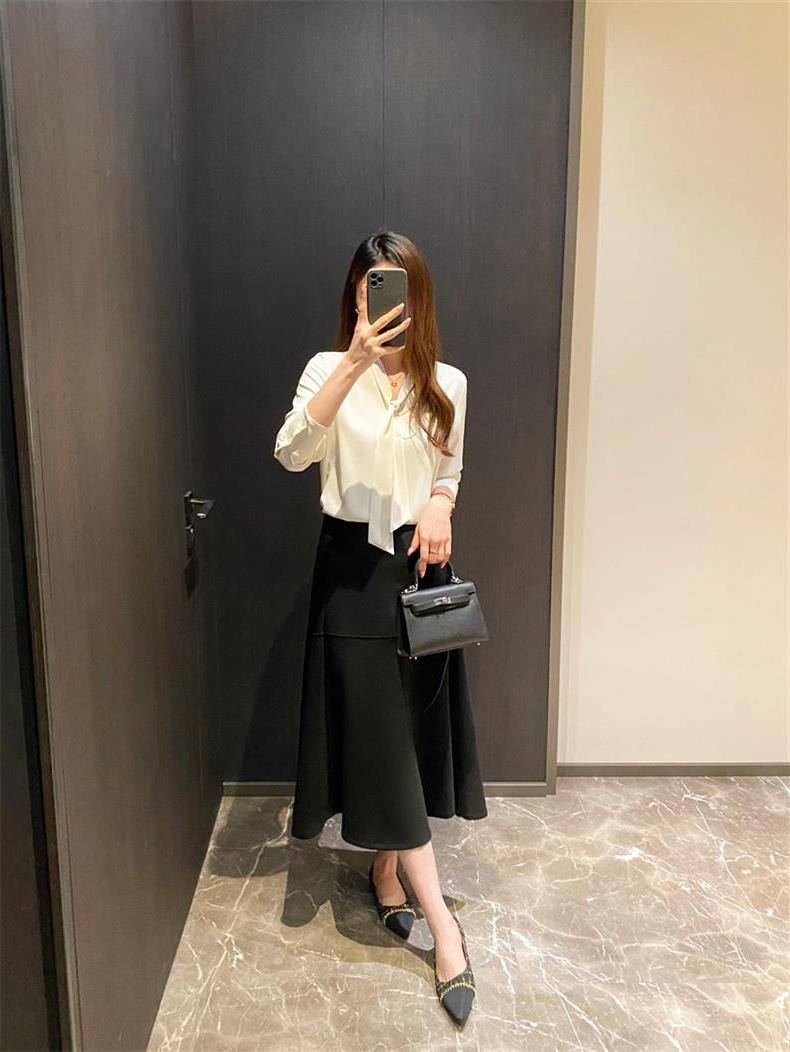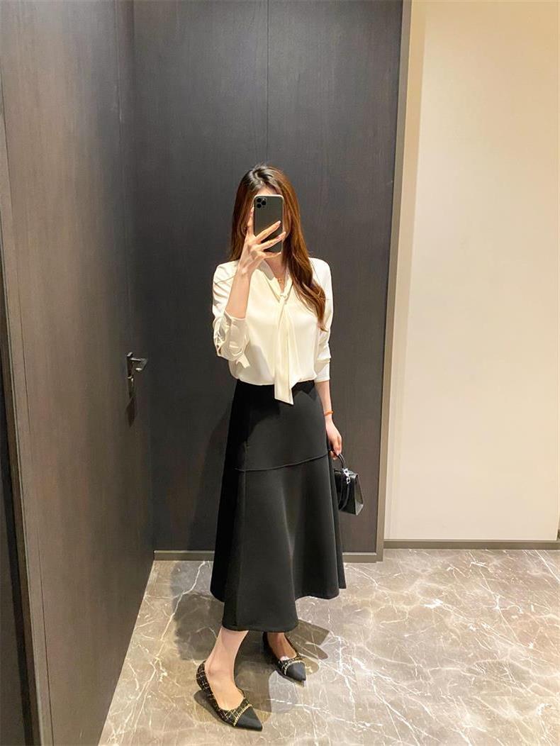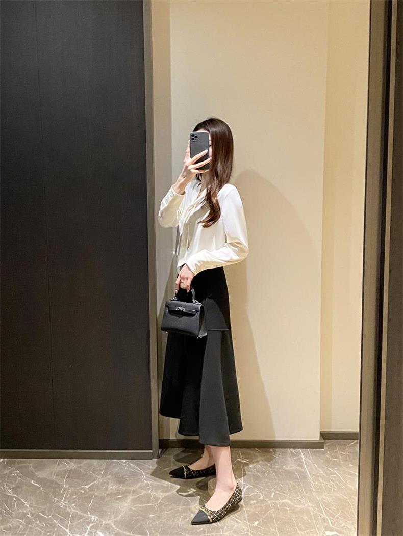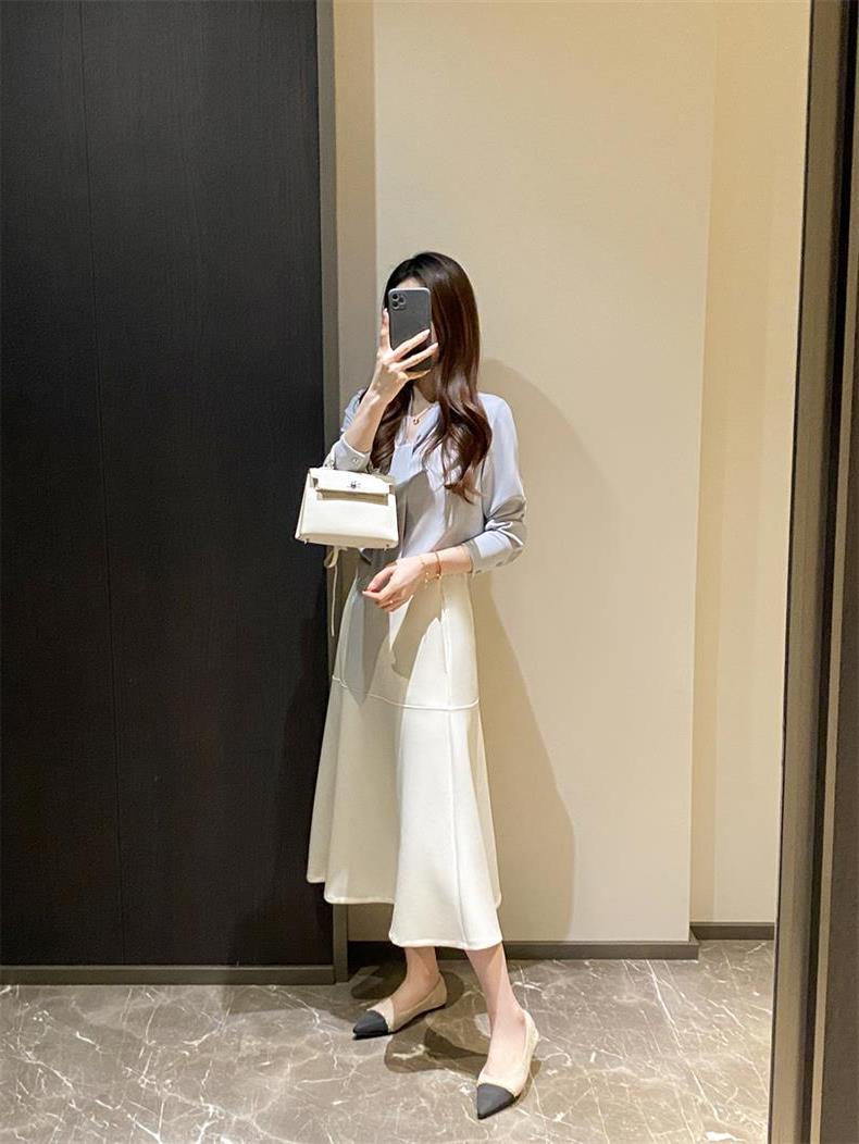 Diseño de largo medio y cintura alta, corte tridimensional y empalme de la falda, simple pero elegante