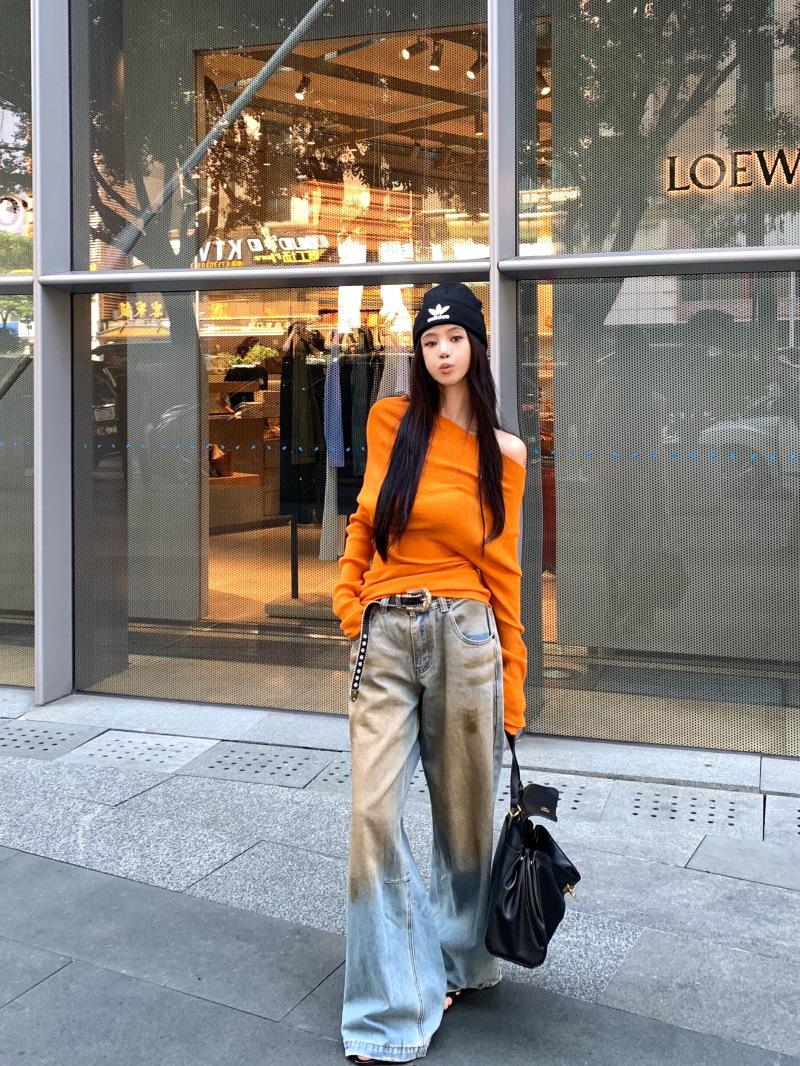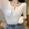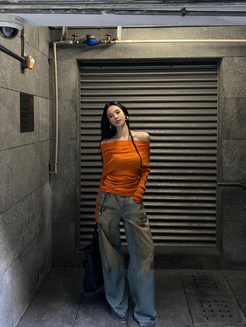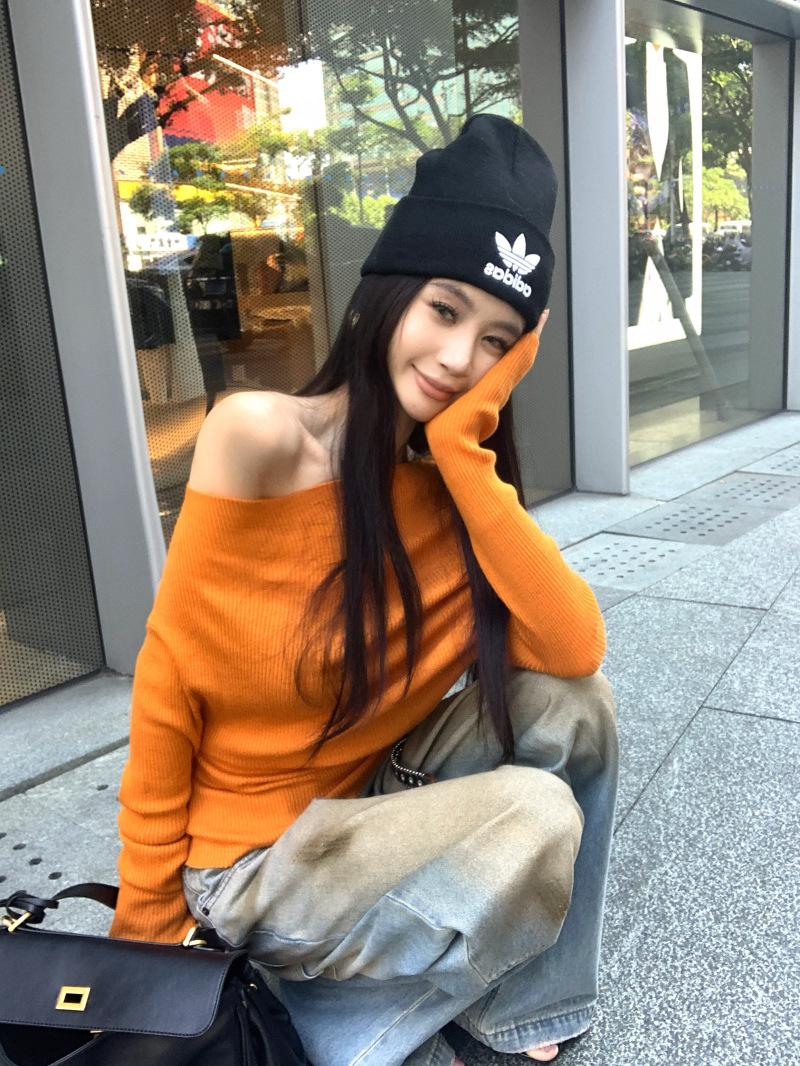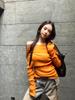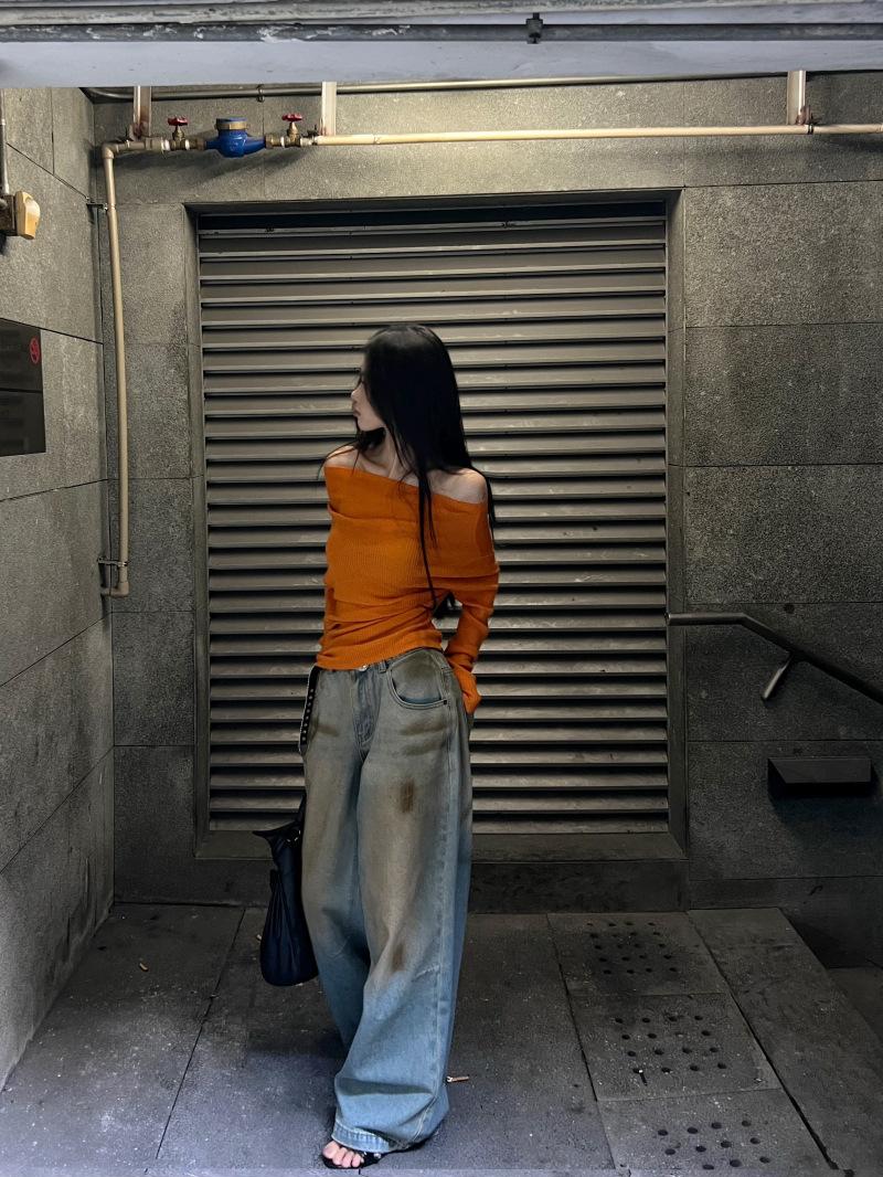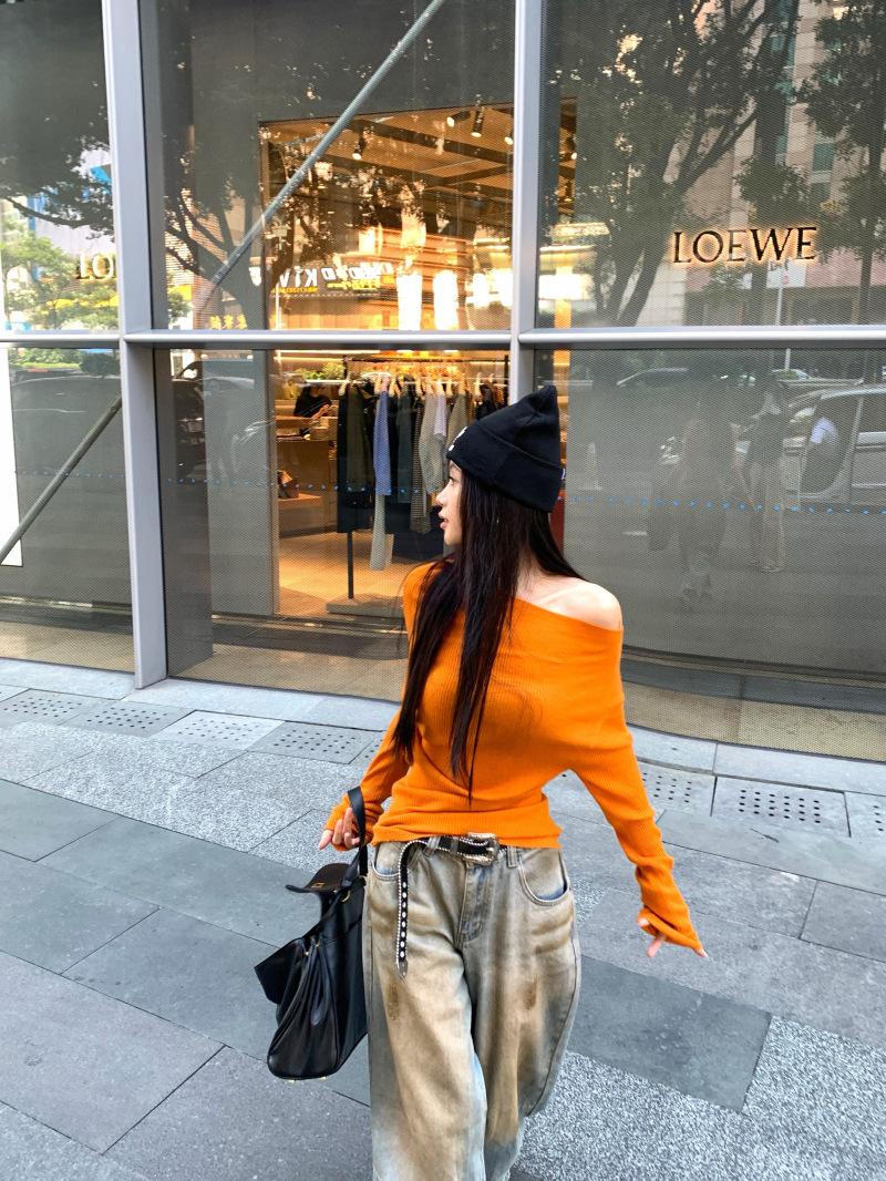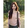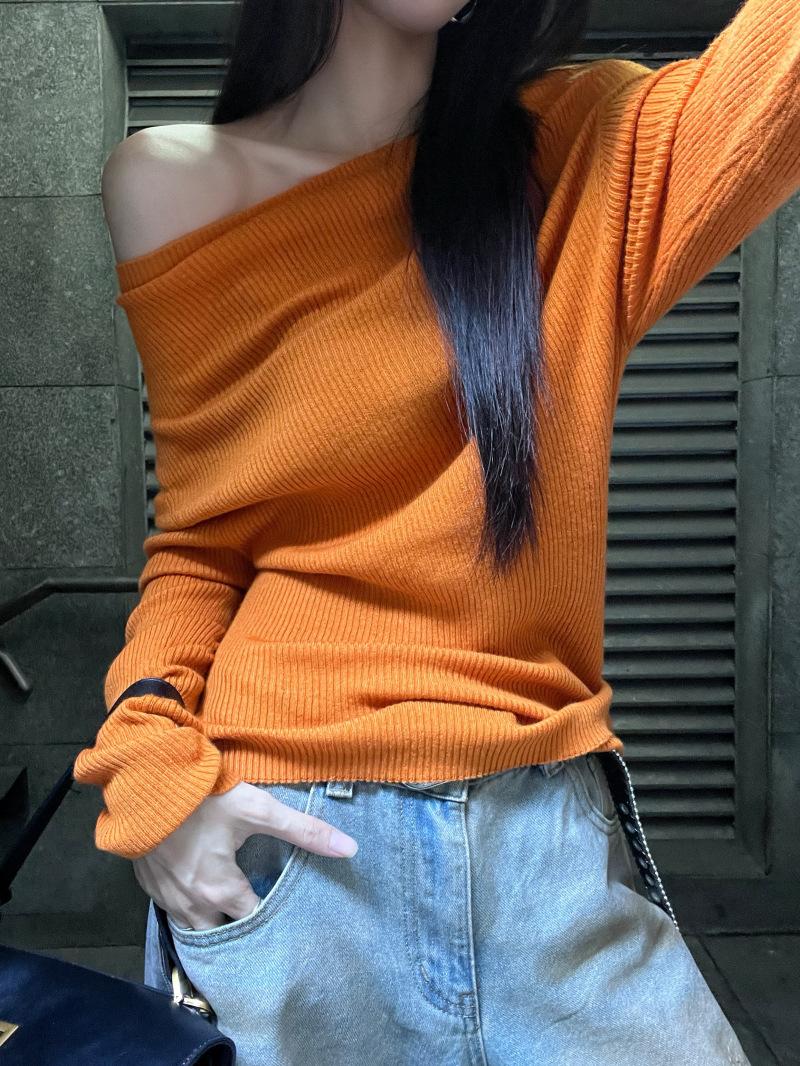 Camiseta de punto con hombros al descubierto y diseño retro de color sólido de Spice Girl para principios de otoño, nueva camiseta ajustada que adelgaza la cintura y combina con todo.