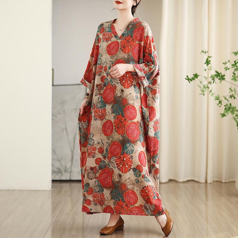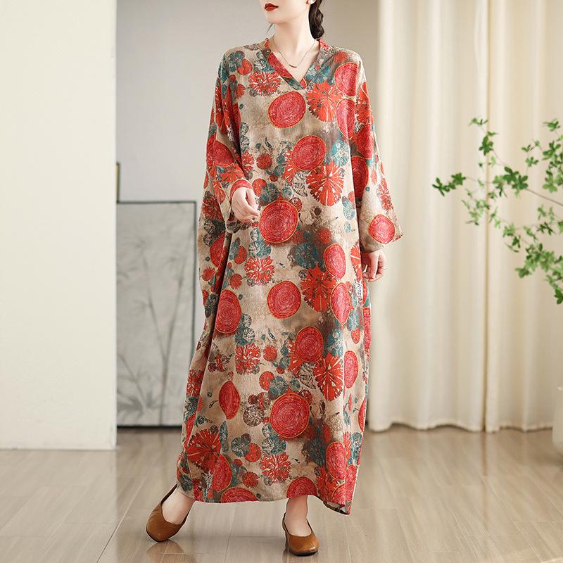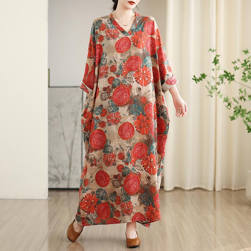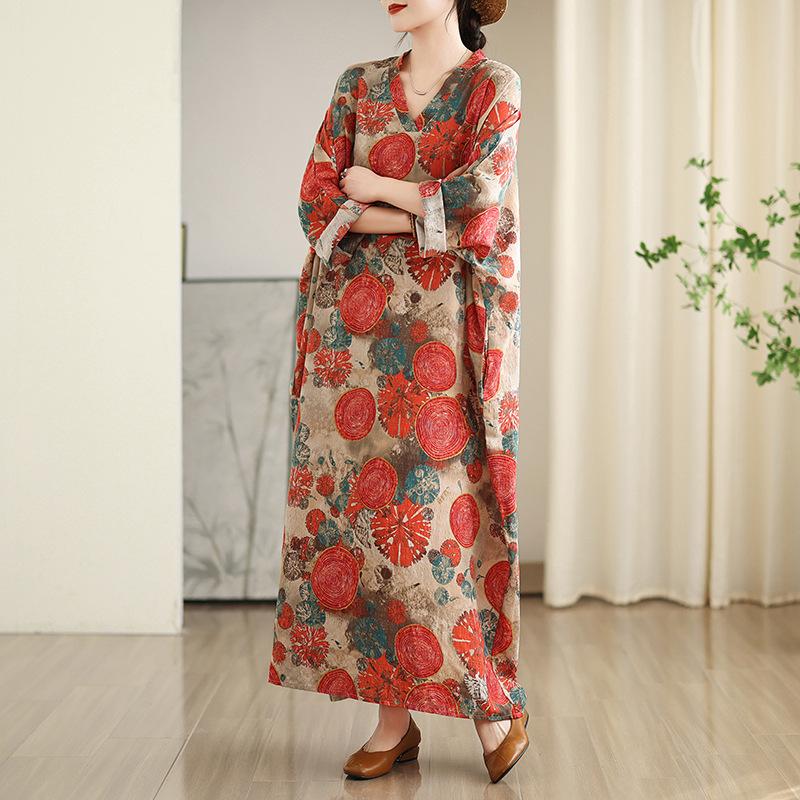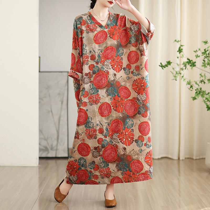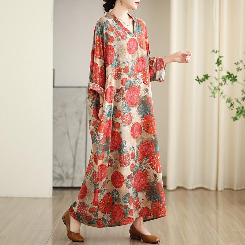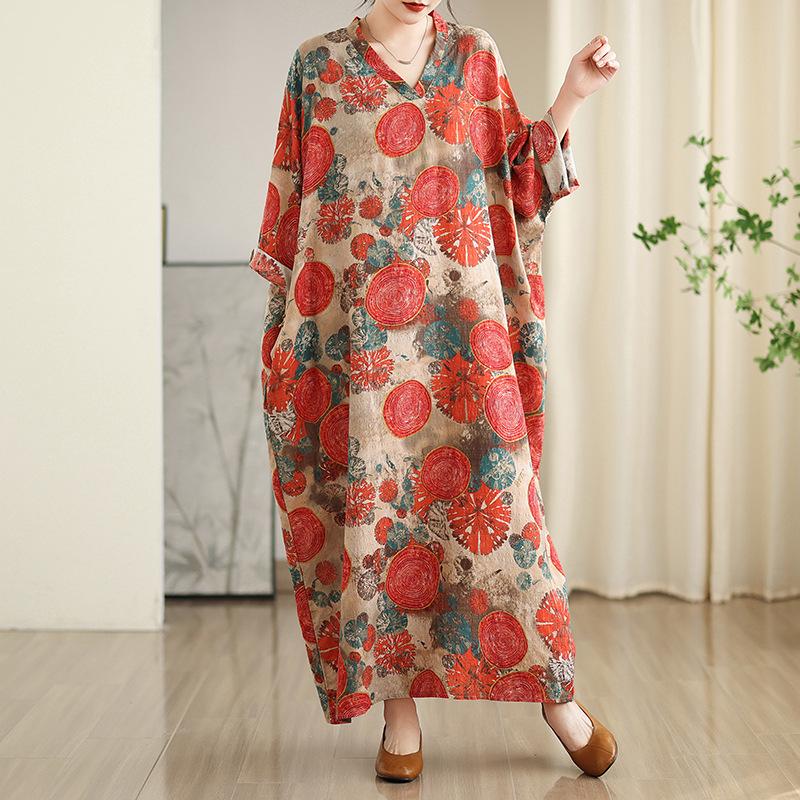 Vestido de algodón y lino con cuello en V, estilo retro, estilo festivo, de viaje, con falda larga y color, de principios de primavera de 2025.