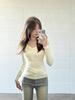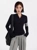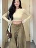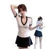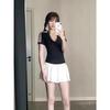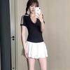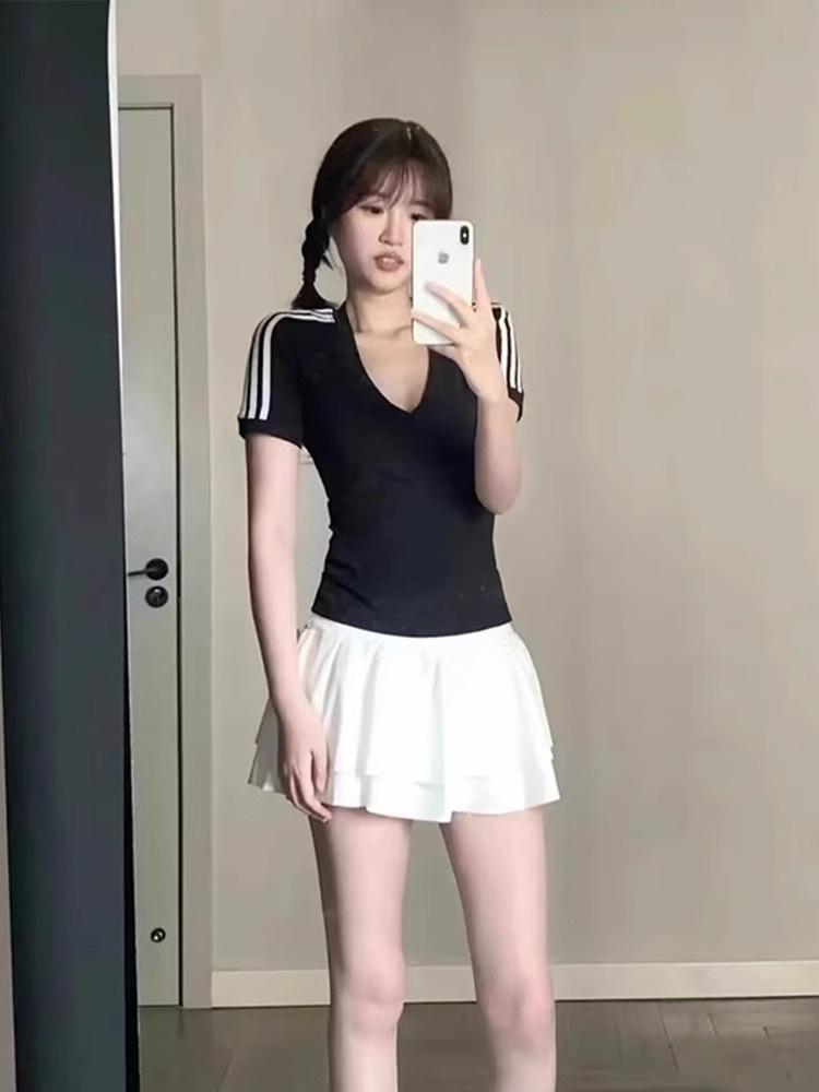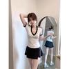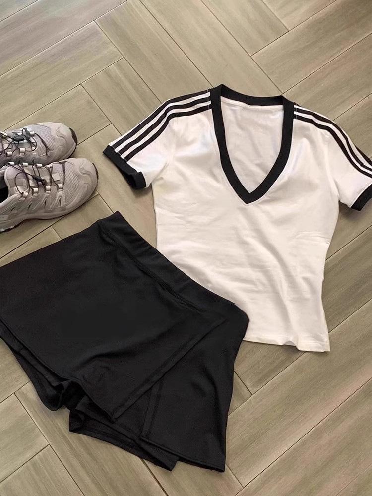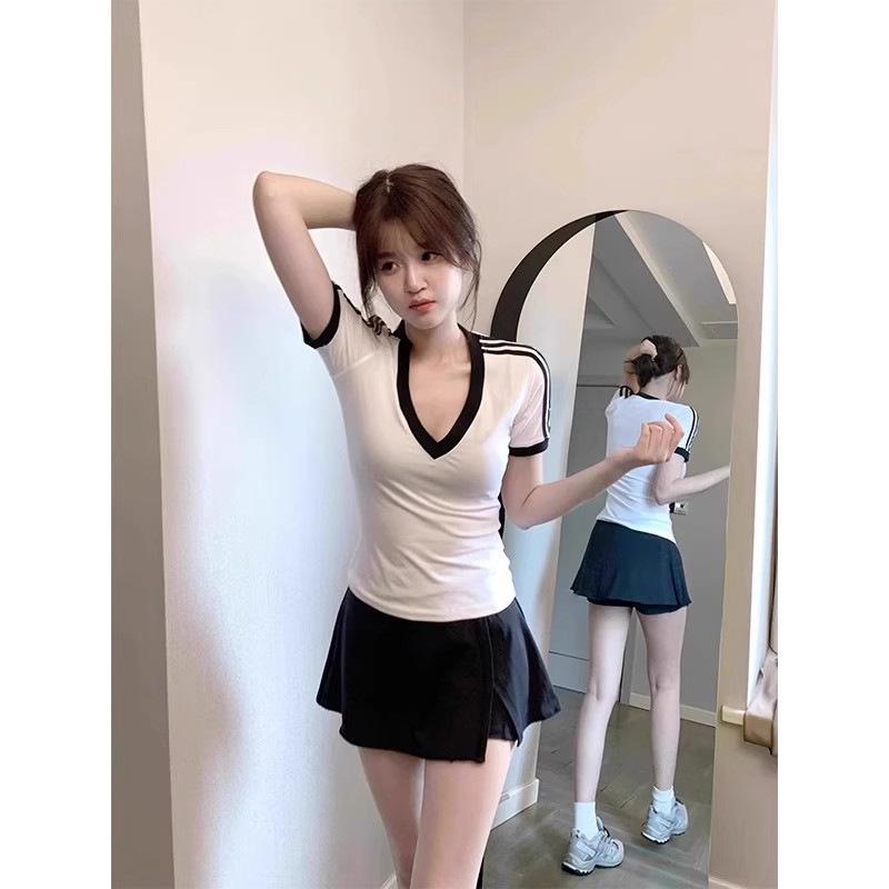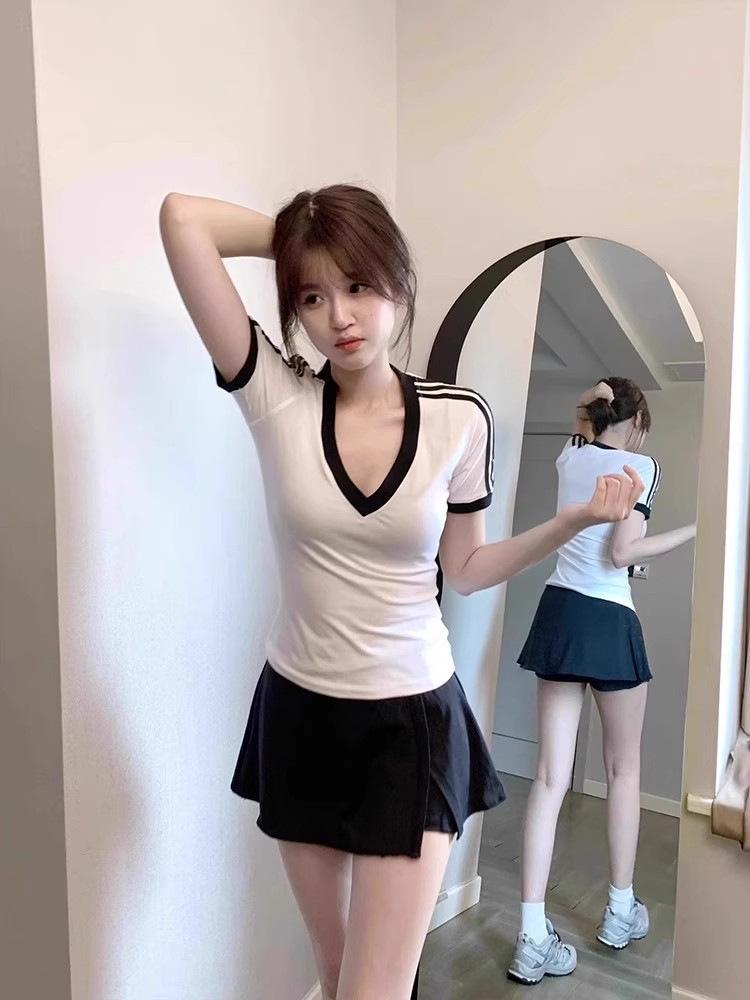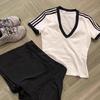 Camiseta de manga corta con cuello en V, ajustada y adelgazante, estilo americano Spice Girls, con colores contrastantes, estilo Pure Desire, top sexy de nicho que combina con todo.