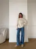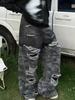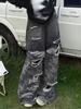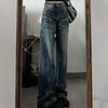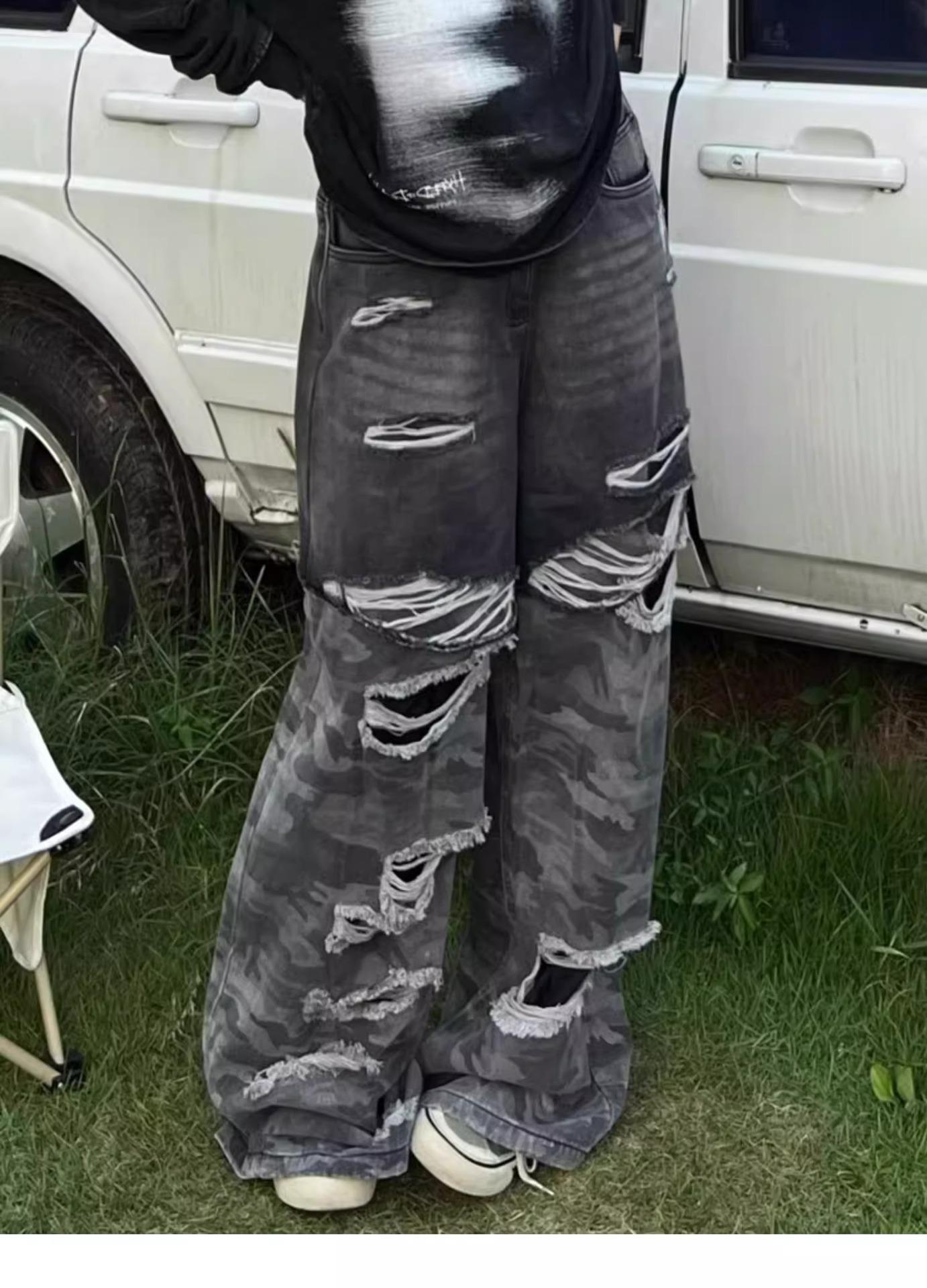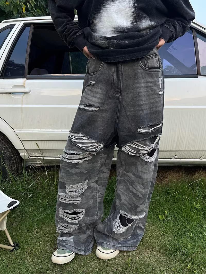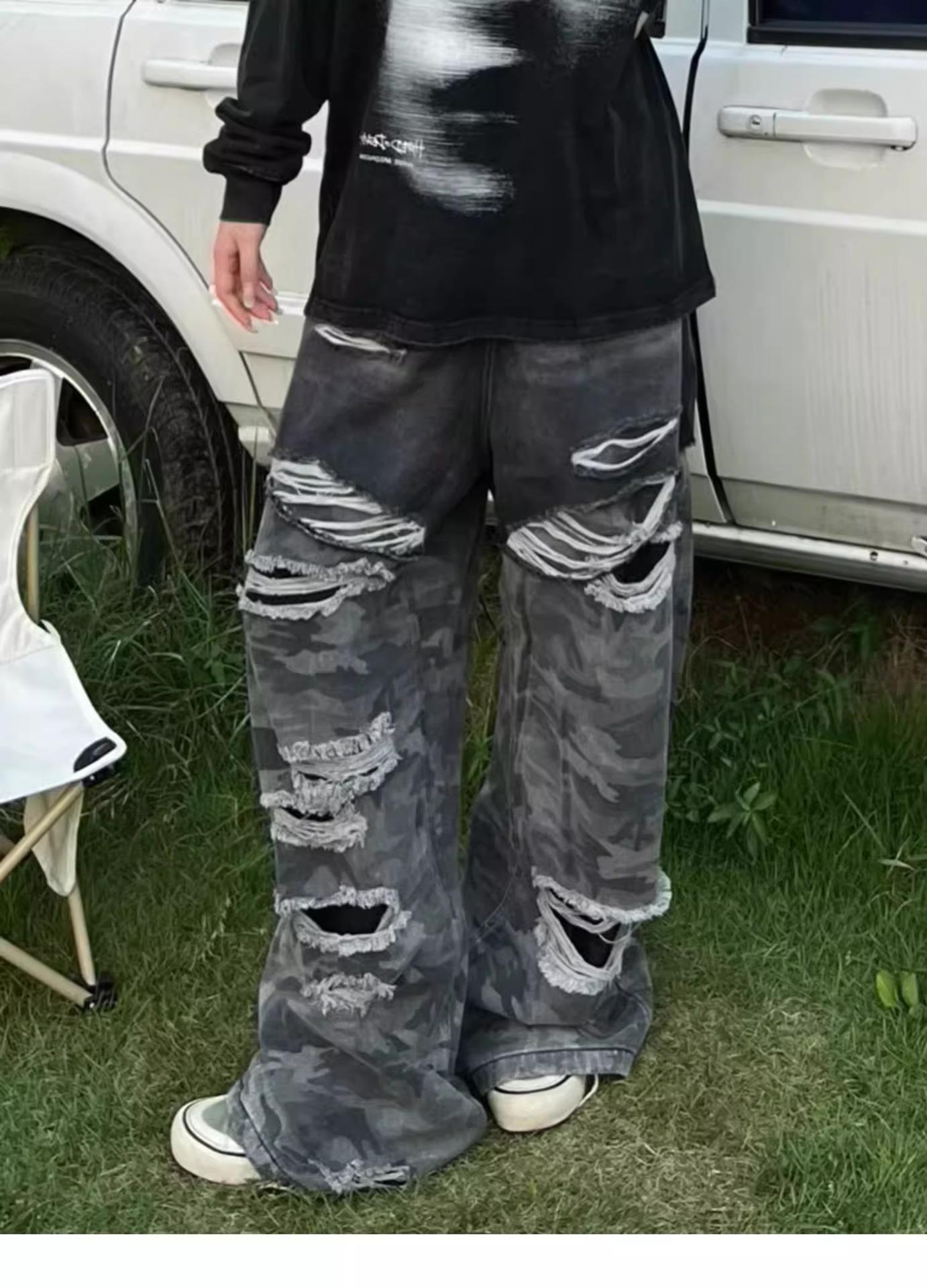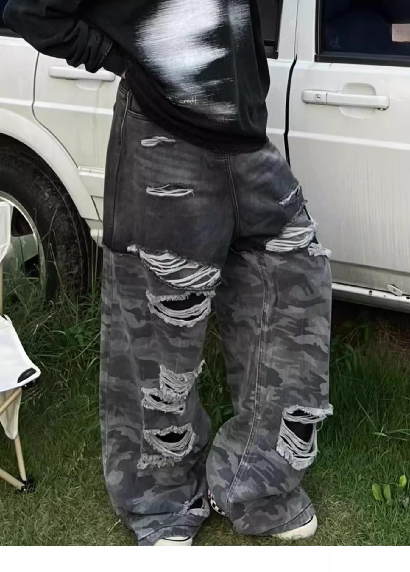 Pantalones vaqueros con costuras de camuflaje estilo americano High Street Design Sense para mujer, primavera y otoño 2024, nuevos pantalones lavados Spice Girl con agujeros.