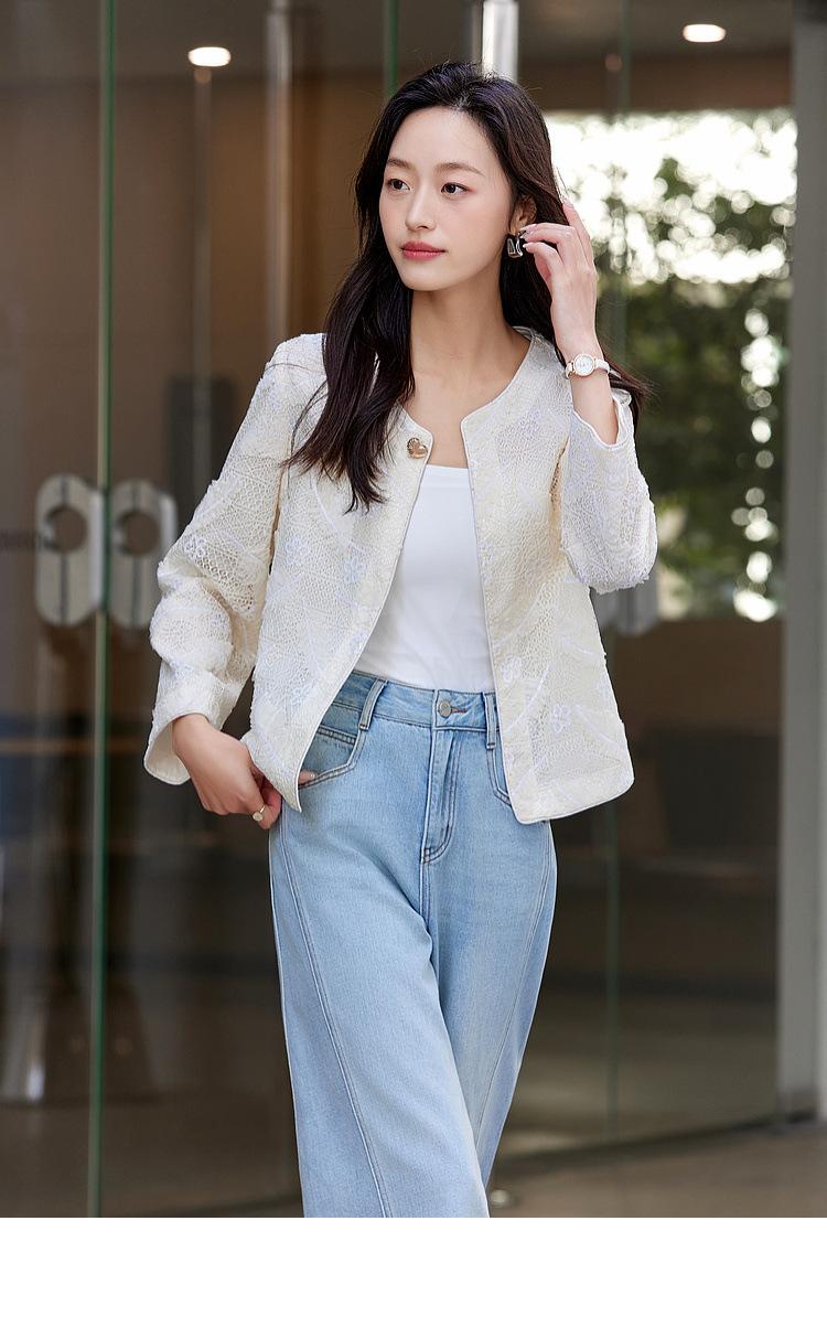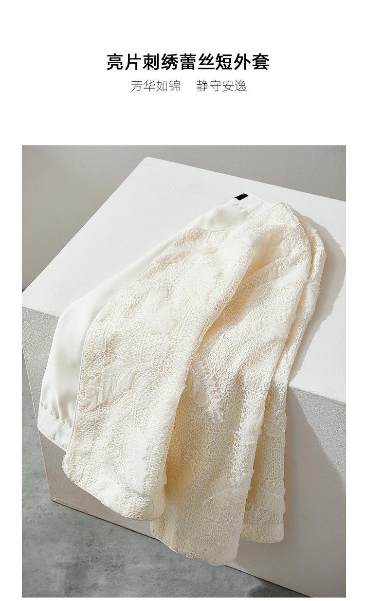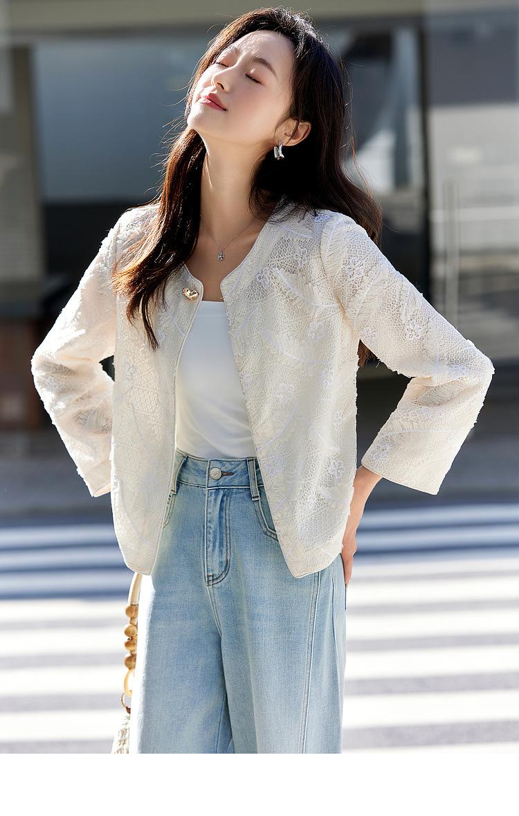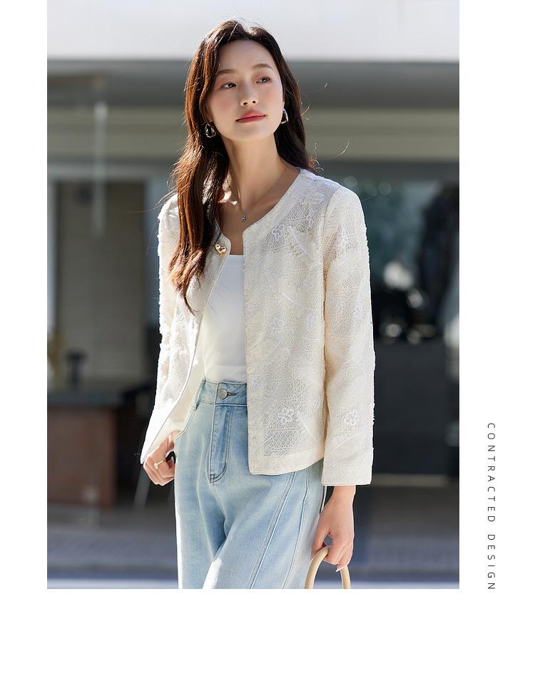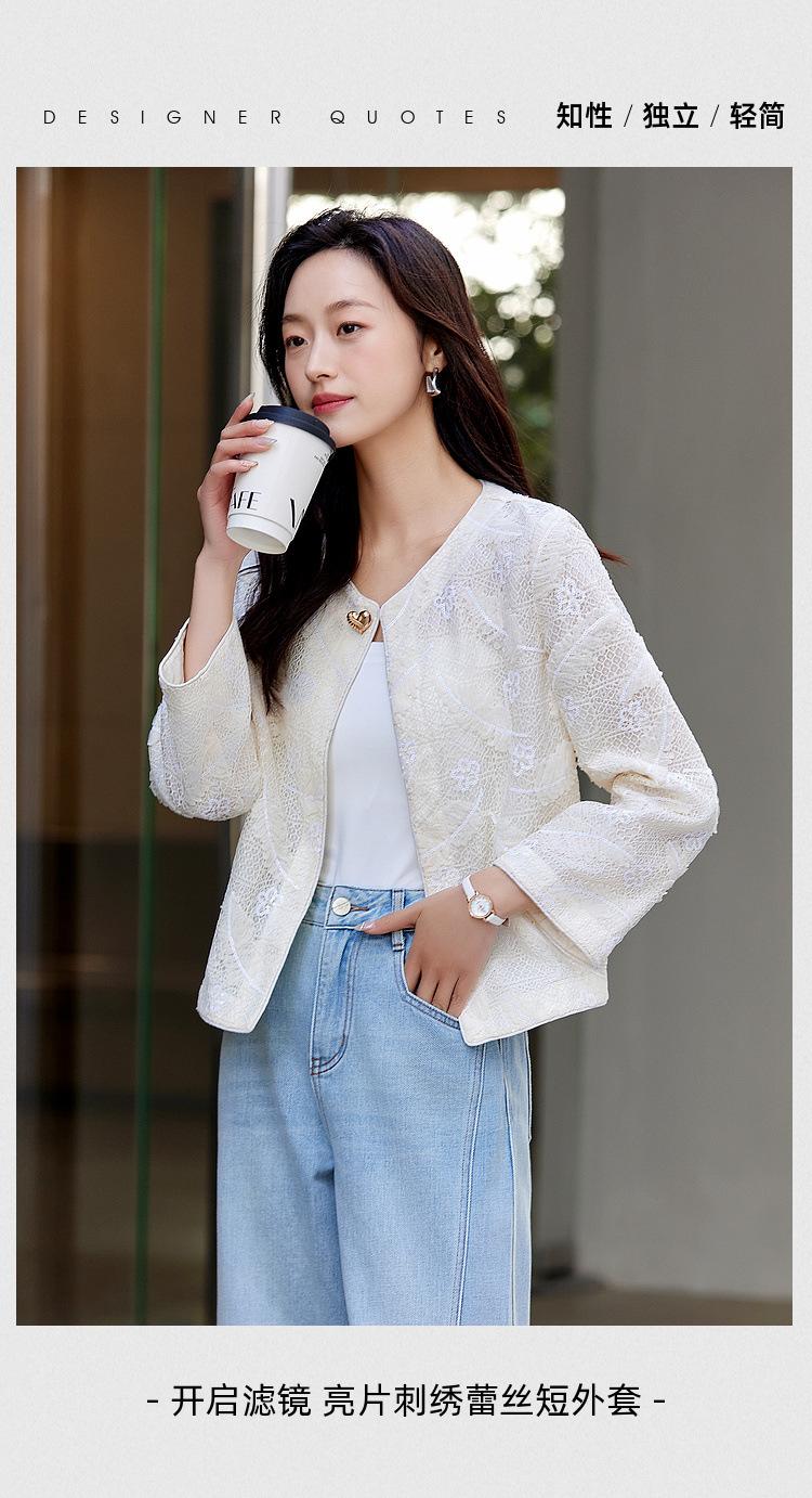 Zhen Xi Nuevo Abrigo Corto Casual Recto de Encaje Bordado con Lentejuelas de Moda para Mujer de Manga Larga y Cuello Redondo CQ531