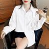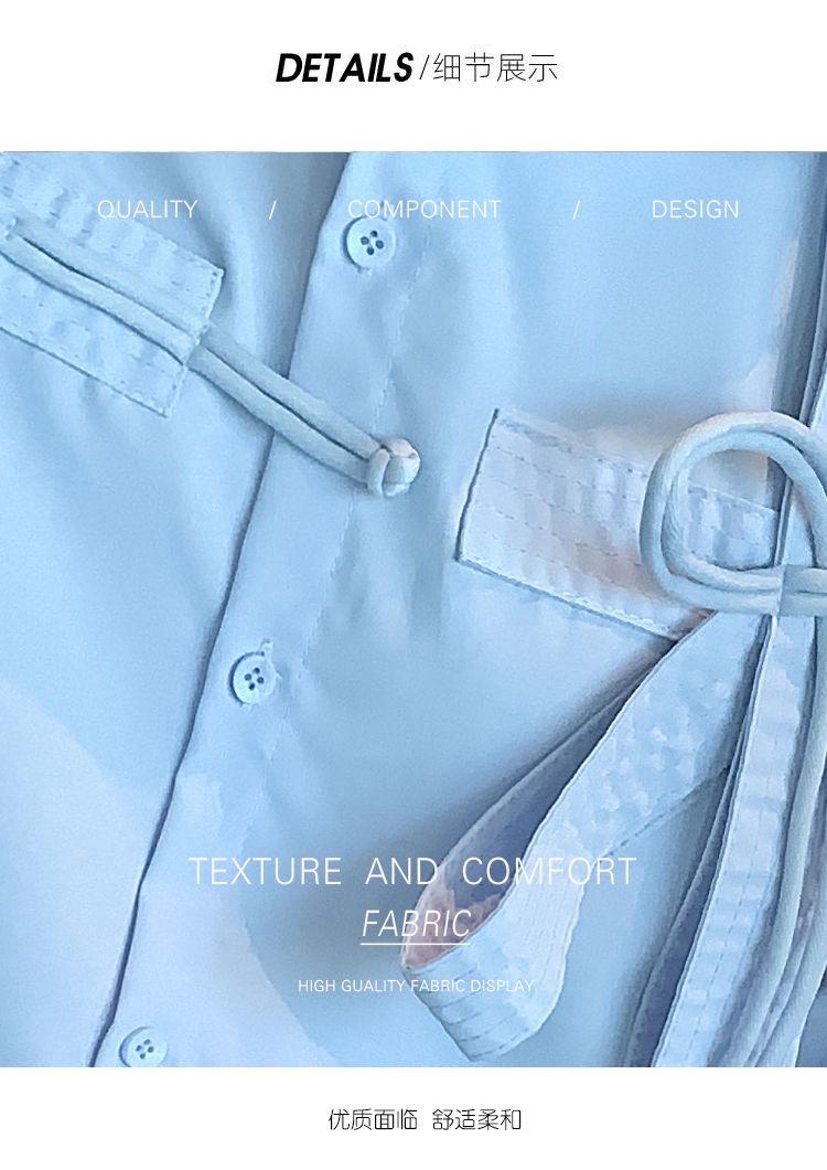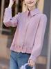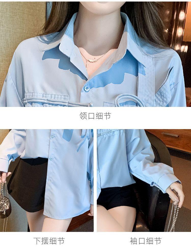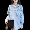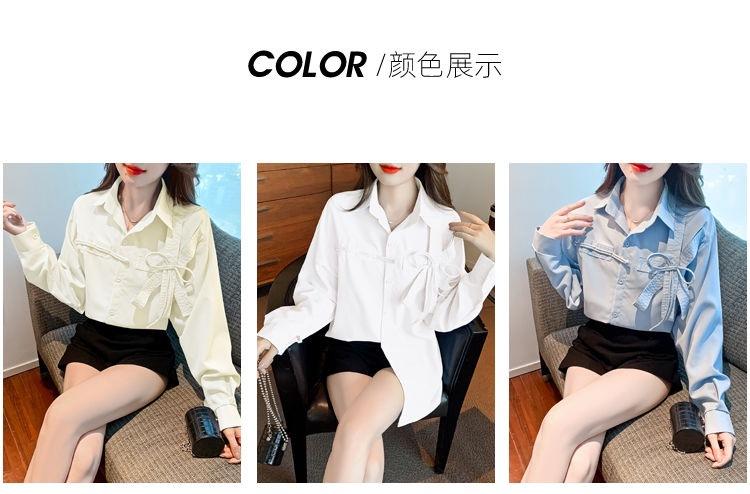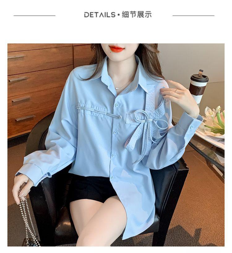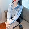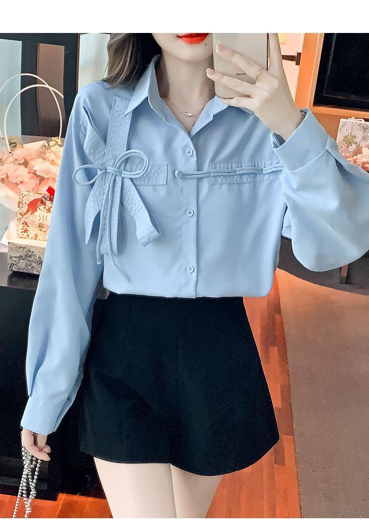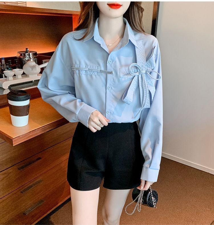 Camisa azul con cuello polo para mujer, diseño Sense, camisa de manga larga con lazo, elegante blusa antiedad para primavera y otoño.