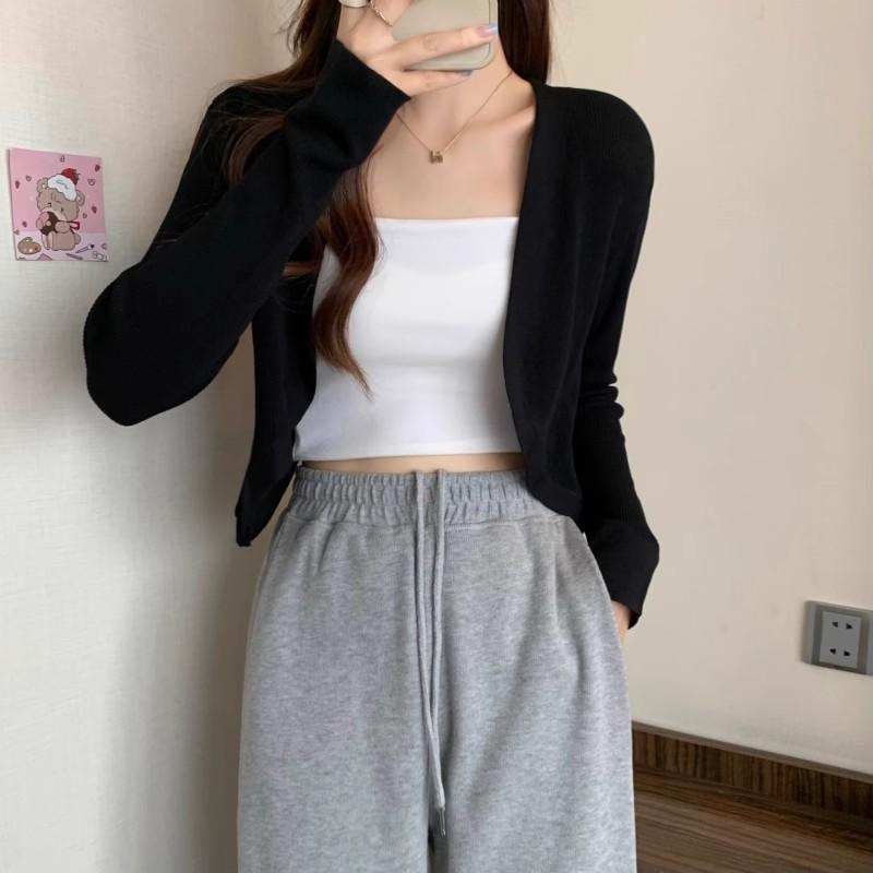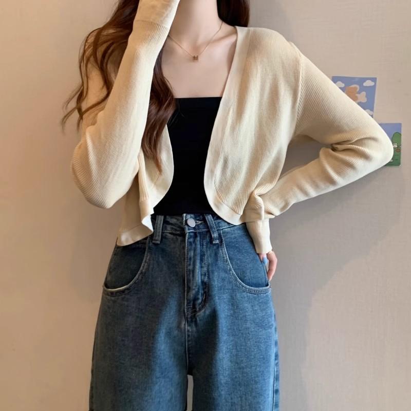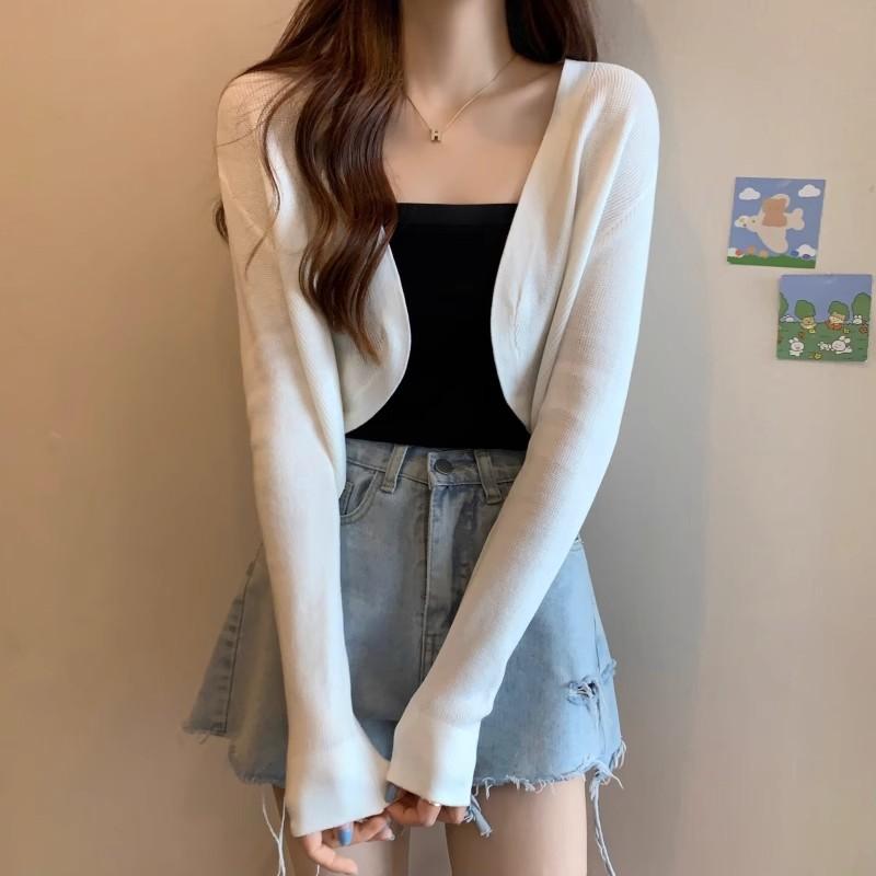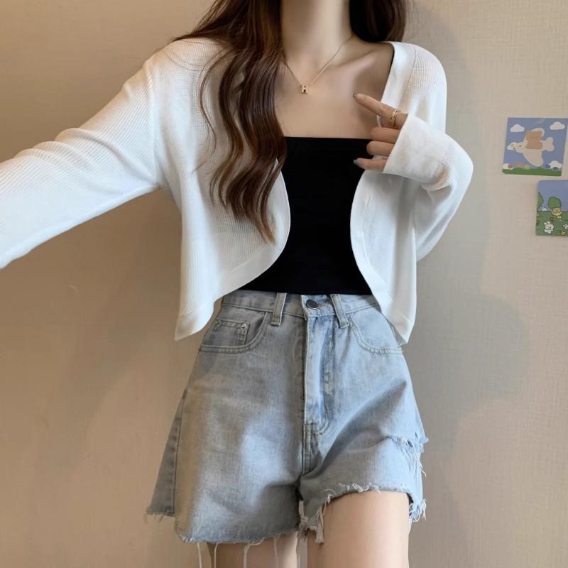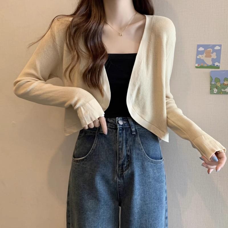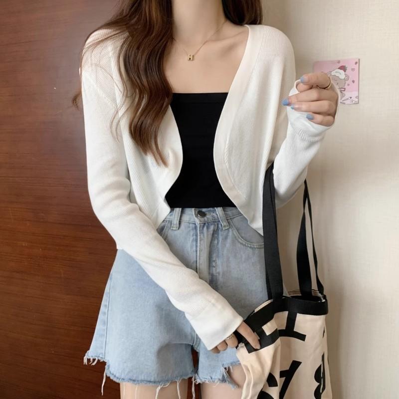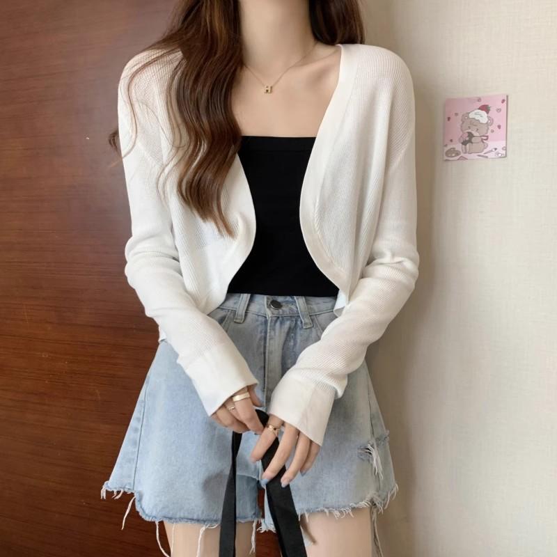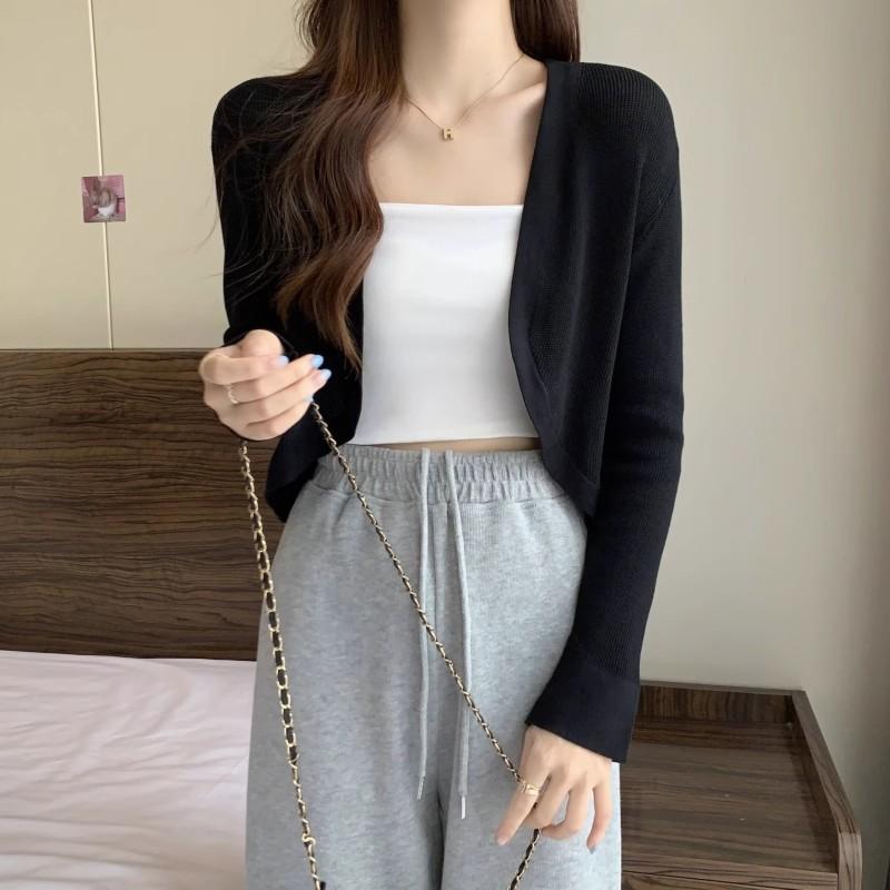 Cárdigan de punto de seda helada de verano para mujer, con protección solar, fino, con tirantes, holgado, exterior, corto, de manga larga, pequeño chaleco.