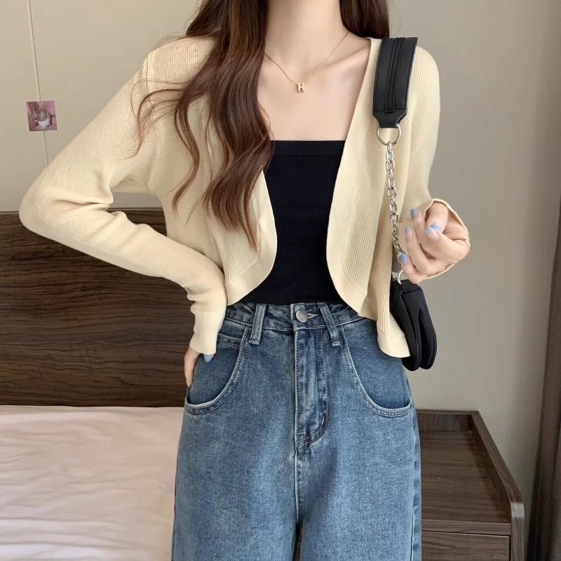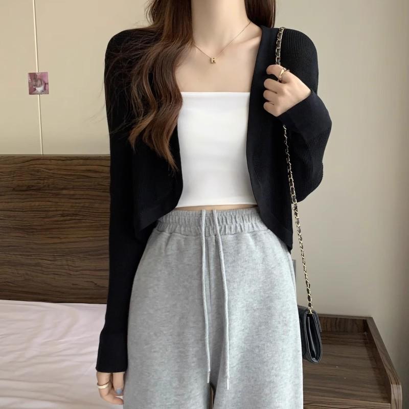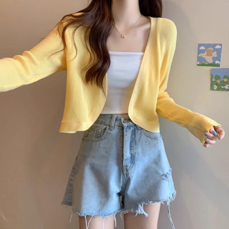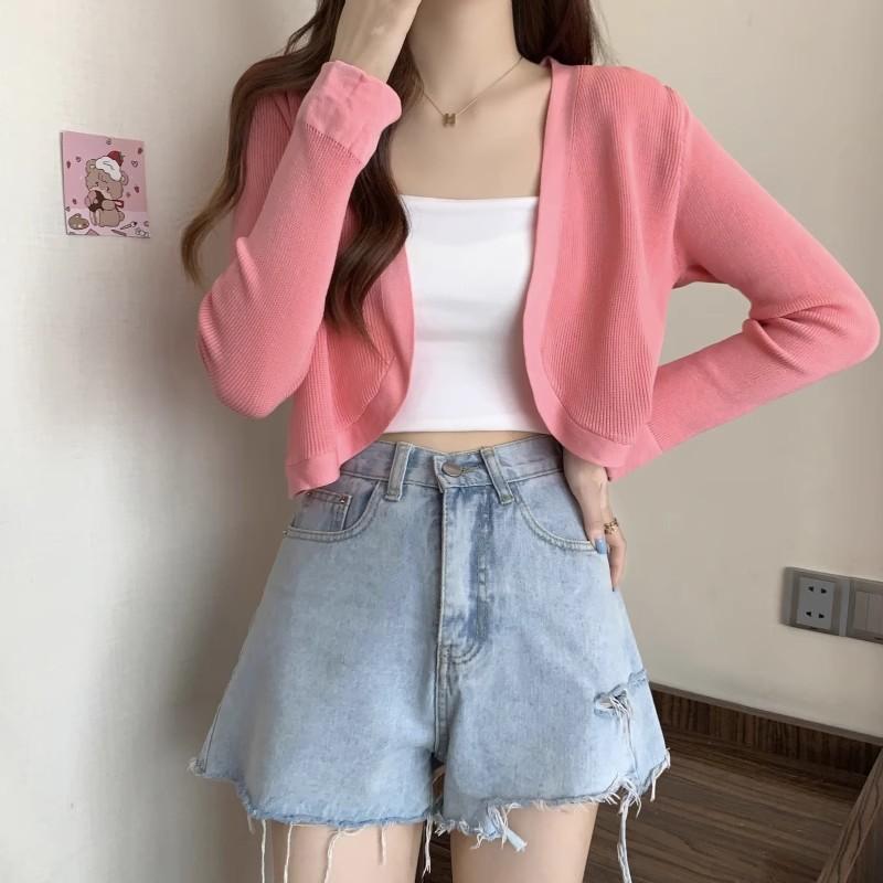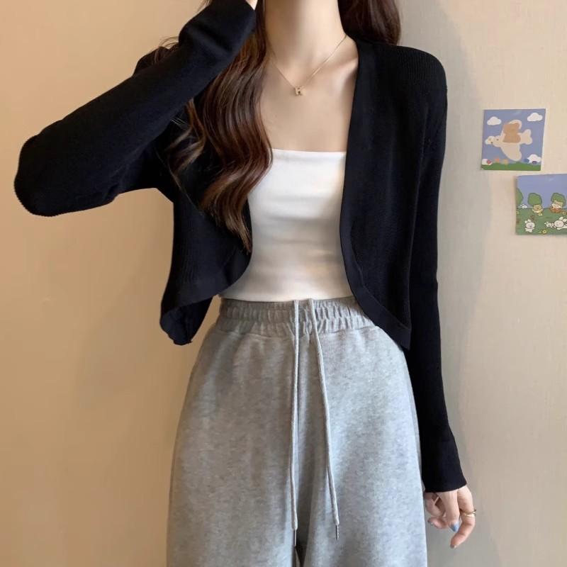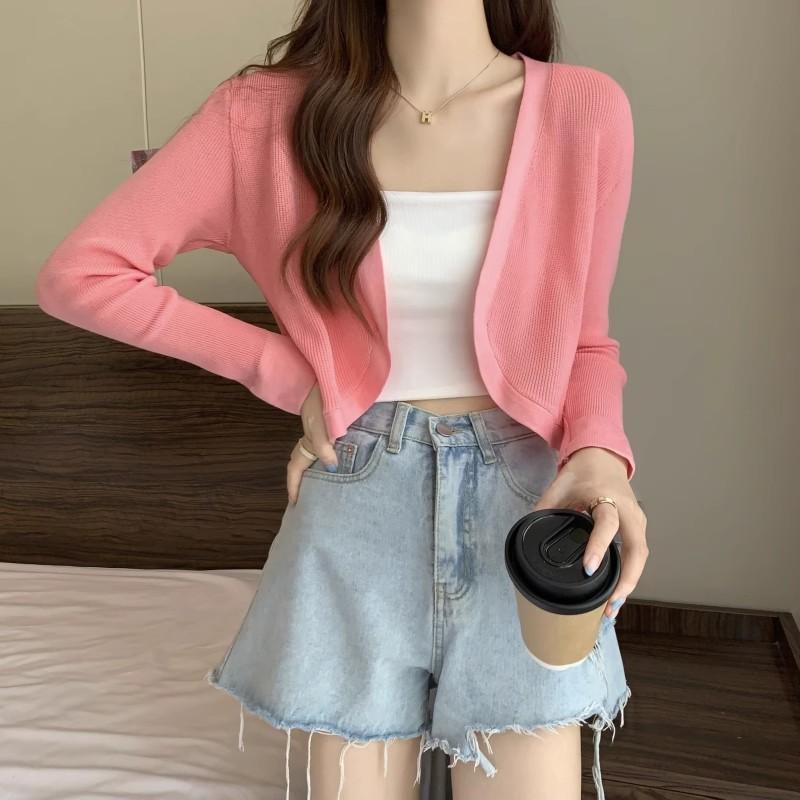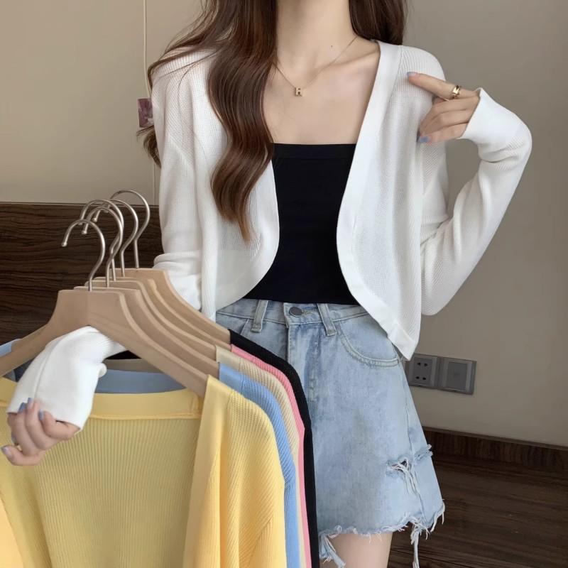 Cárdigan de punto de seda helada de verano para mujer, con protección solar, fino, con tirantes, holgado, exterior, corto, de manga larga, pequeño chaleco.