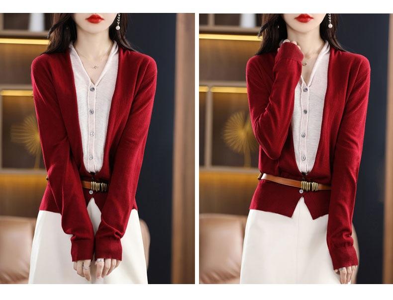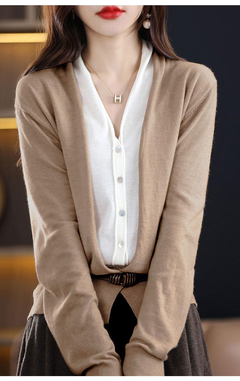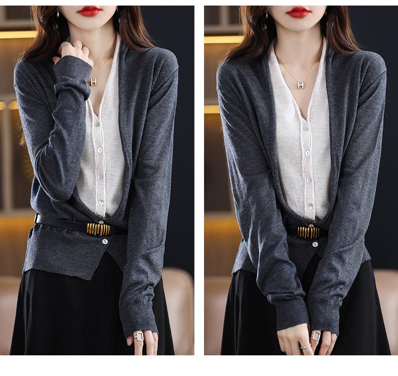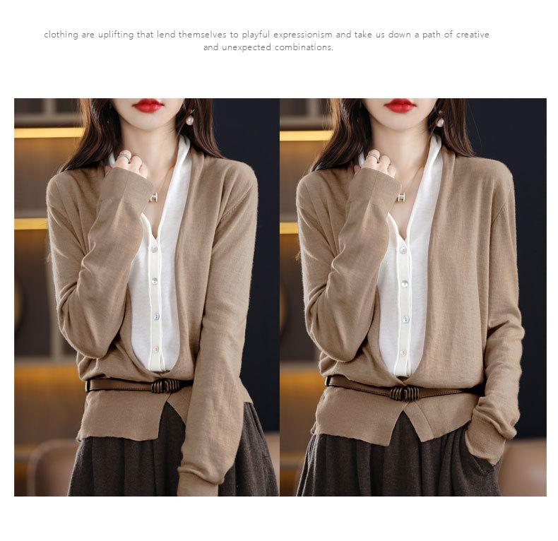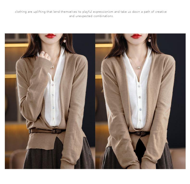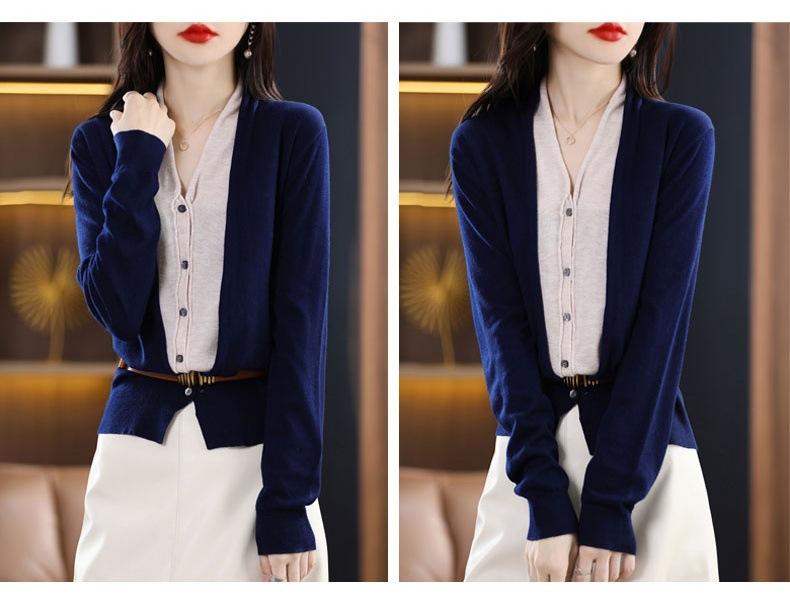 Cárdigan de punto de dos piezas con cuello en V para mujer, suéter elegante corto de punto fino y a la moda para primavera y otoño.
