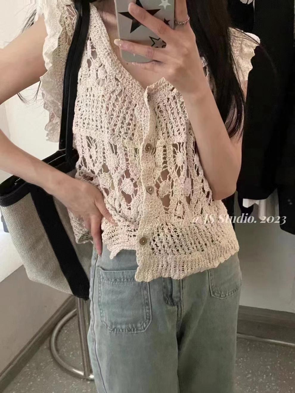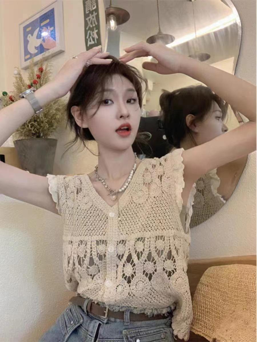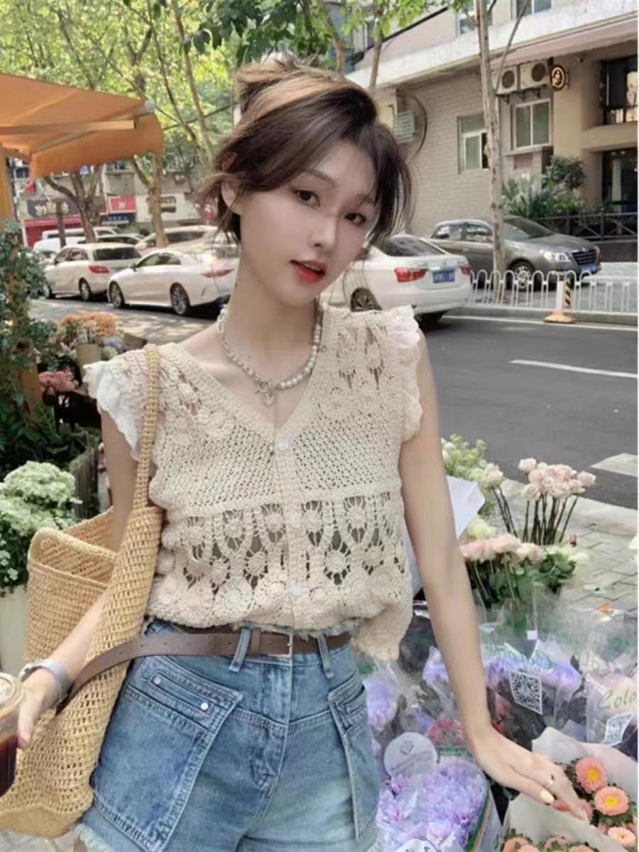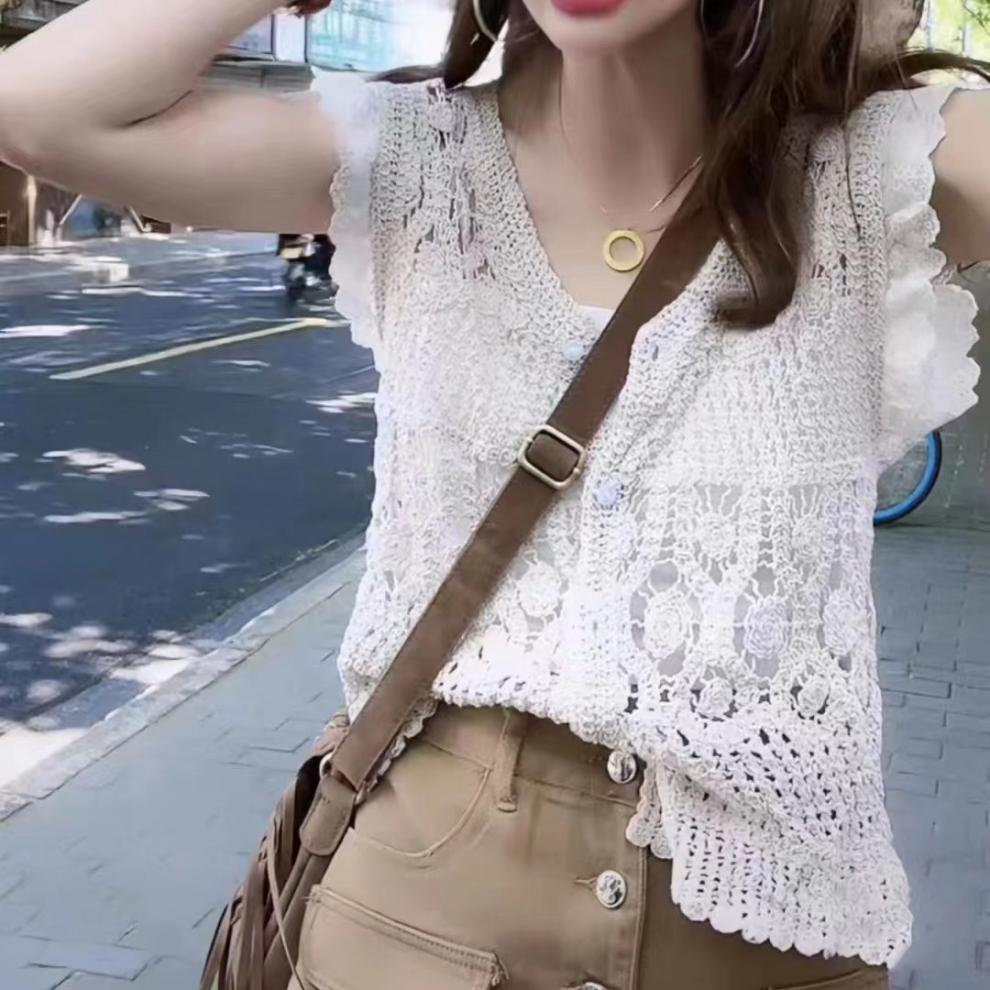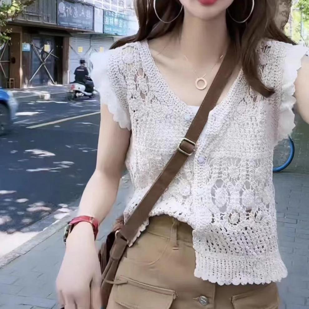 Blusa elegante de estilo coreano con encaje de crochet hueco, cuello en V, botonadura sencilla y mangas voladoras para mujer