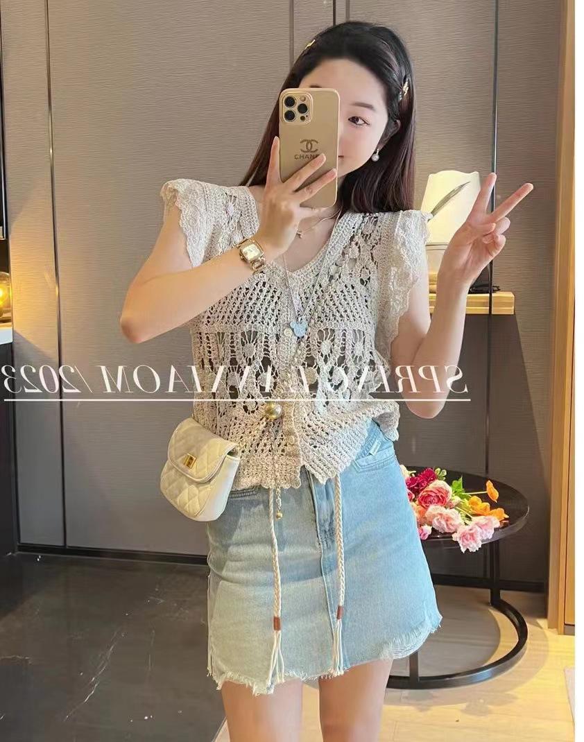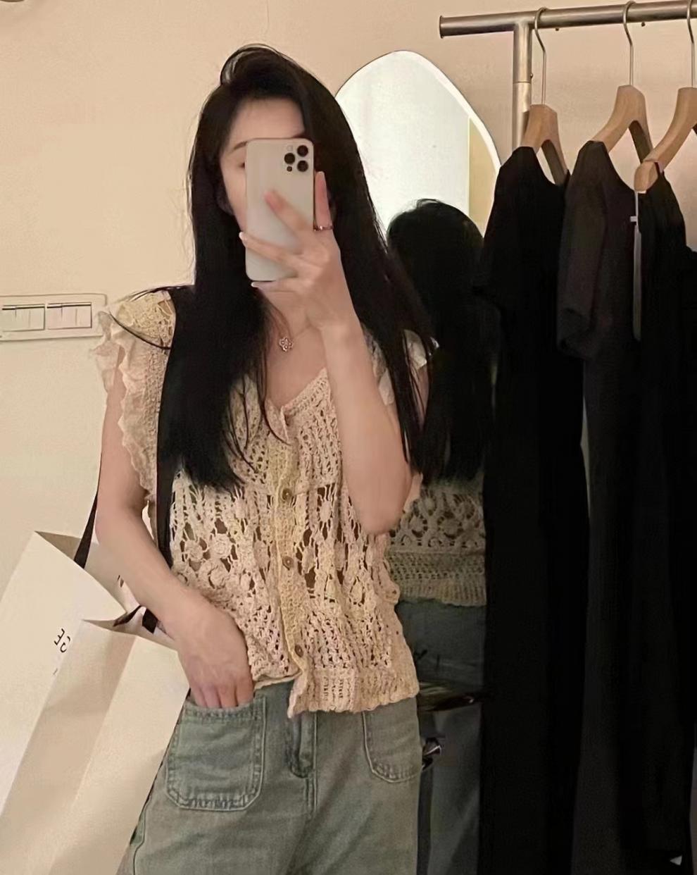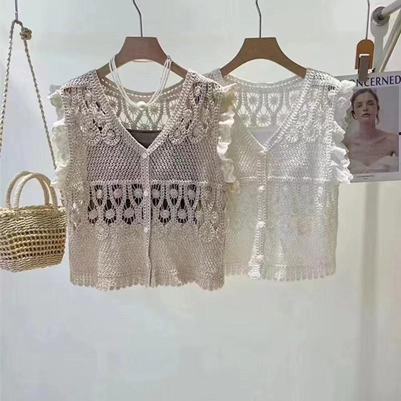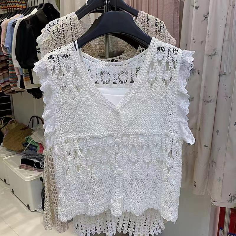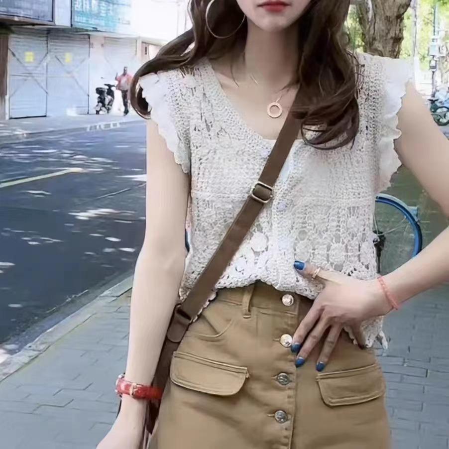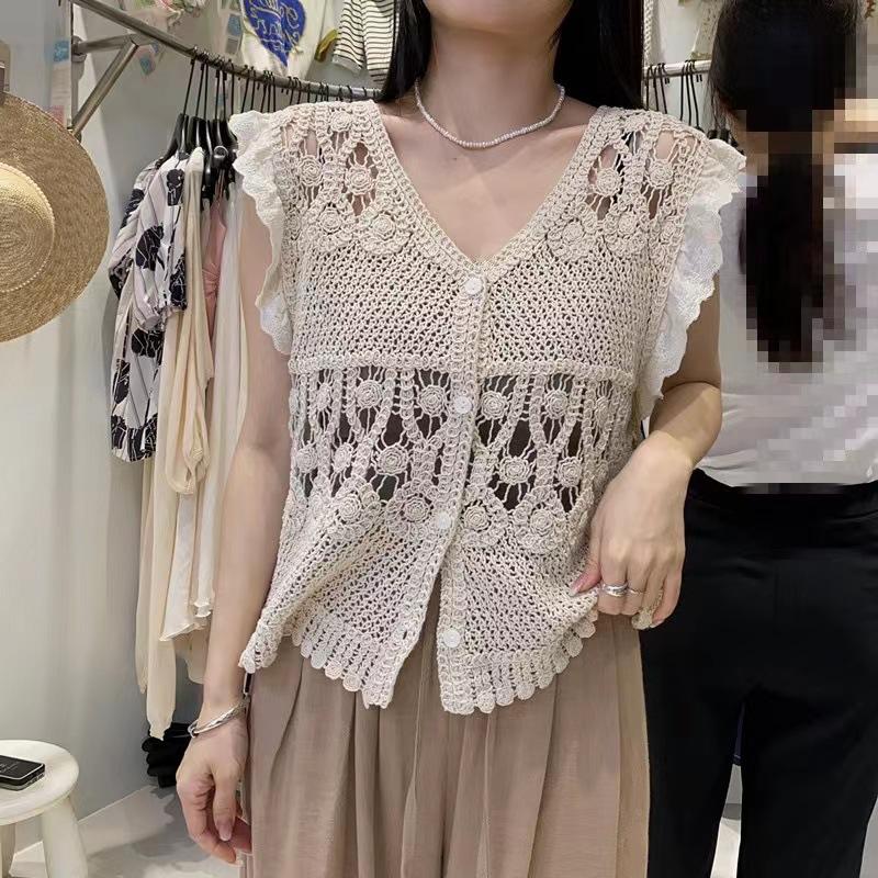 Blusa elegante de estilo coreano con encaje de crochet hueco, cuello en V, botonadura sencilla y mangas voladoras para mujer
