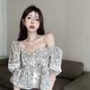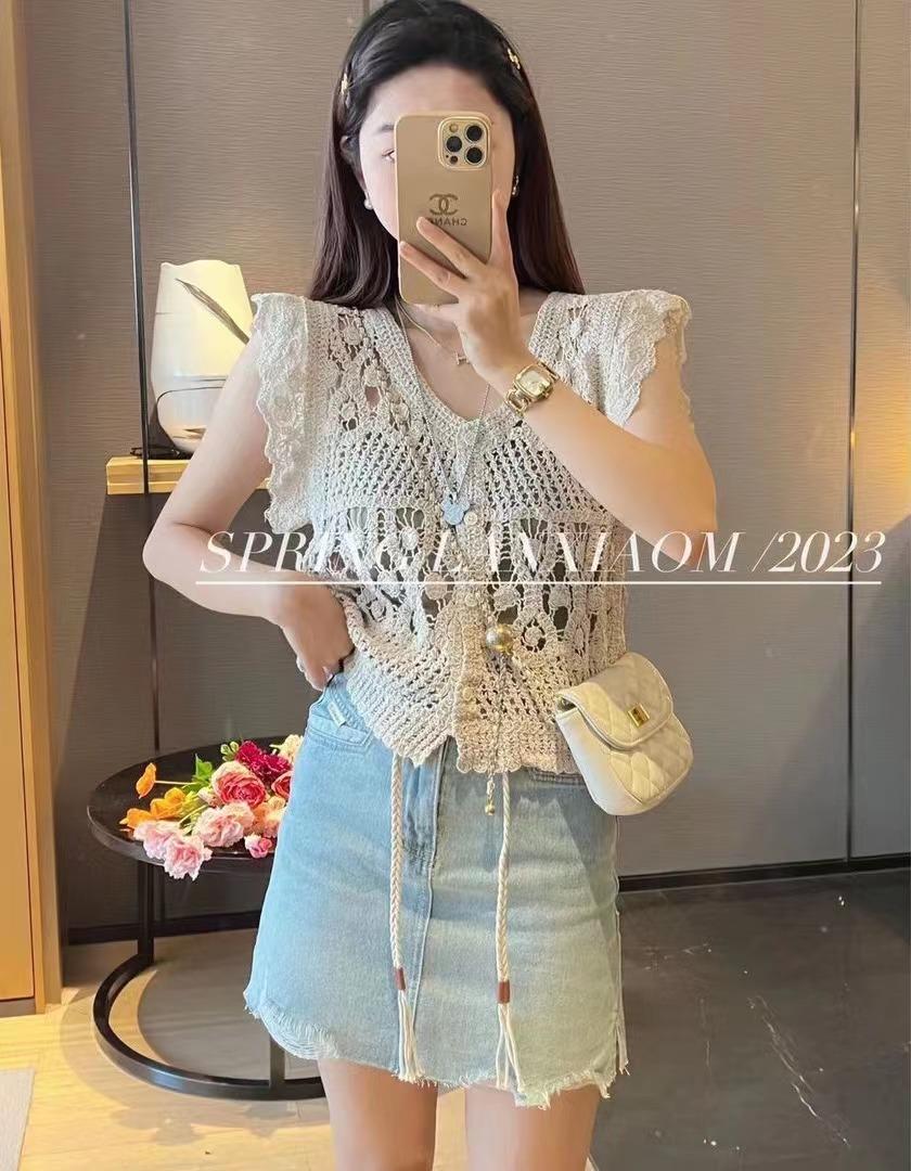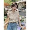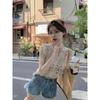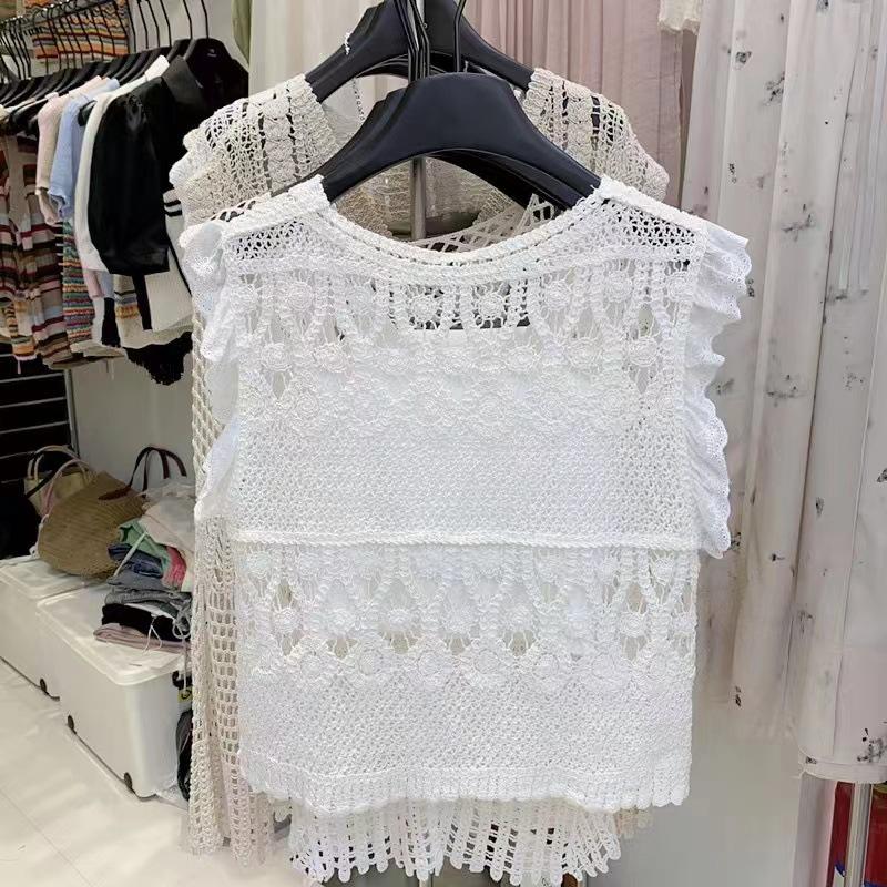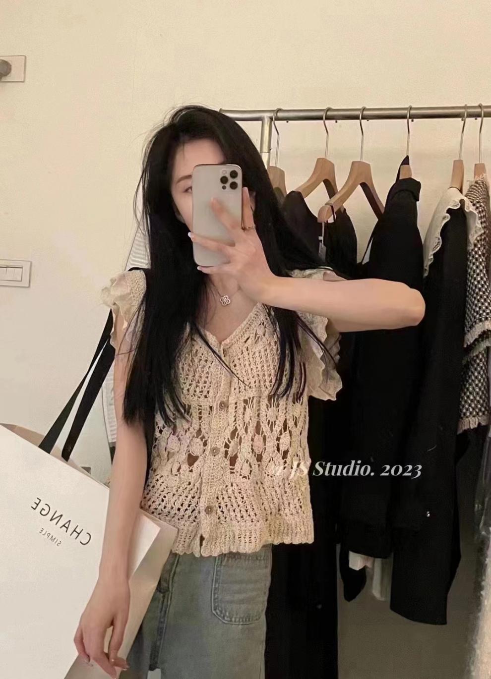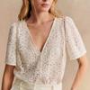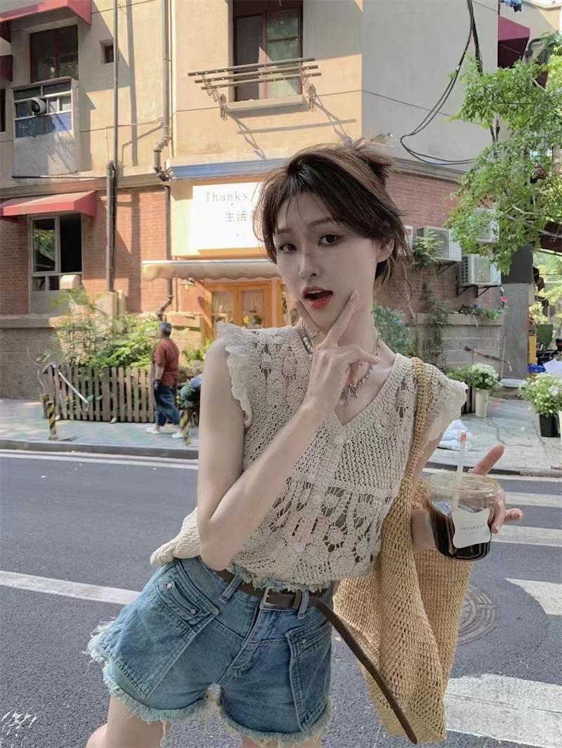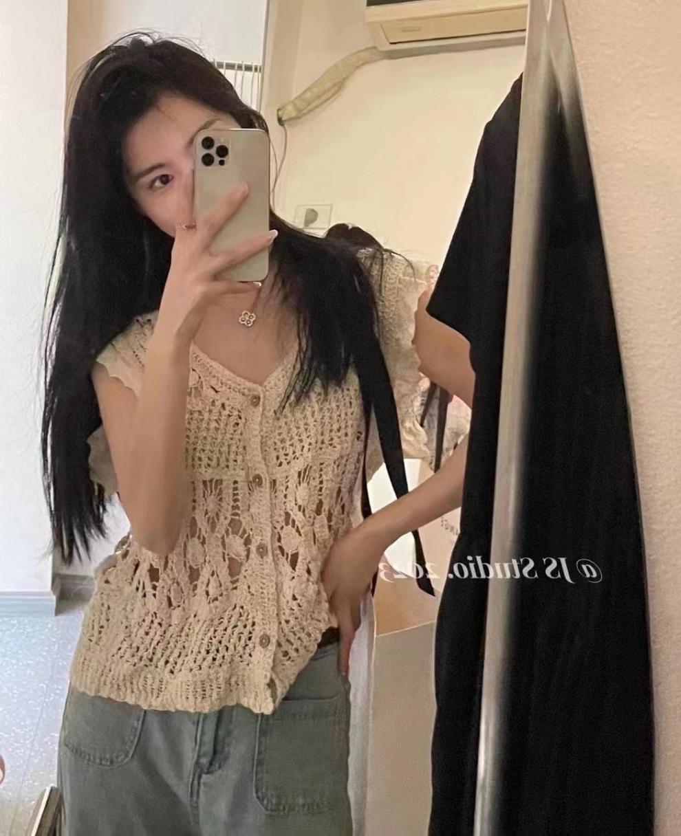 Blusa elegante de estilo coreano con encaje de crochet hueco, cuello en V, botonadura sencilla y mangas voladoras para mujer