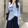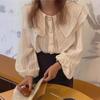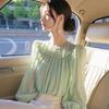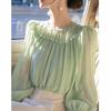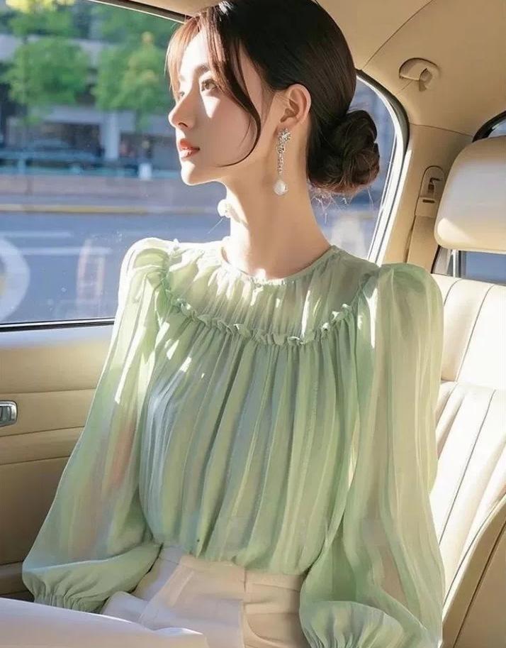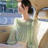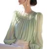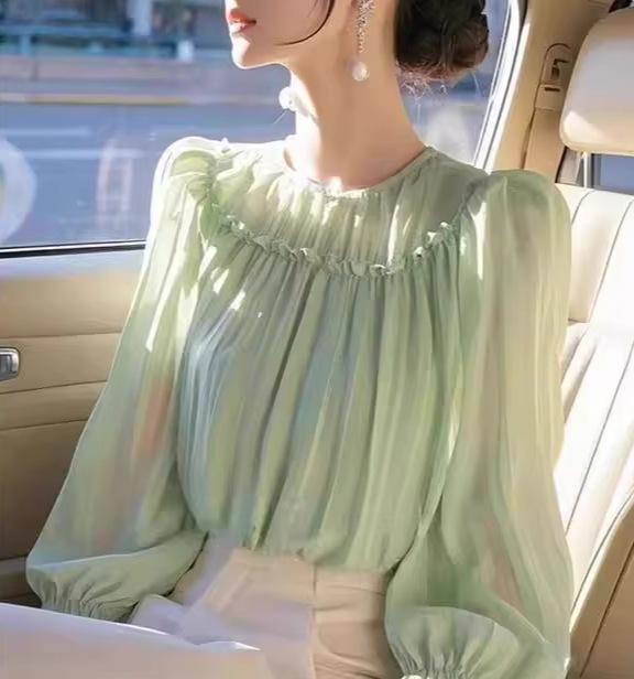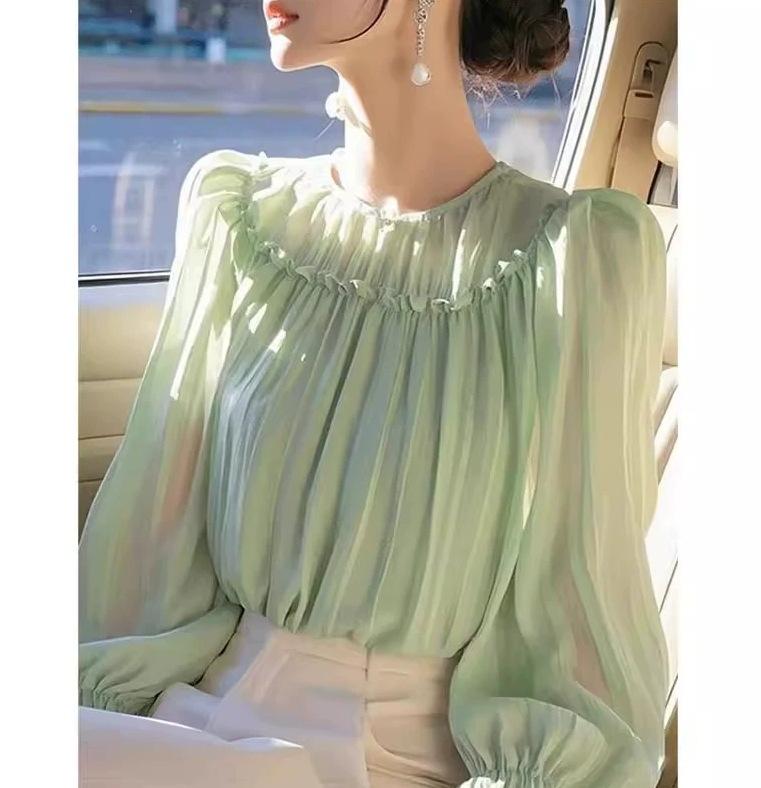 Camisa de manga larga de gasa verde para mujer, de alta gama, ligera, de lujo, antiedad, estilo occidental, estilo coreano, estilo único y chic.