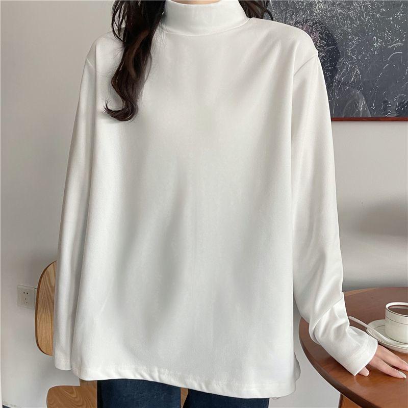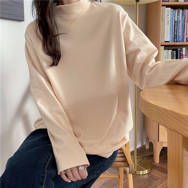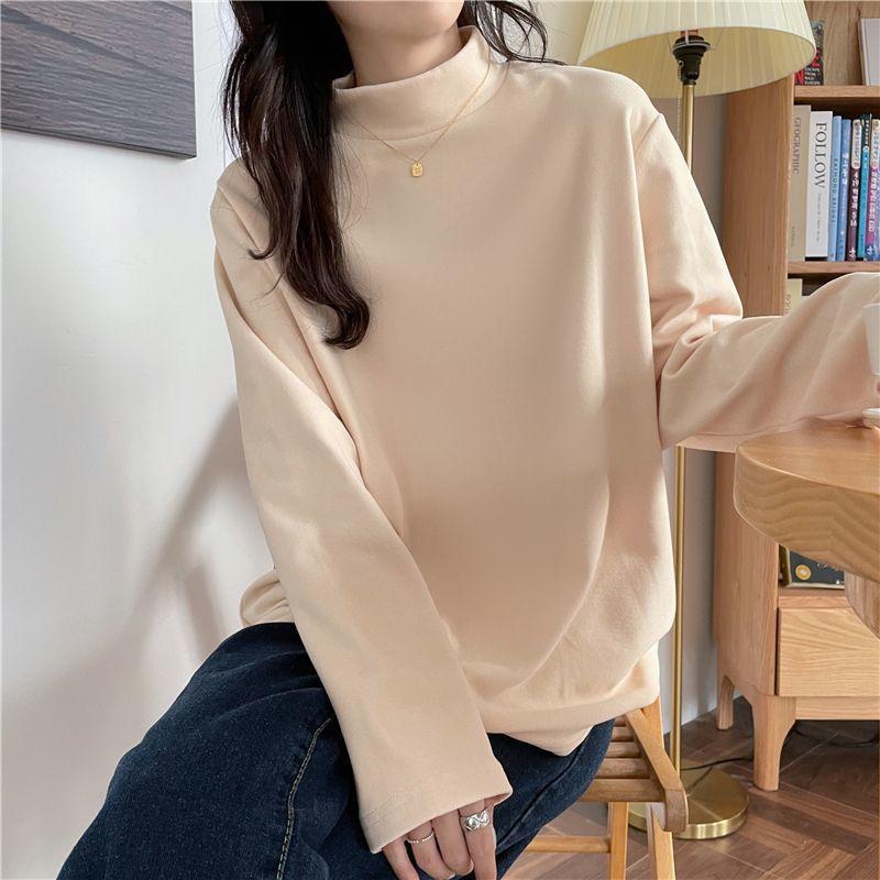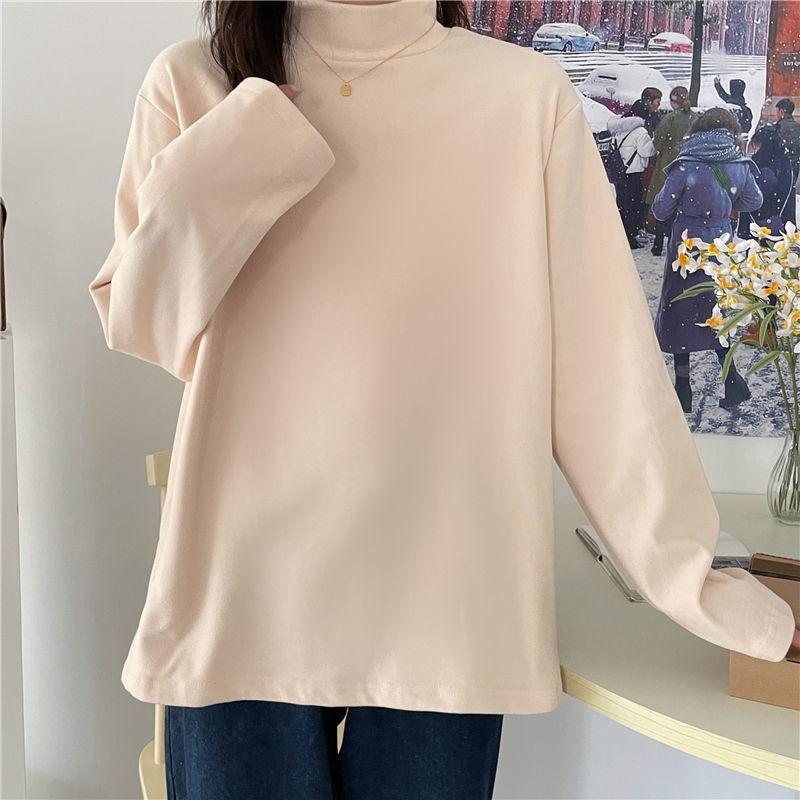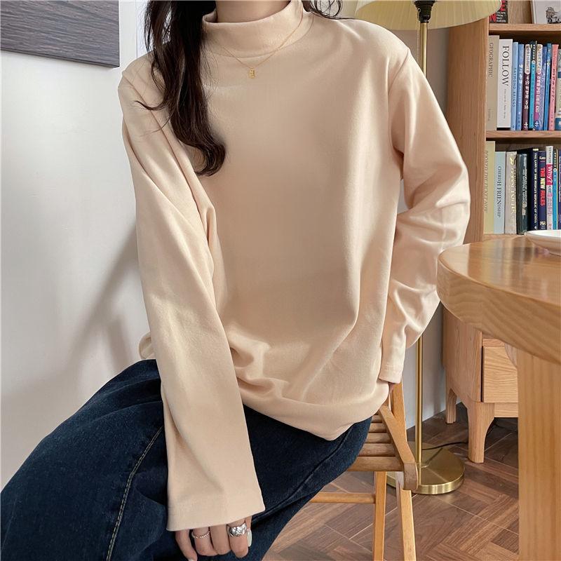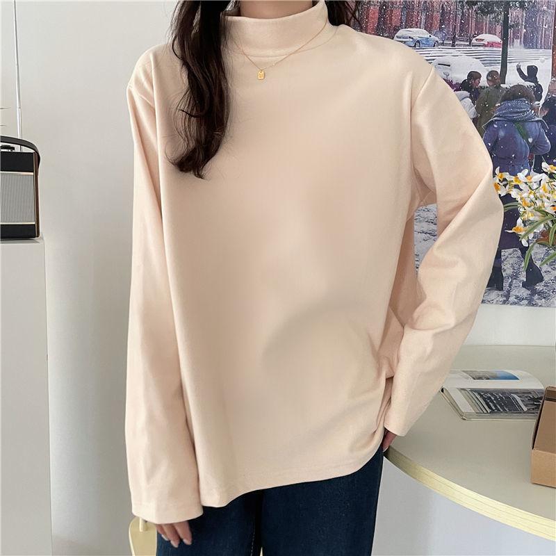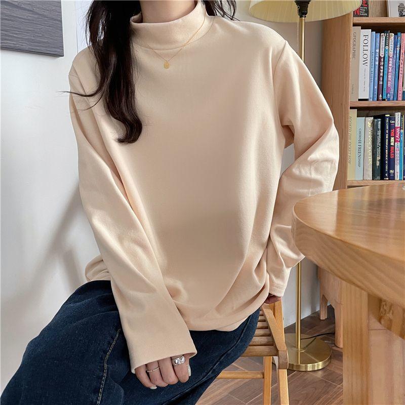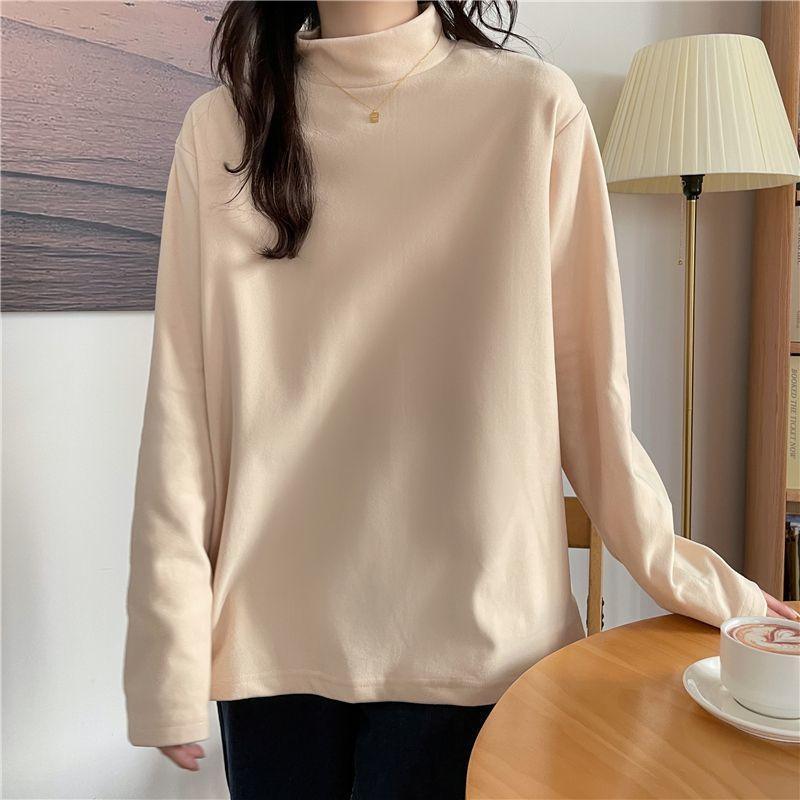 Camiseta básica con forro polar de color crema para otoño e invierno, camiseta de cuello alto para mujer, camiseta interior de manga larga para estudiantes, camiseta cálida para mujer