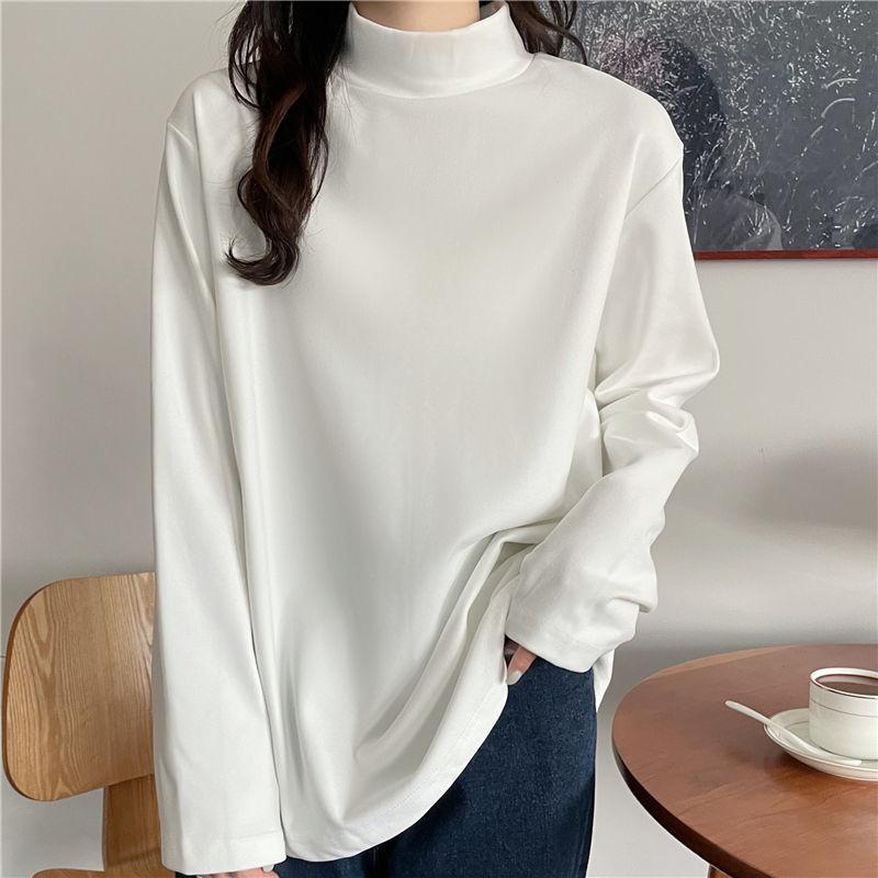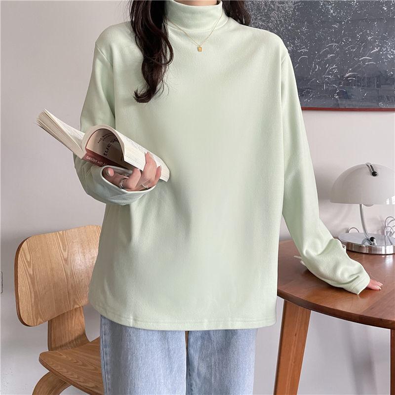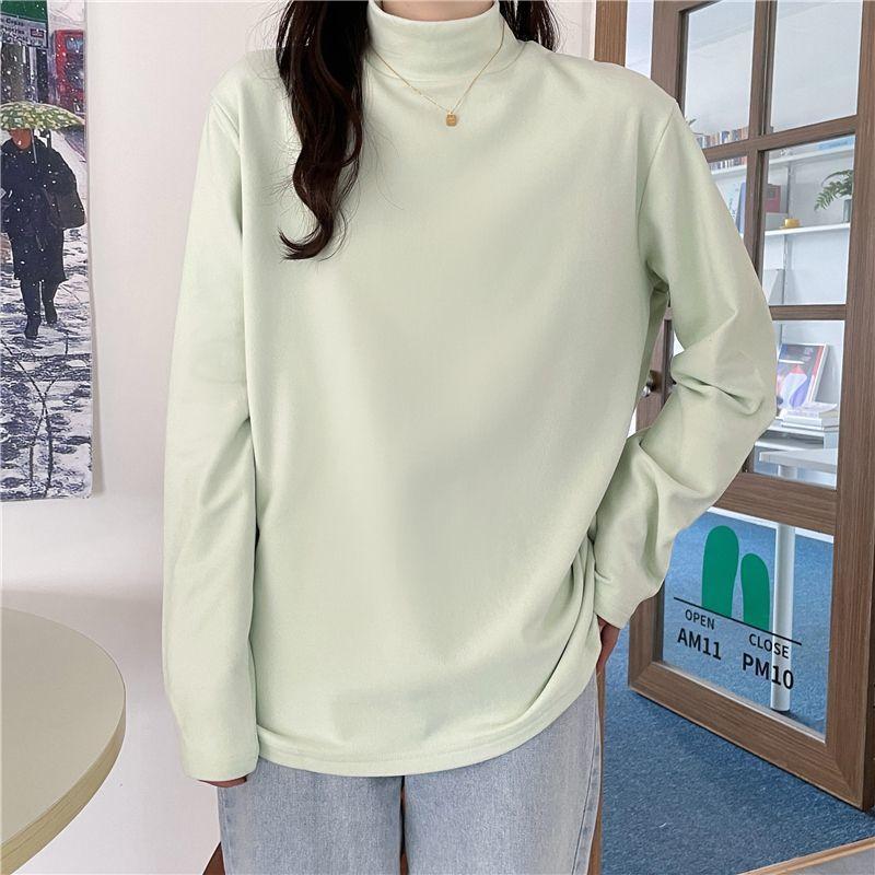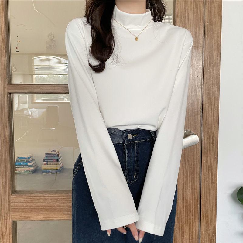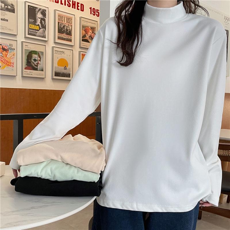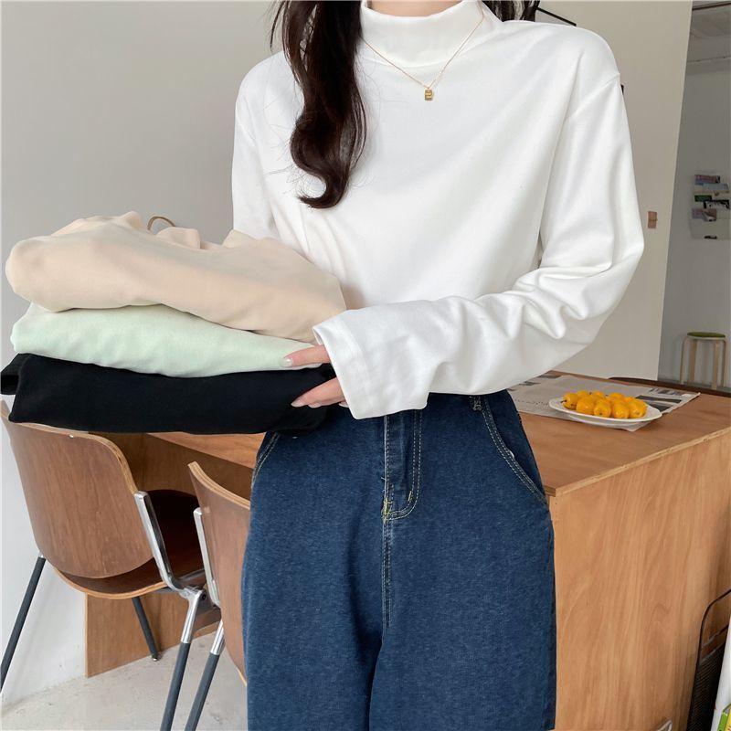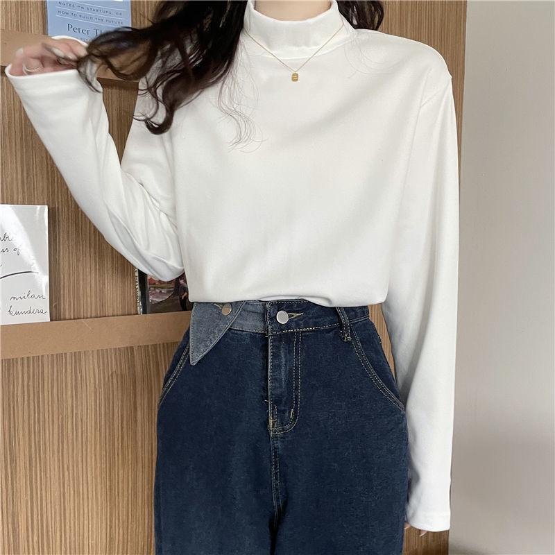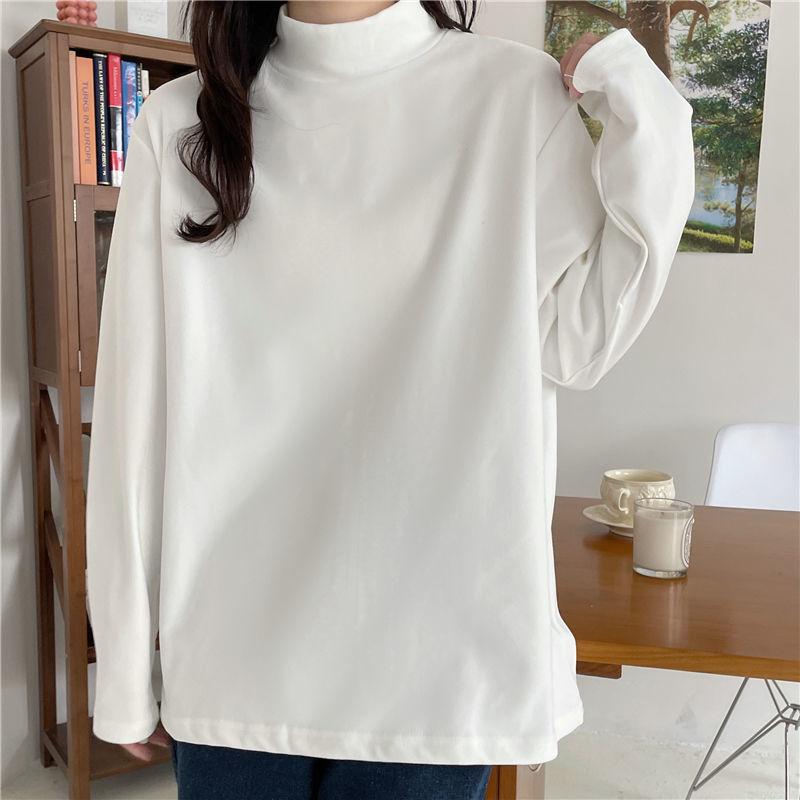 Camiseta básica con forro polar de color crema para otoño e invierno, camiseta de cuello alto para mujer, camiseta interior de manga larga para estudiantes, camiseta cálida para mujer