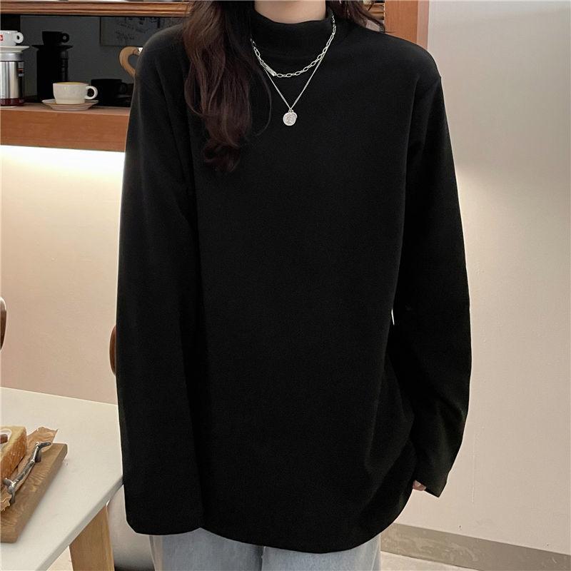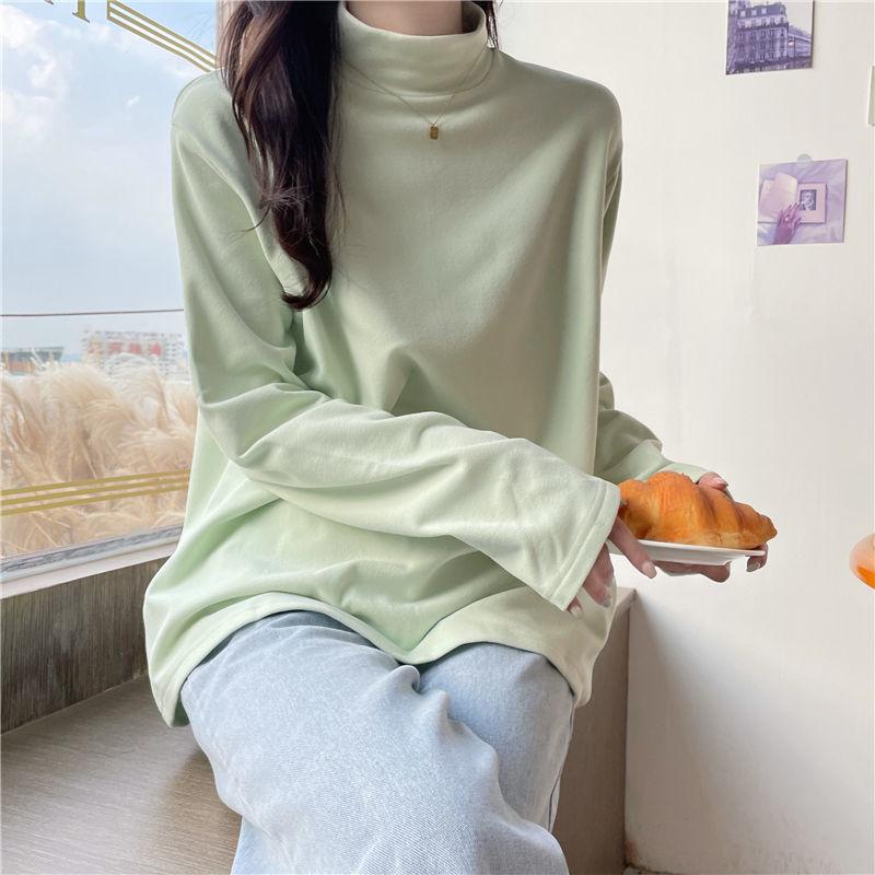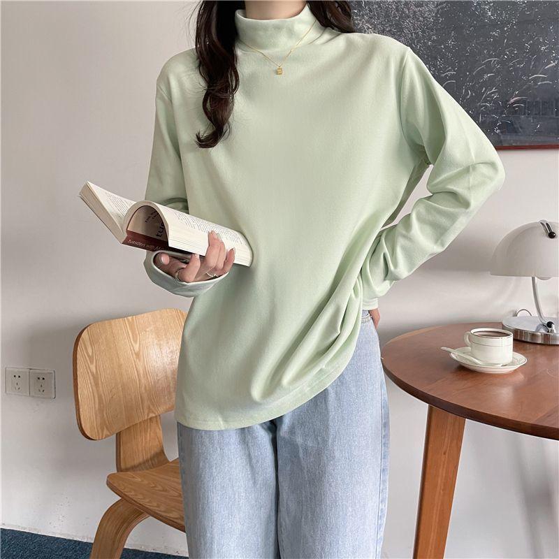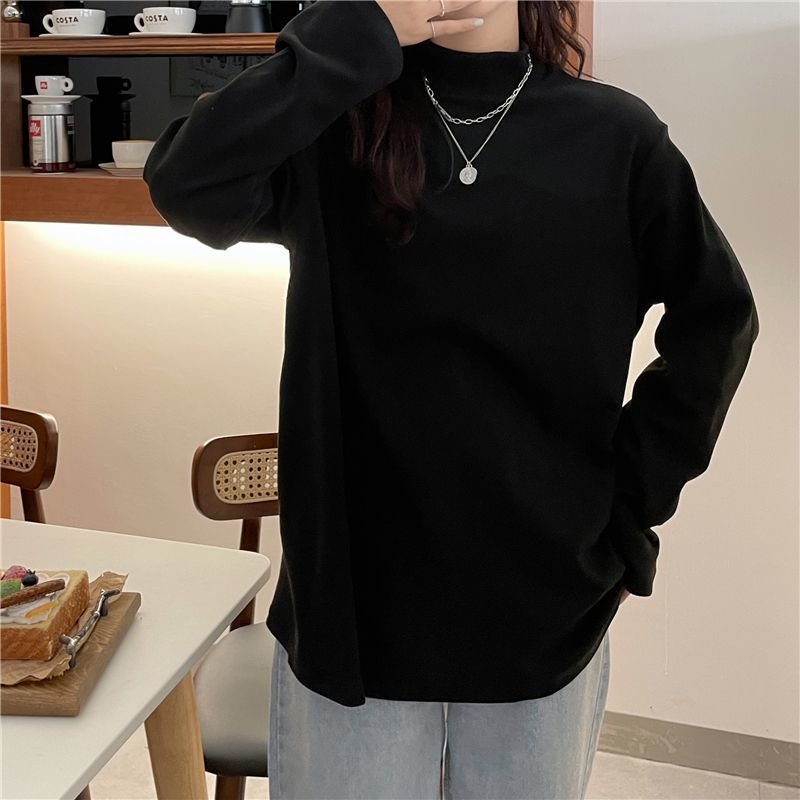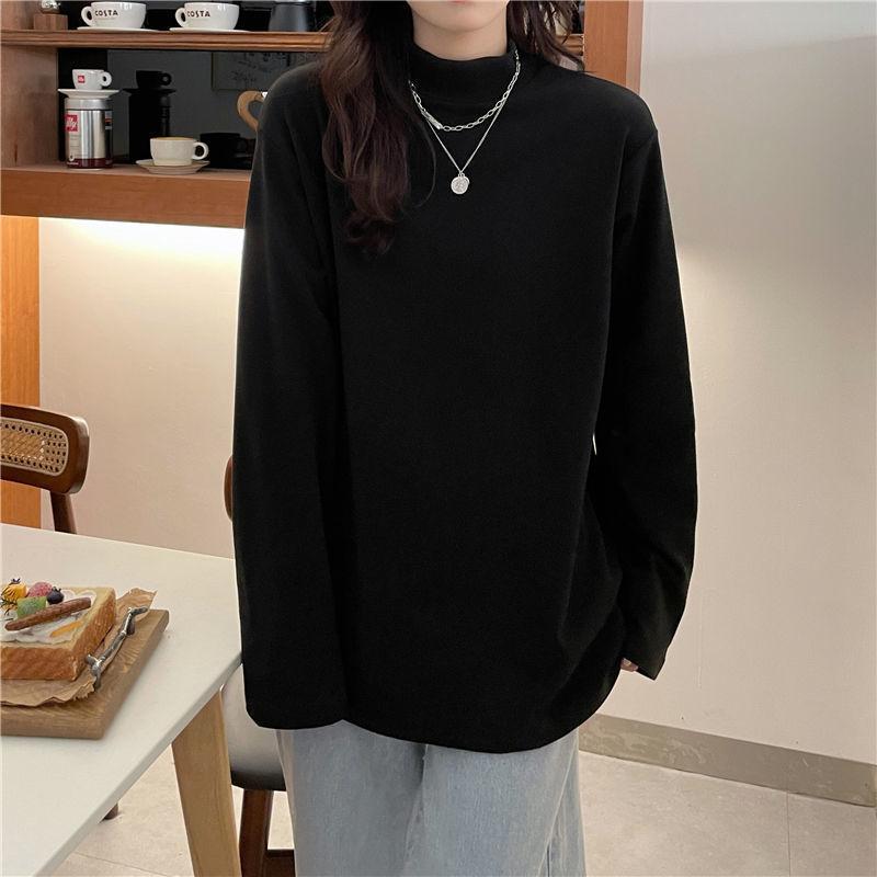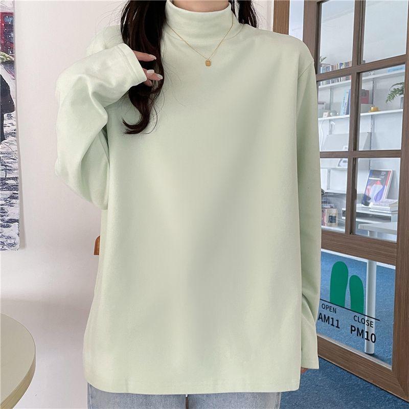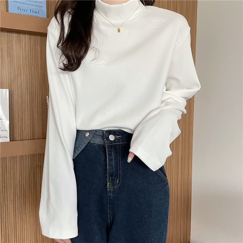 Camiseta básica con forro polar de color crema para otoño e invierno, camiseta de cuello alto para mujer, camiseta interior de manga larga para estudiantes, camiseta cálida para mujer