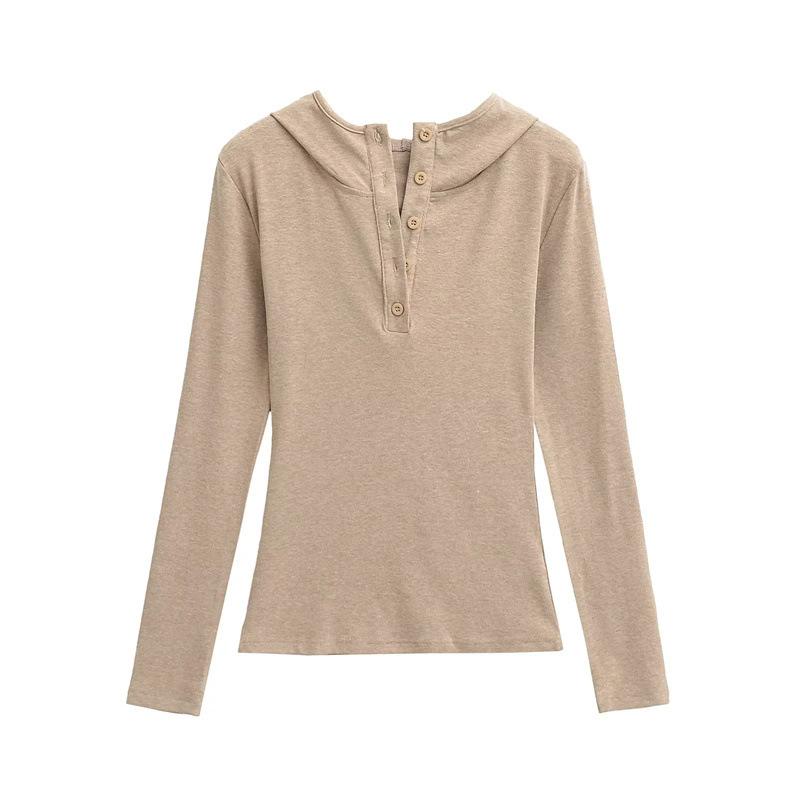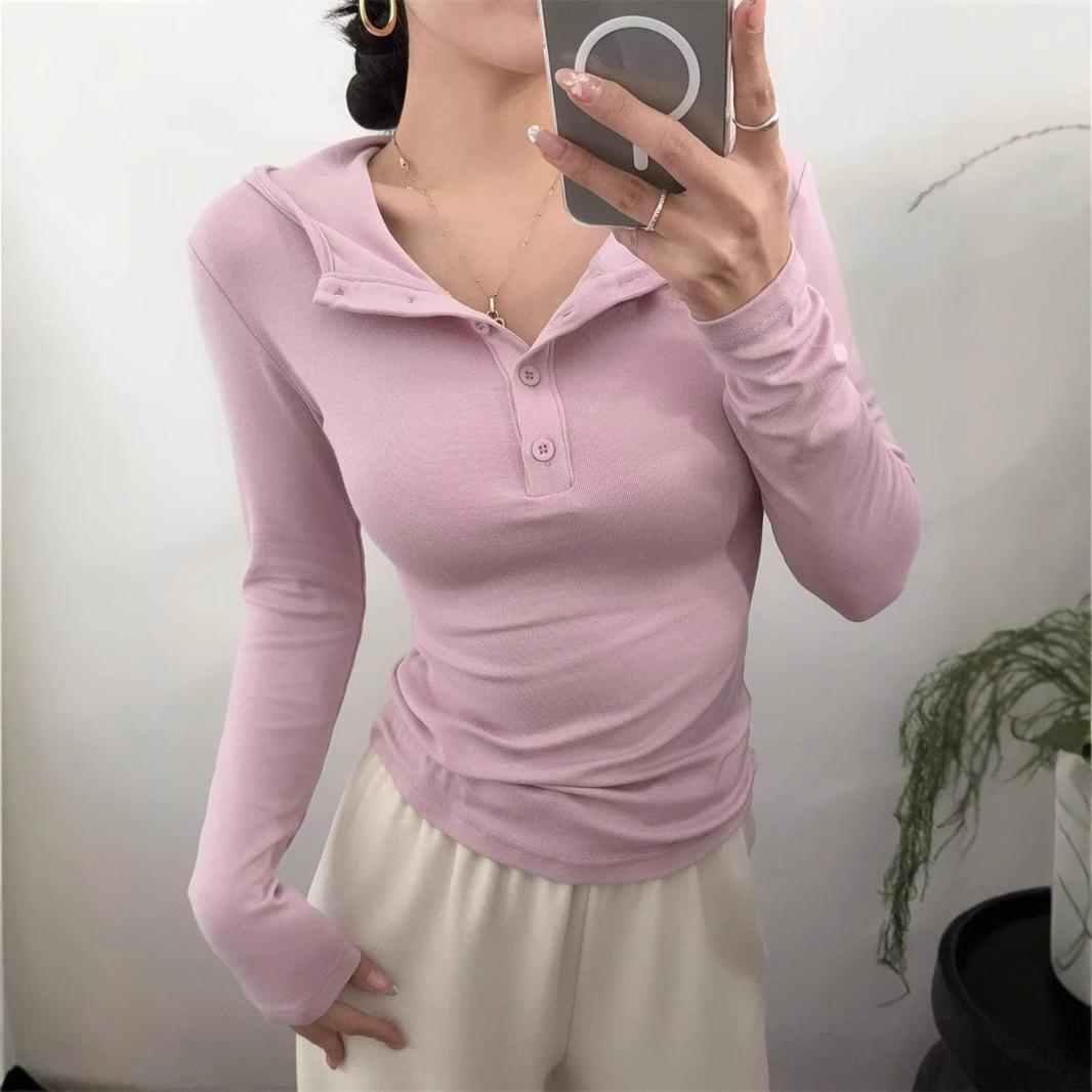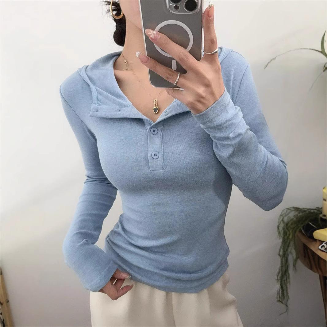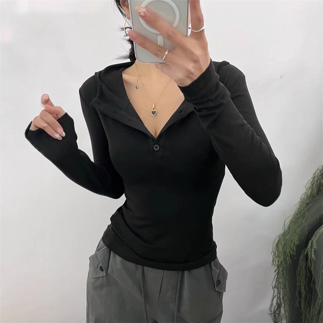 Camiseta de manga larga con botones y capucha estilo Pure Desire, nueva moda de primavera 2025, top informal de Spice Girl ajustado y combinable para mujer
