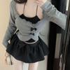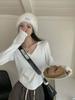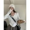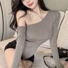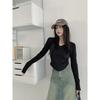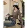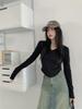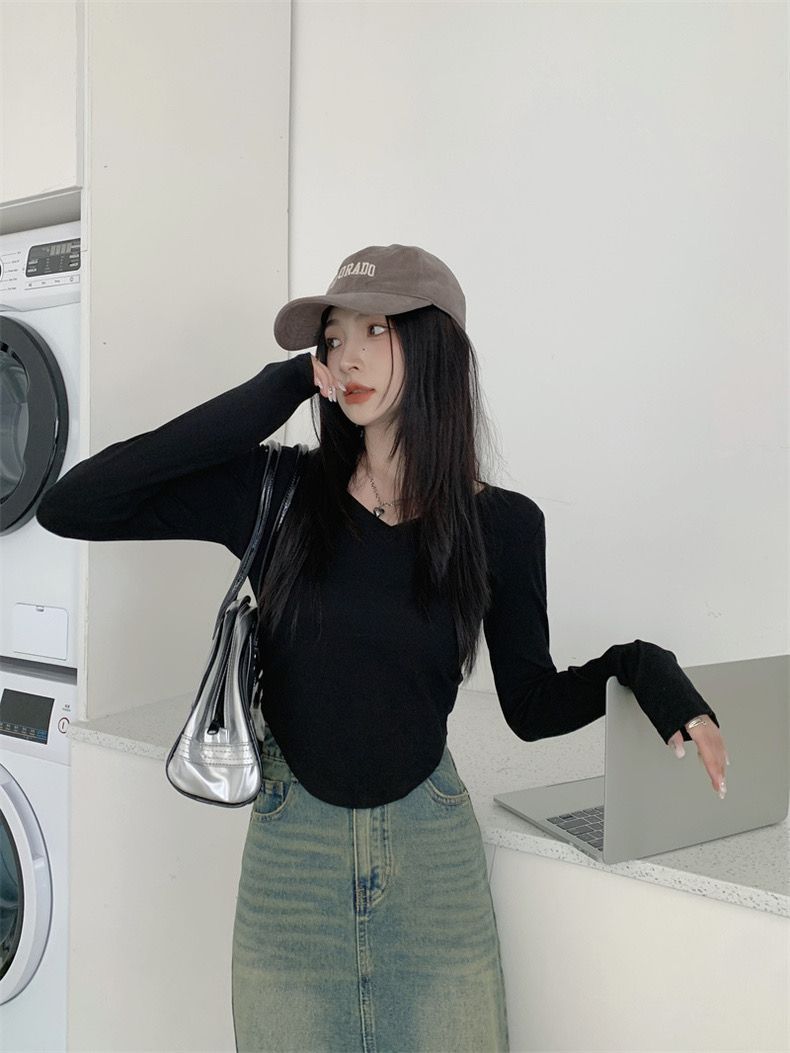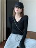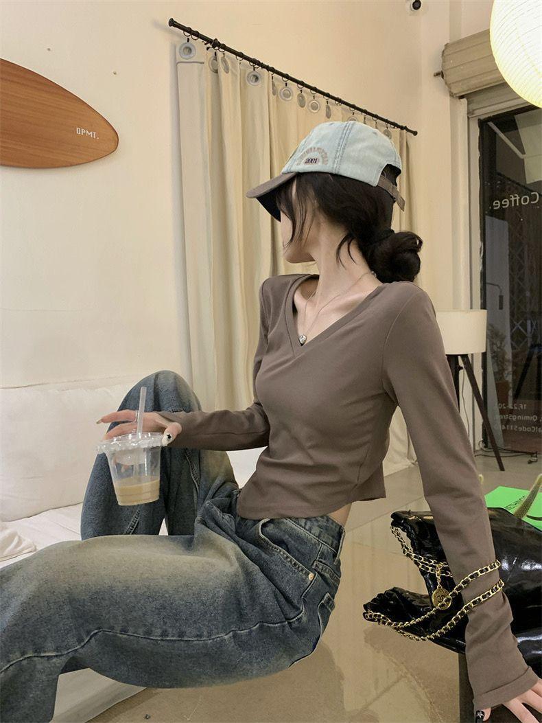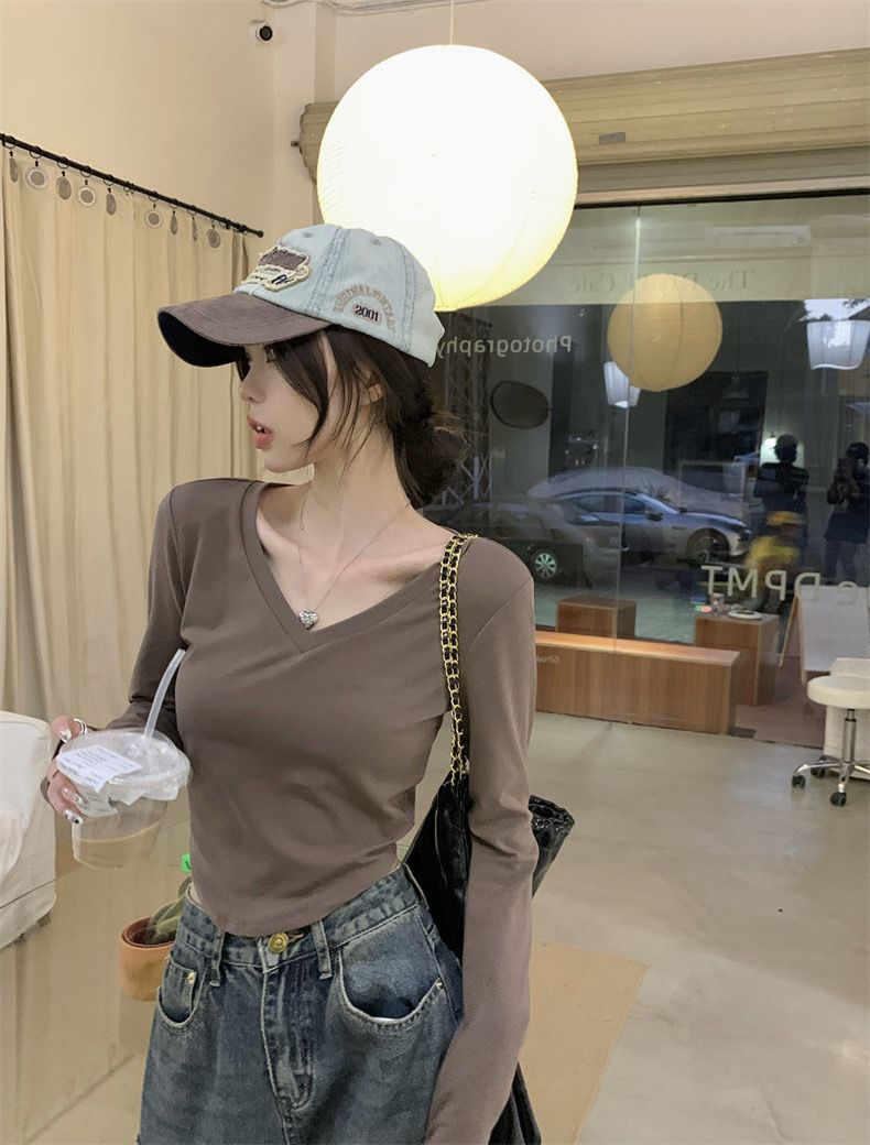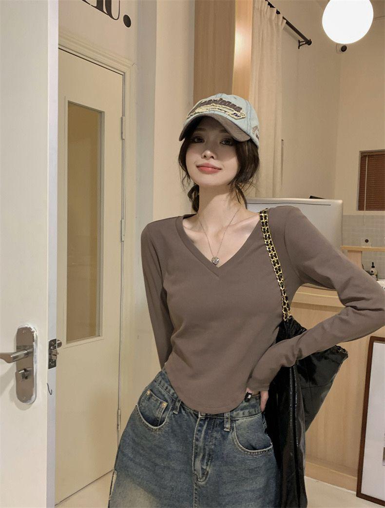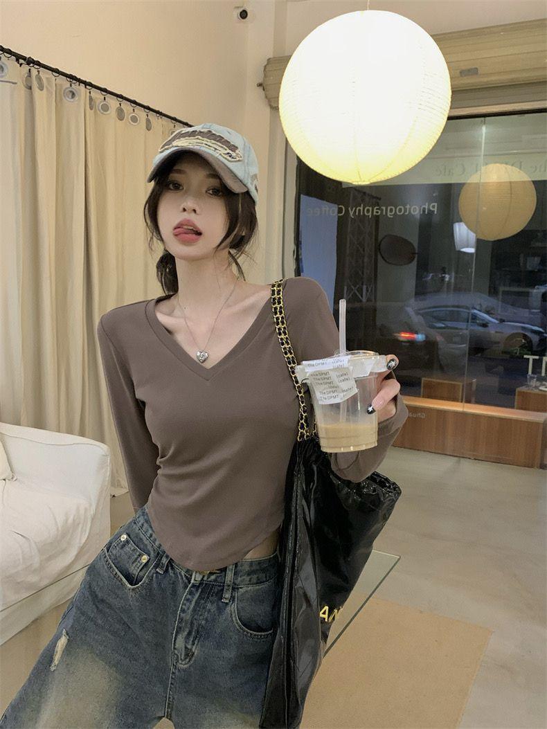 Otoño Spice Girls Sexy Ajustado Adelgazante Irregular Cuello en V Manga Larga Camiseta Cintura Pequeña Deseo Puro Top Ins