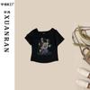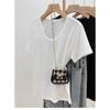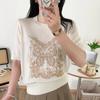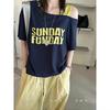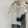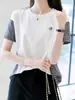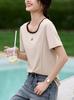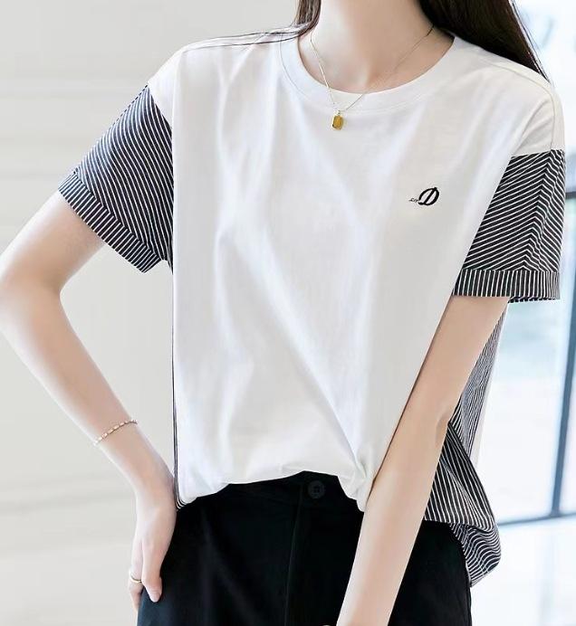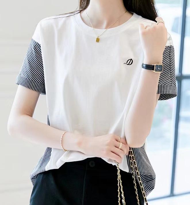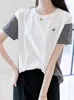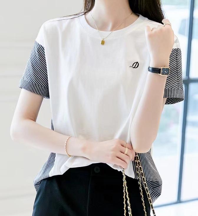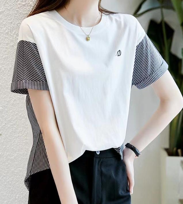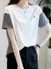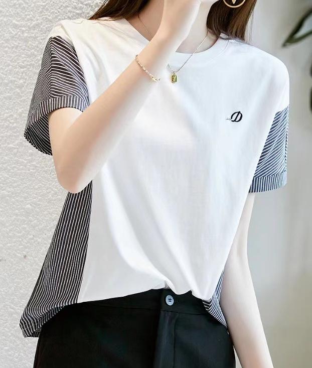 Camiseta blanca a rayas con costuras a juego para mujer, diseño de manga corta, estilo Sense 2025, nueva camiseta de verano, top holgado y adelgazante.