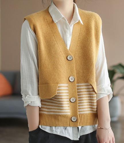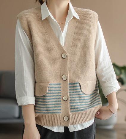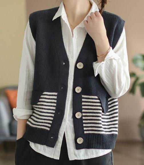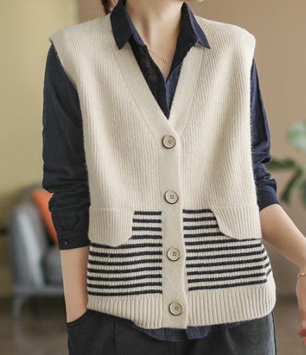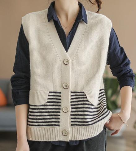 Compra Chaleco vintage a rayas con cuello en V para mujer, primavera y otoño 2025, nuevo cárdigan de punto suelto, chaqueta sin mangas con costuras al por mayor en Joom.pro