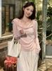 Otoño Elegante Chic Moda Lazo Ajustado Camiseta Ajustada Sexy Deseo Puro Top de Manga Larga para Mujer Combinable Ins