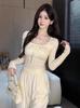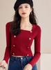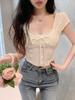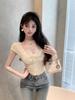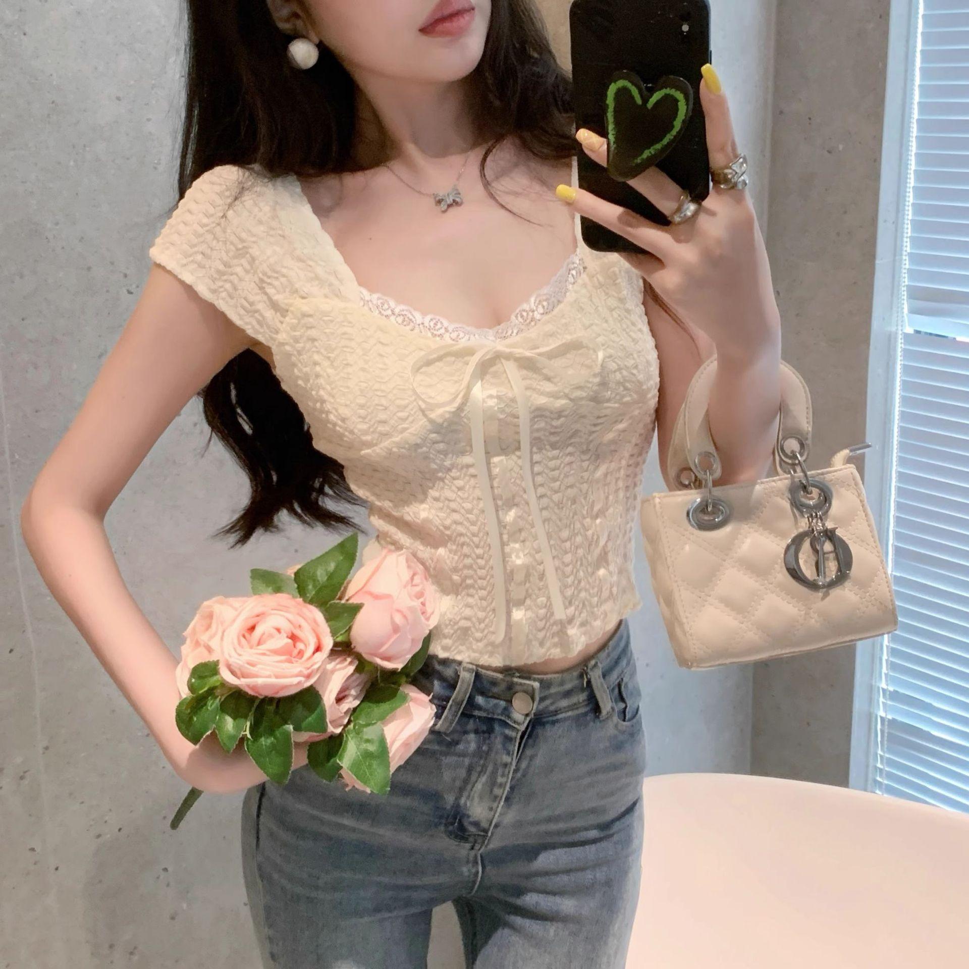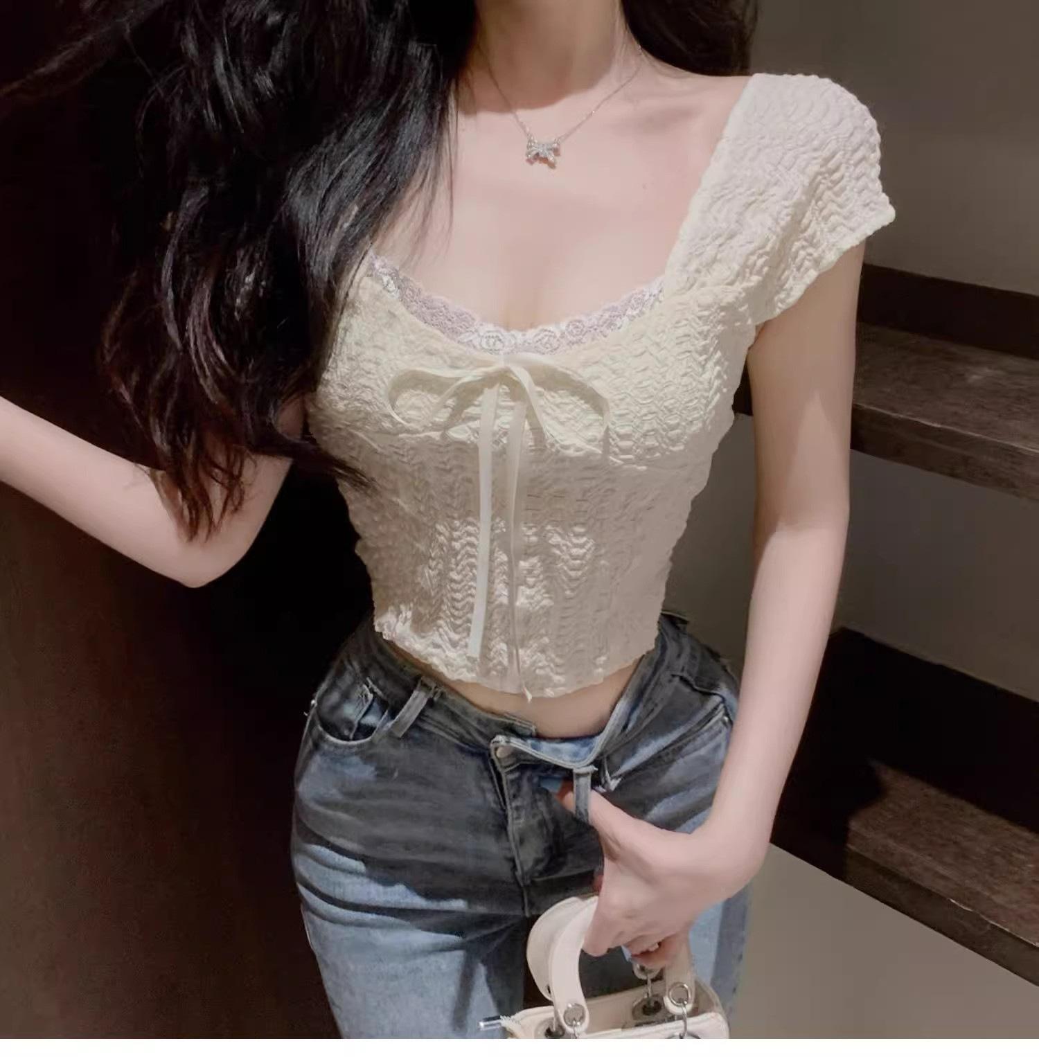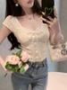 Camiseta de encaje con cuello cuadrado, estilo francés, puro deseo, para chica sexy, ajustada, adelgazante, sexy, de nicho, combina con todo, a la moda, elegante.