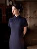 Cheongsam de verano 2025 para niña, nuevo y mejorado, color azul oscuro liso, con hombros descubiertos, temperamento artístico, manga corta para jóvenes.