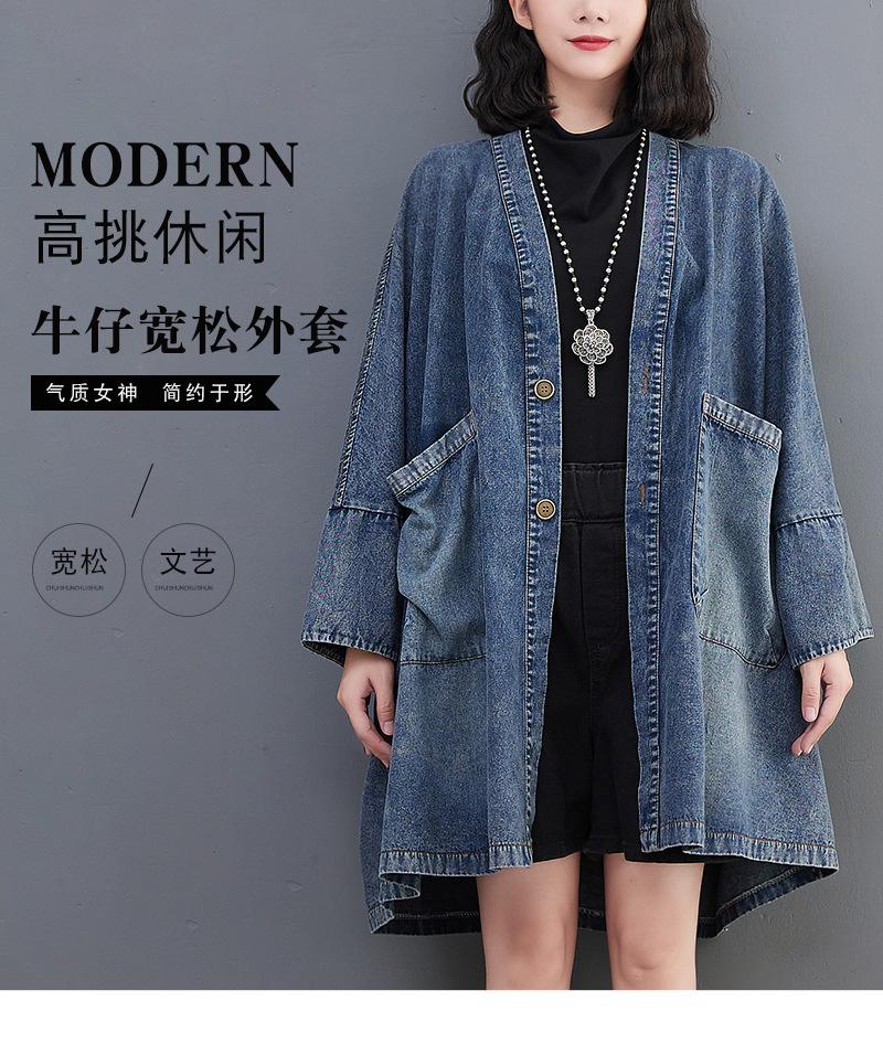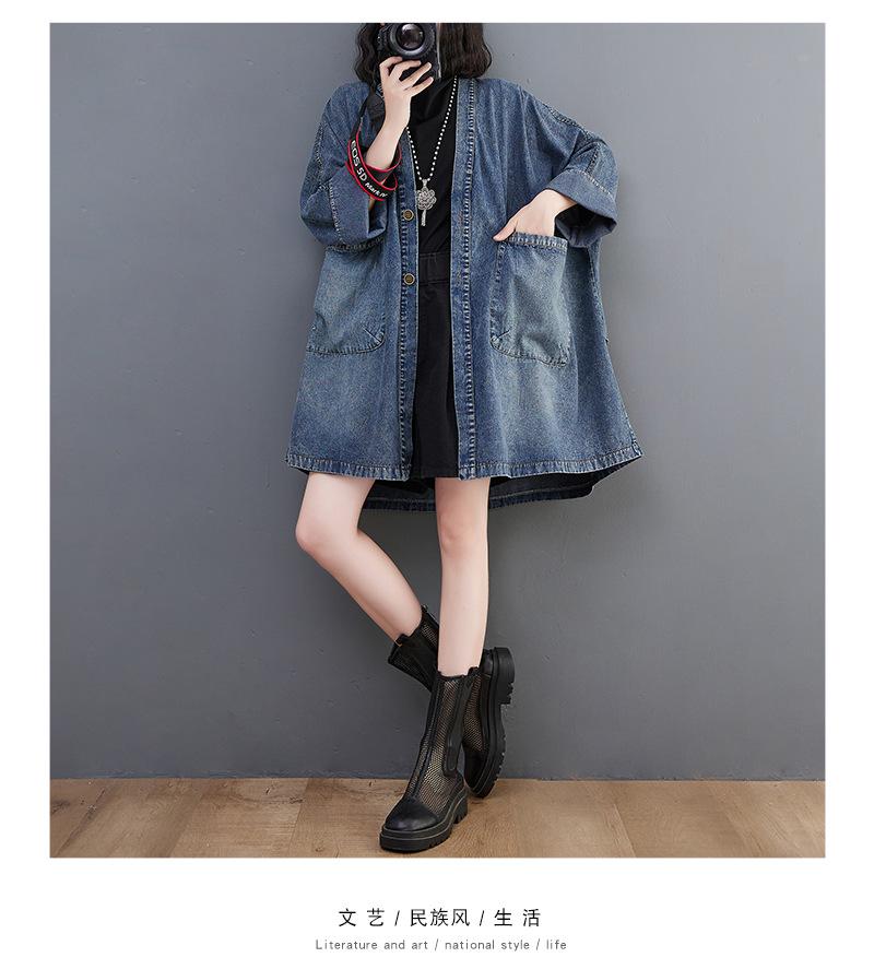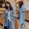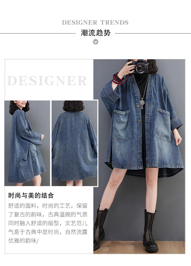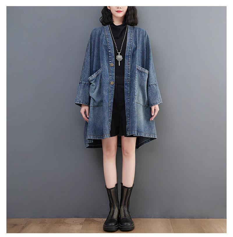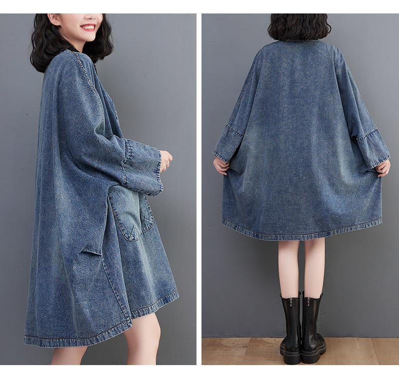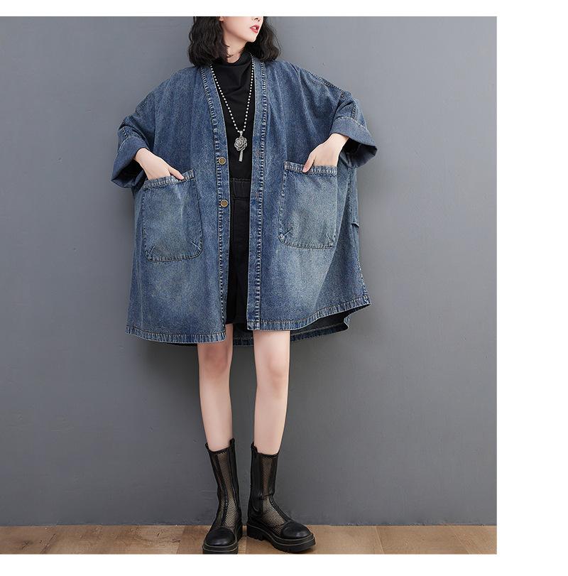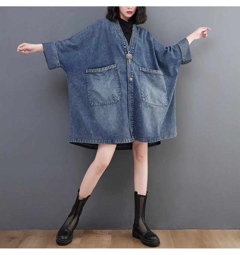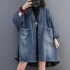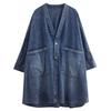 Abrigo vaquero con bolsillo y escote en V vintage para mujer, nueva gabardina larga holgada de otoño, versión grande, disponible en stock.