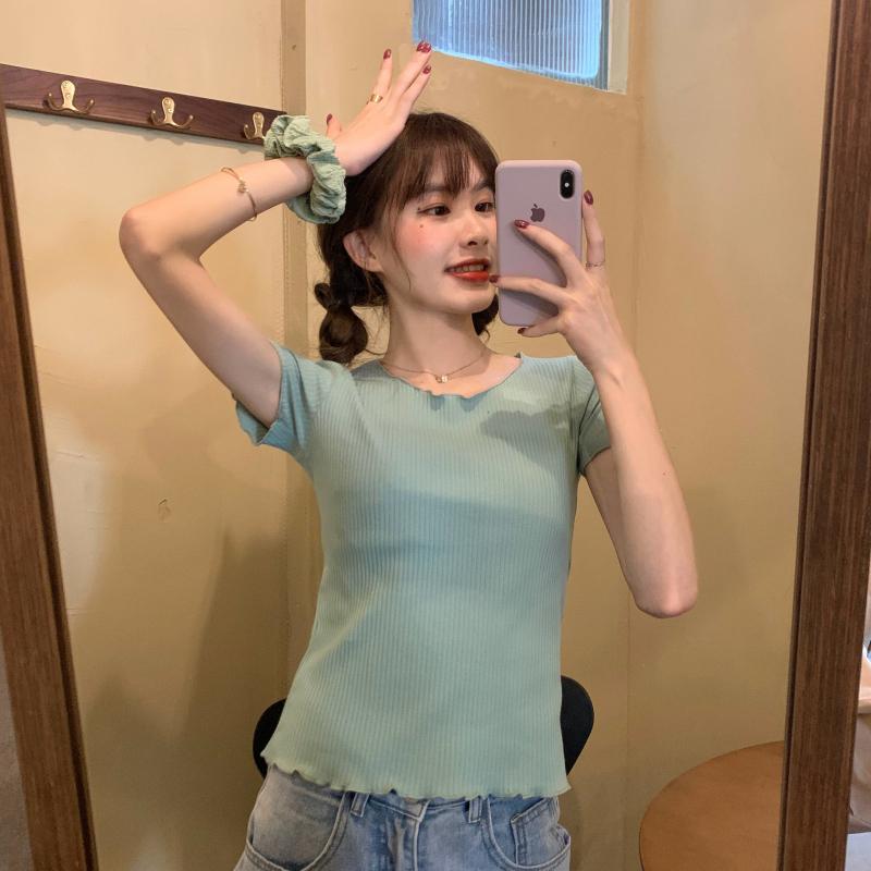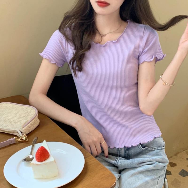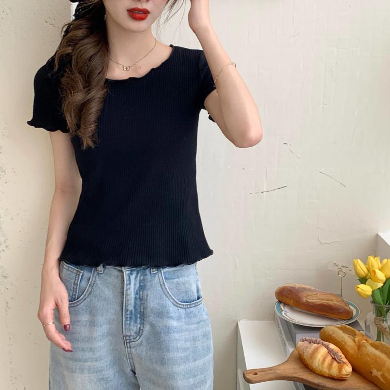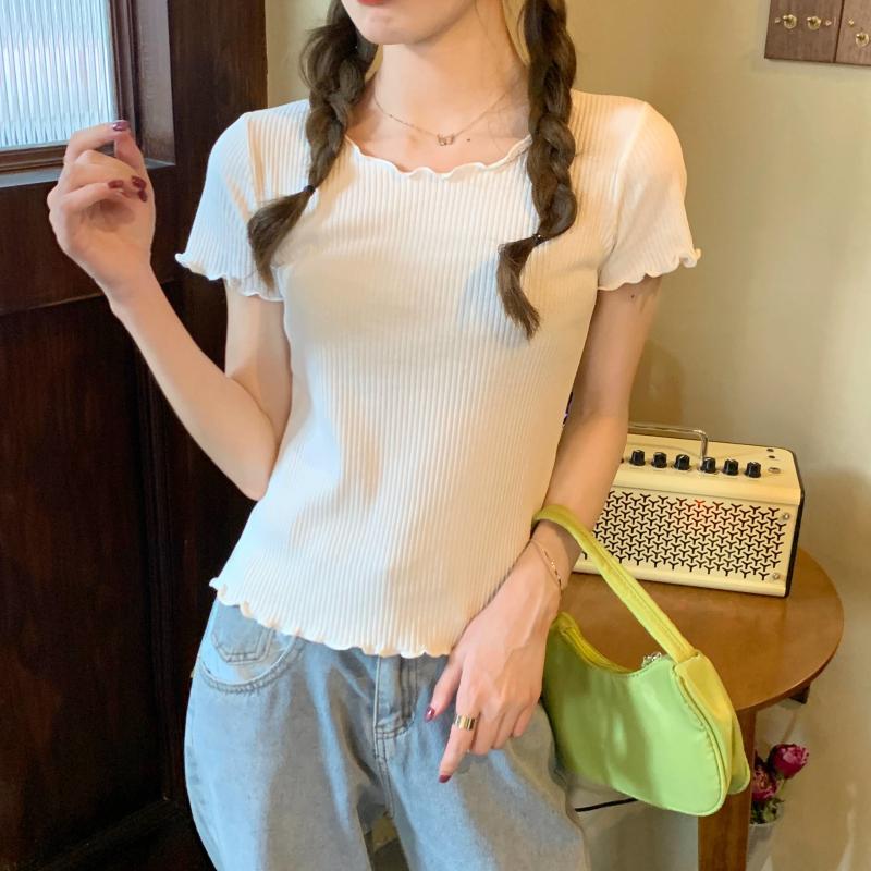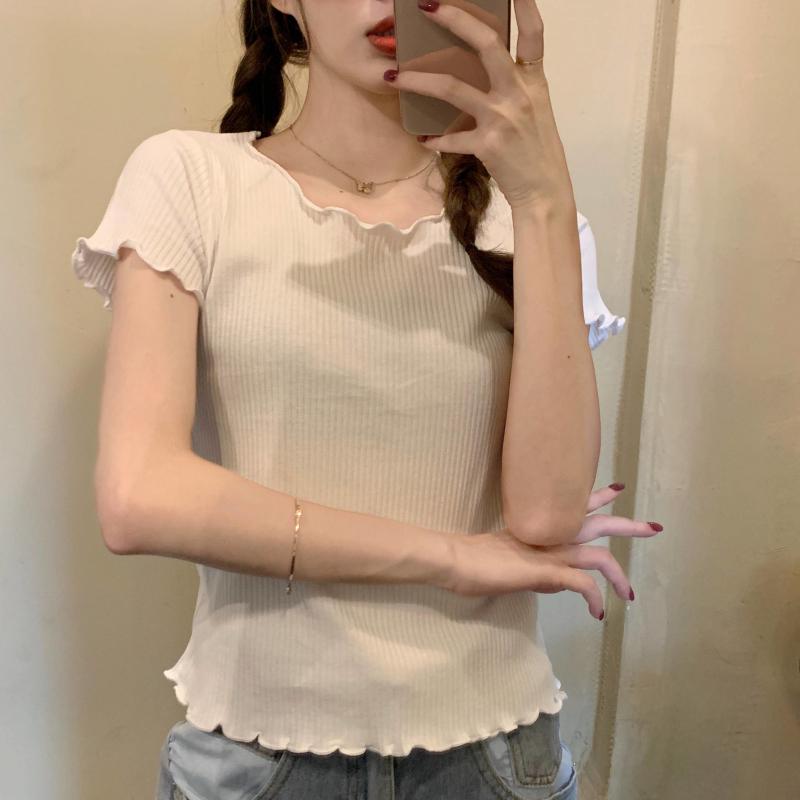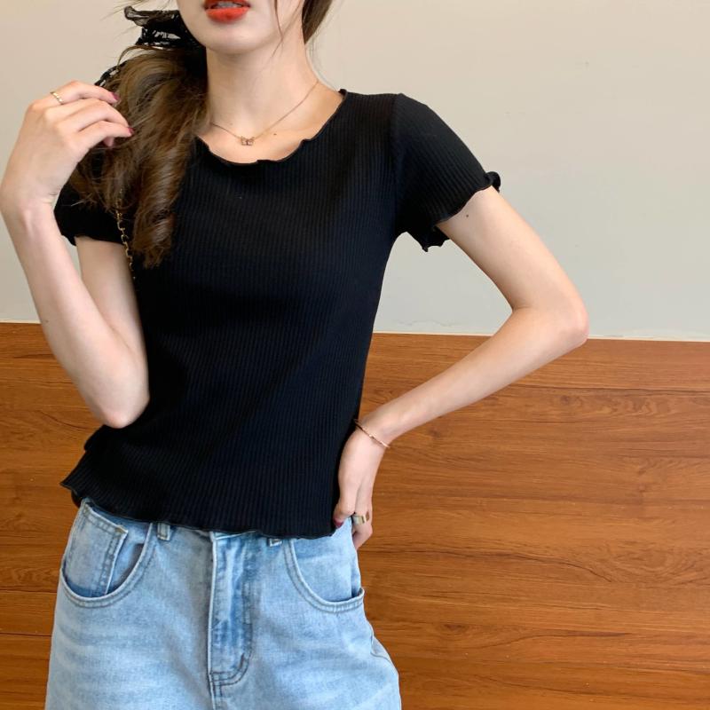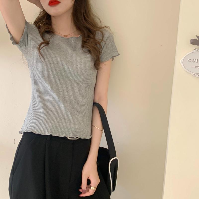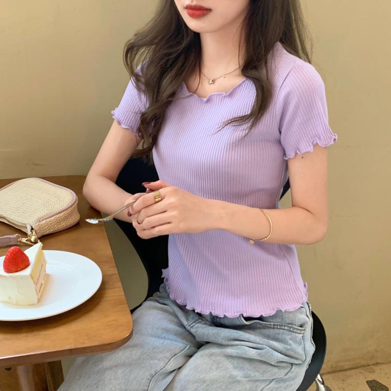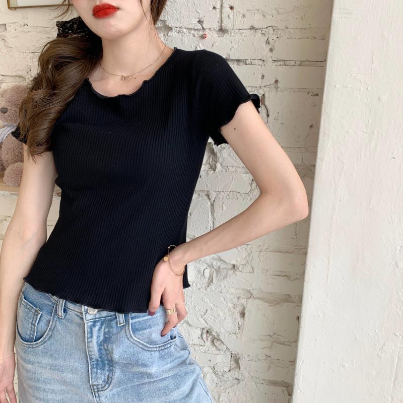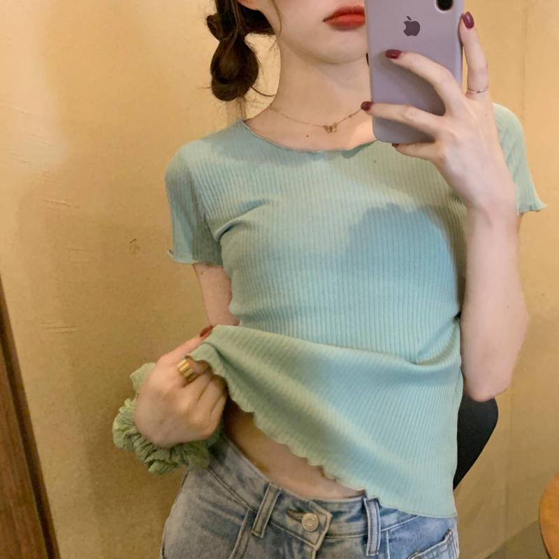 Camiseta Simple de Verano 2024 con Hongo Estilo Coreano Manga Corta Ajustada Tejida Camiseta Básica Top Delgado