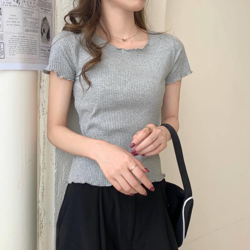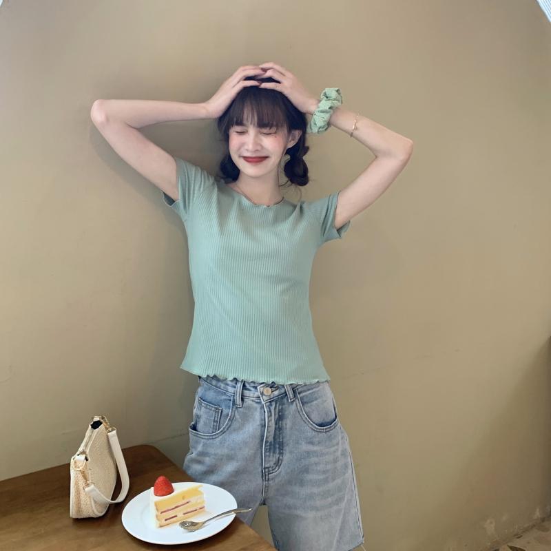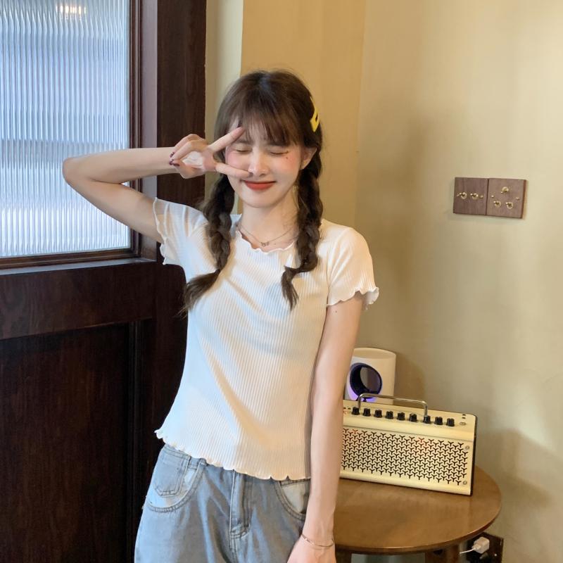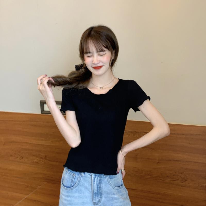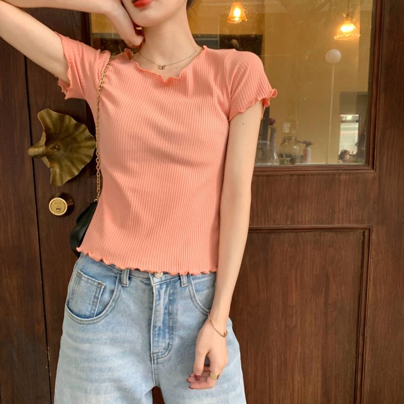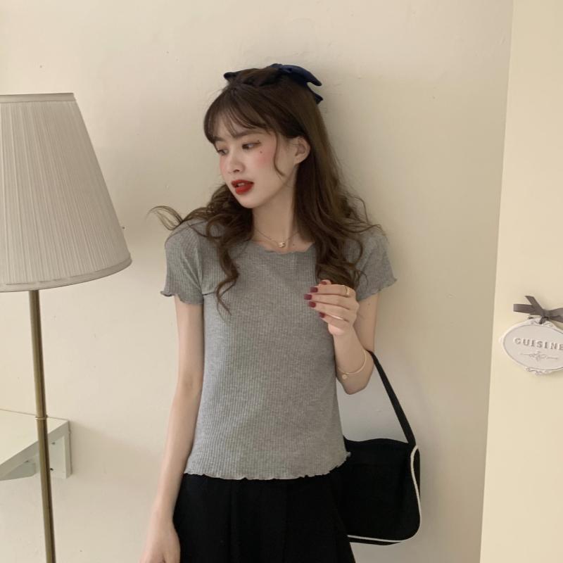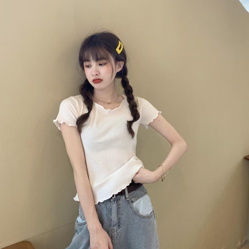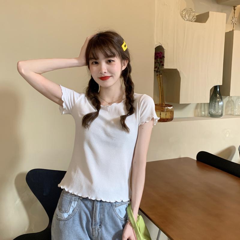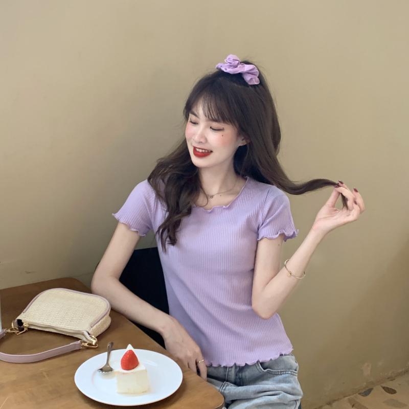 Camiseta Simple de Verano 2024 con Hongo Estilo Coreano Manga Corta Ajustada Tejida Camiseta Básica Top Delgado