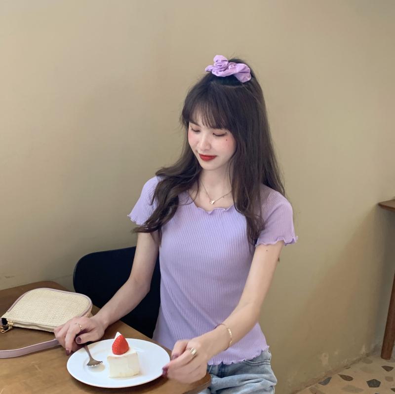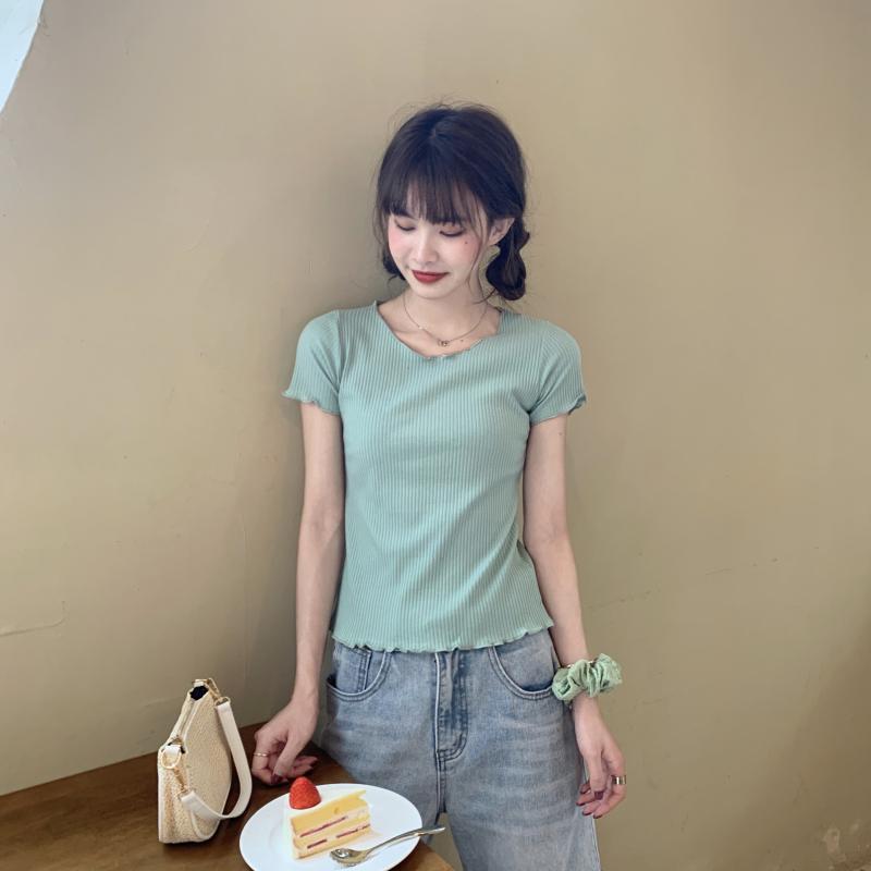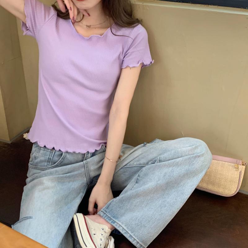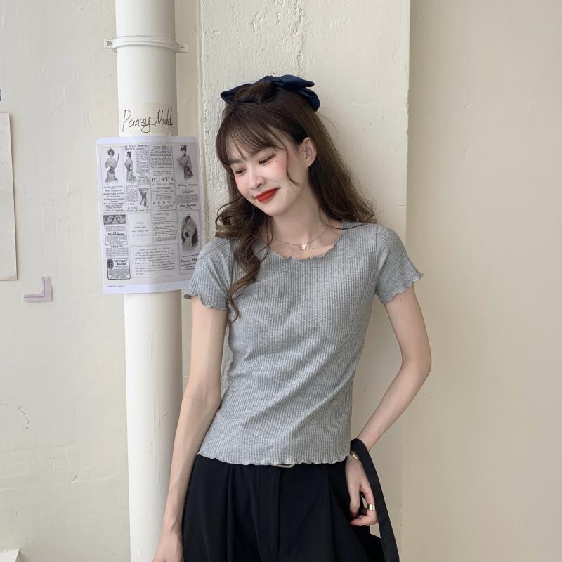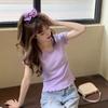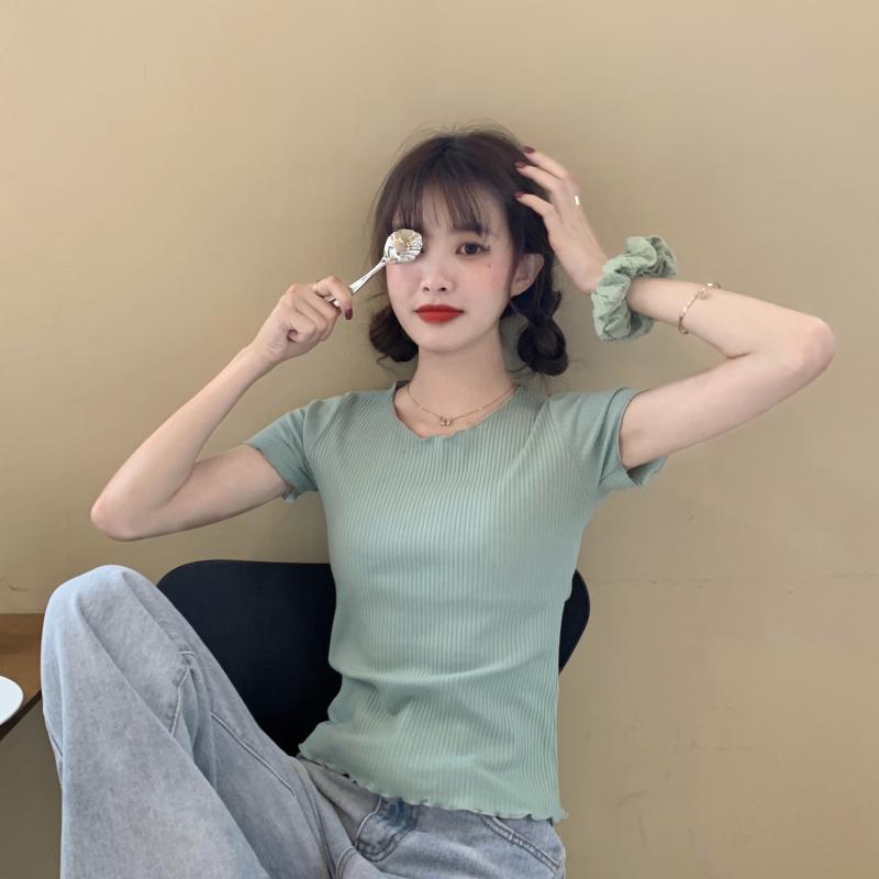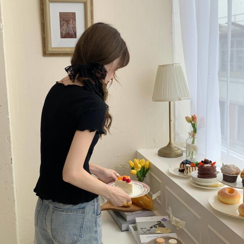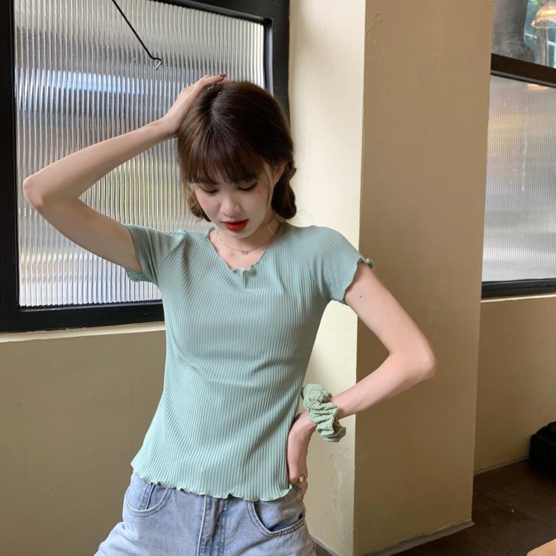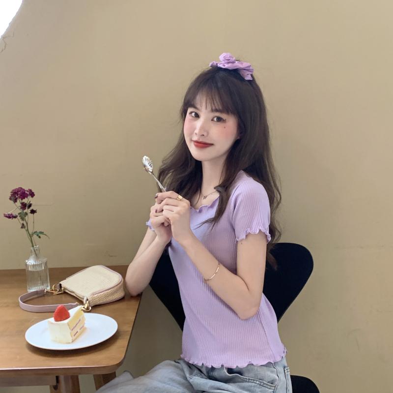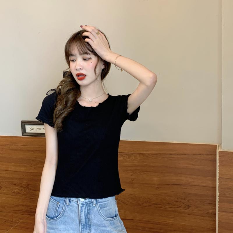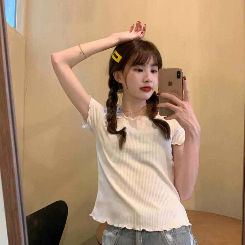 Camiseta Simple de Verano 2024 con Hongo Estilo Coreano Manga Corta Ajustada Tejida Camiseta Básica Top Delgado
