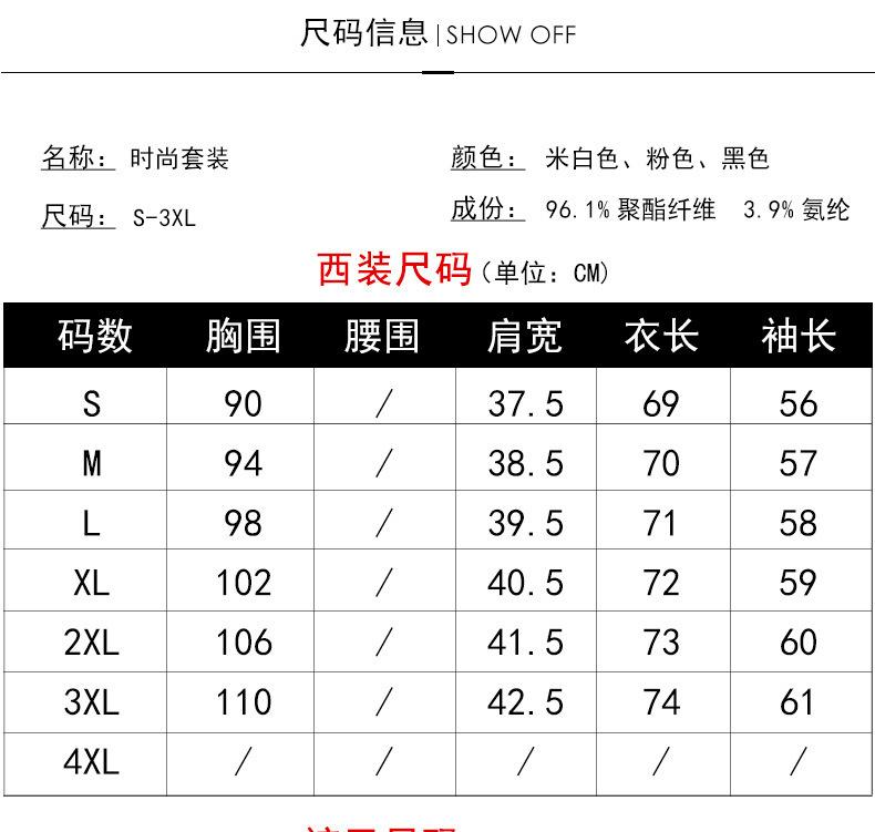Black one piece suit, Pink one piece suit, Off-white single suit, Black suit + pants, Pink suit + pants, Off-white suit + pants