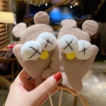 Versión coreana de guantes de bebé para otoño e invierno, para niños, con cuello colgante, oso, lindos dibujos animados, tejido de lana, doble capa con terciopelo