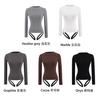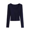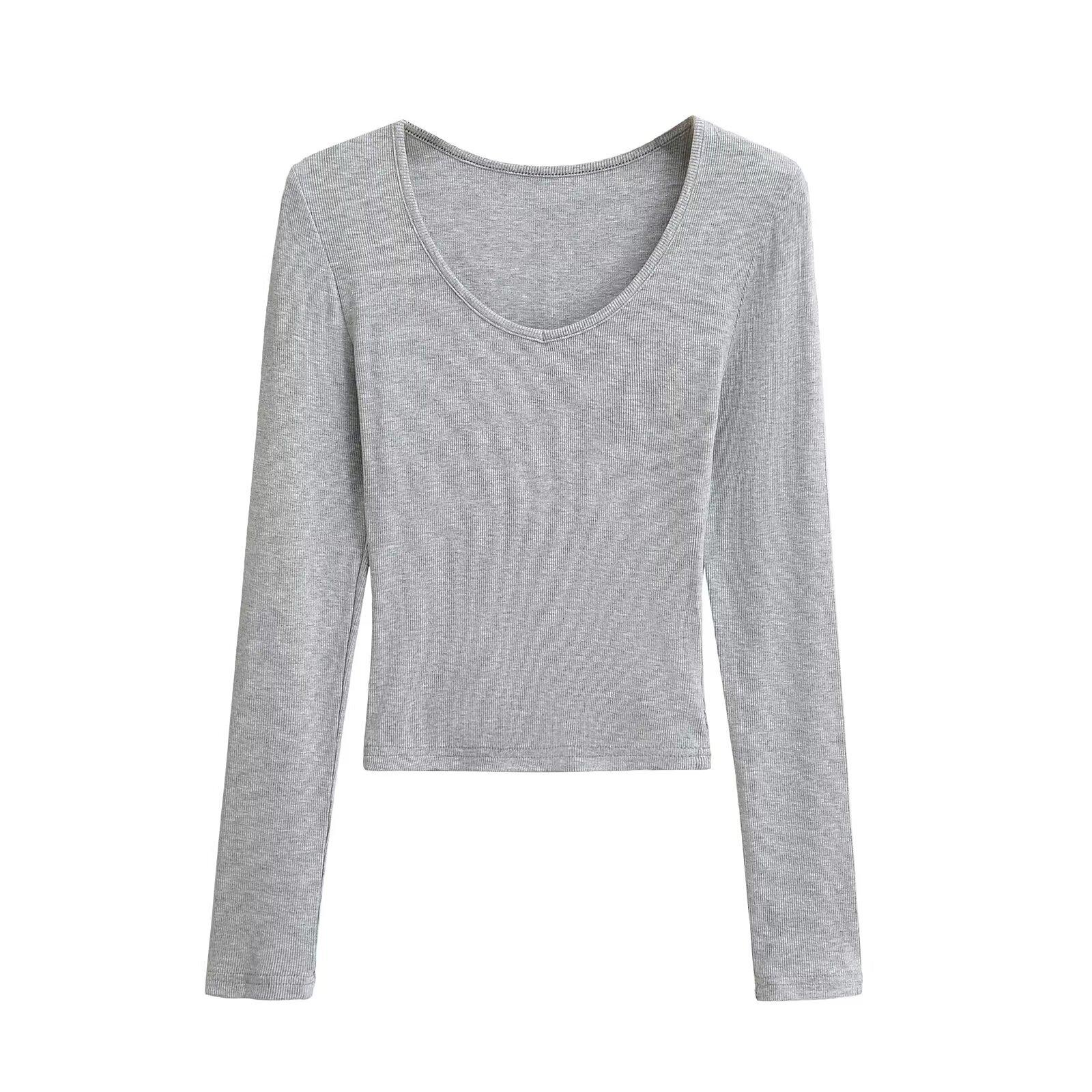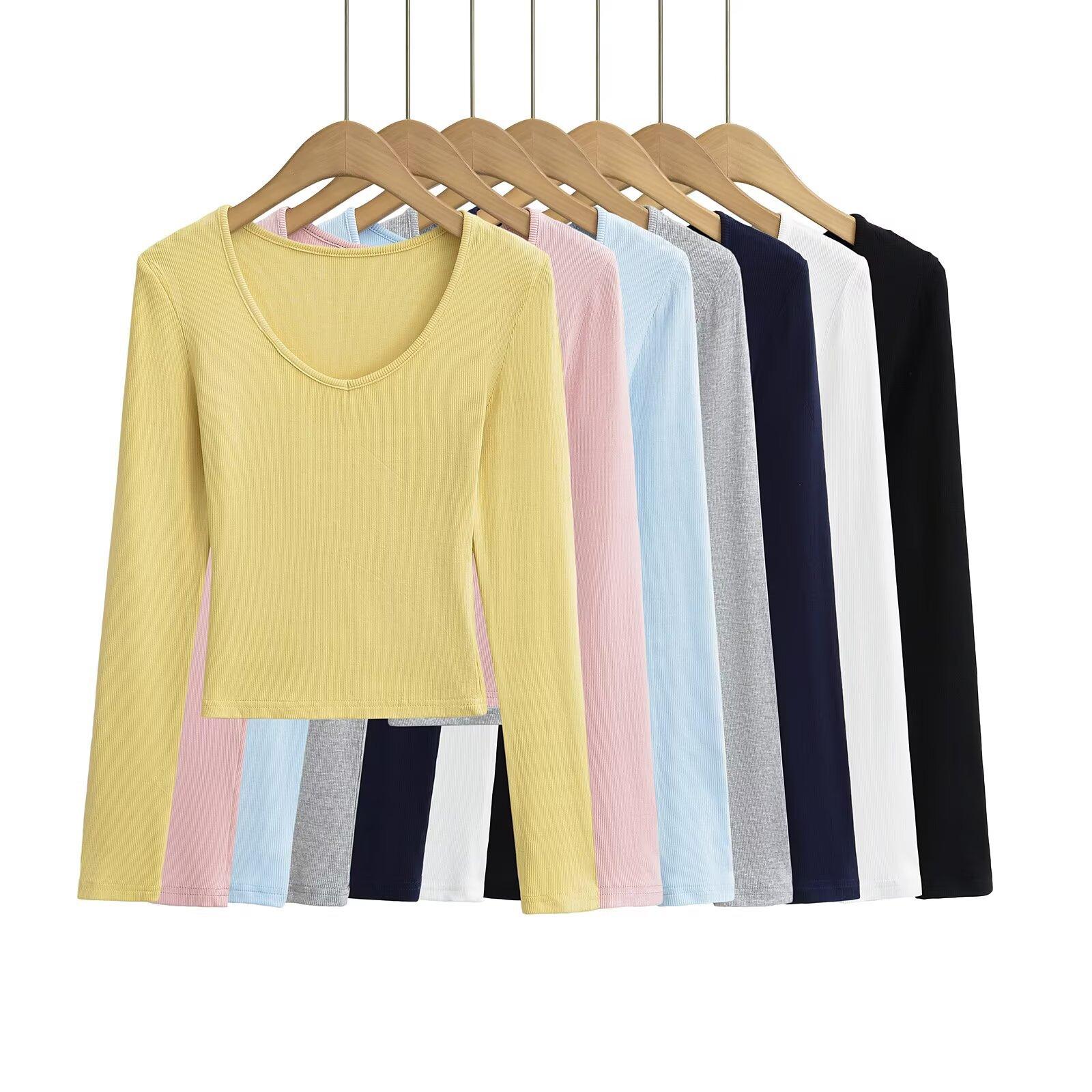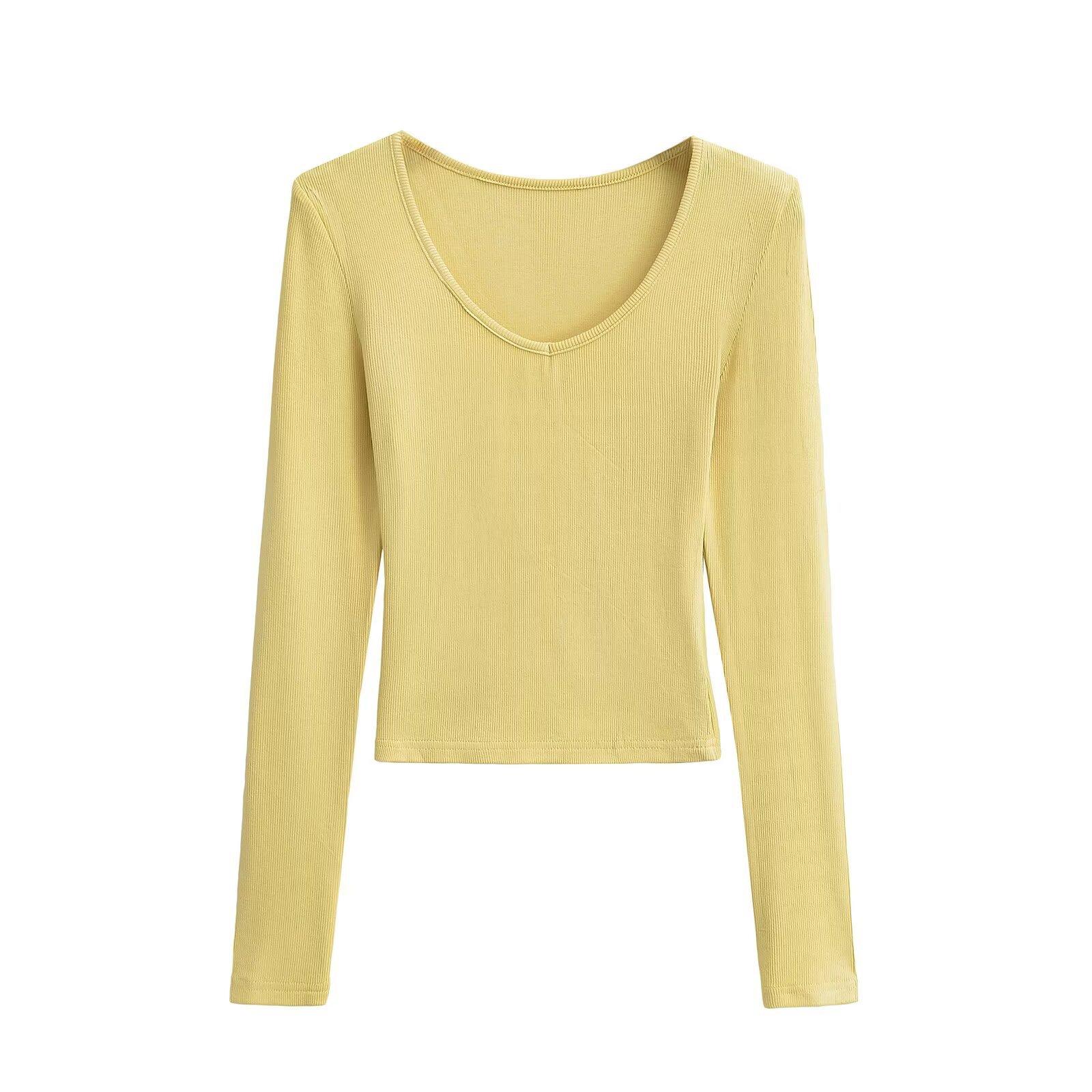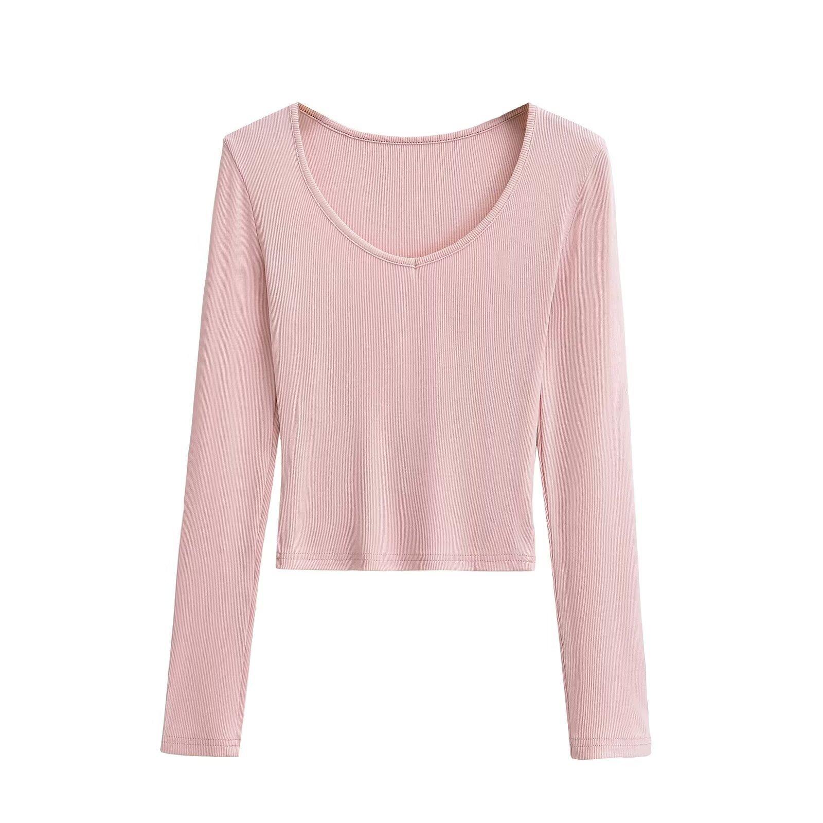 Camiseta de manga larga con cuello redondo para mujer, estilo europeo y americano, primavera 2025, color liso, ajustada, básica