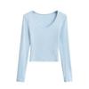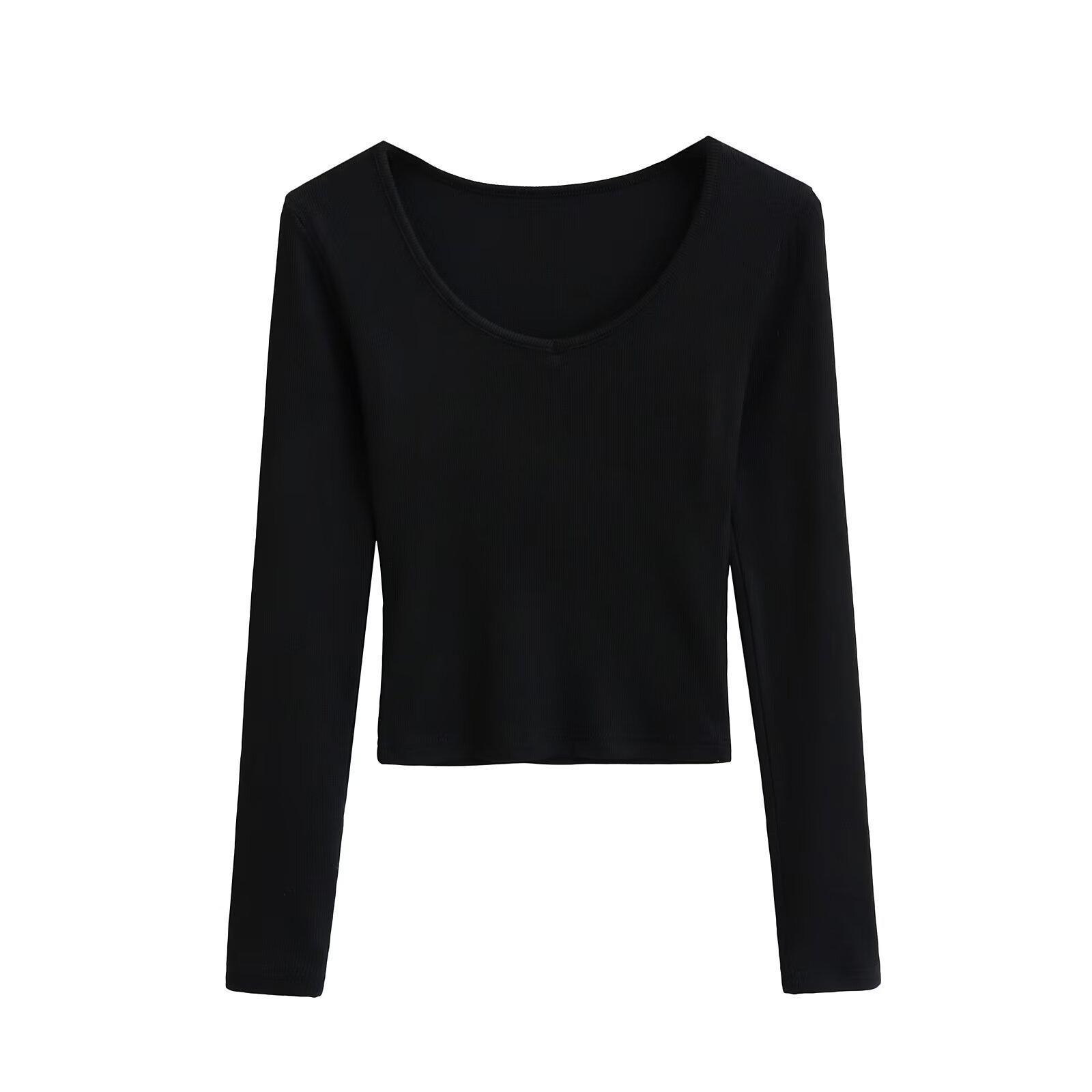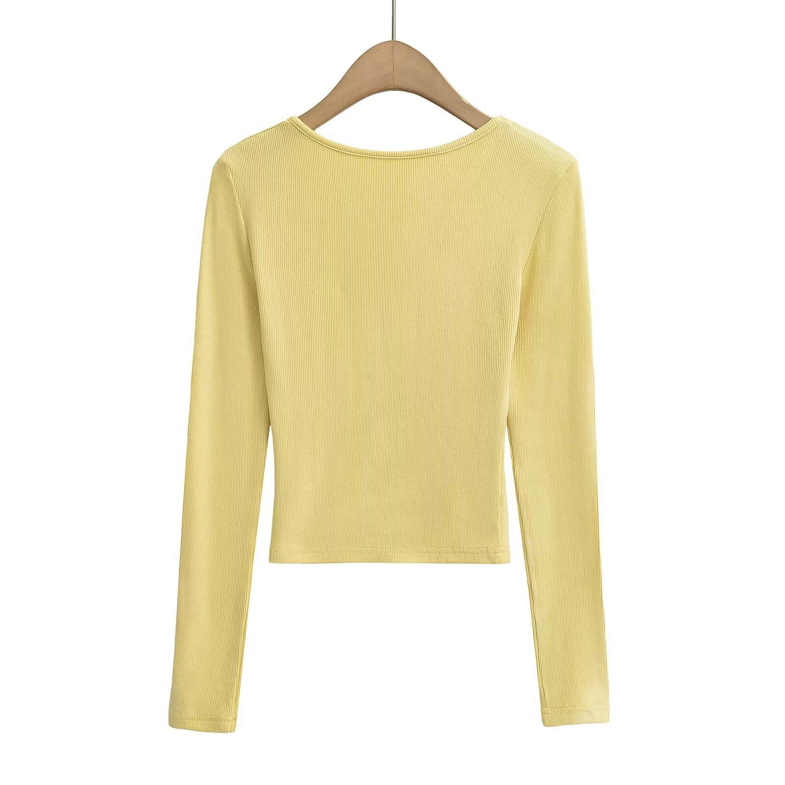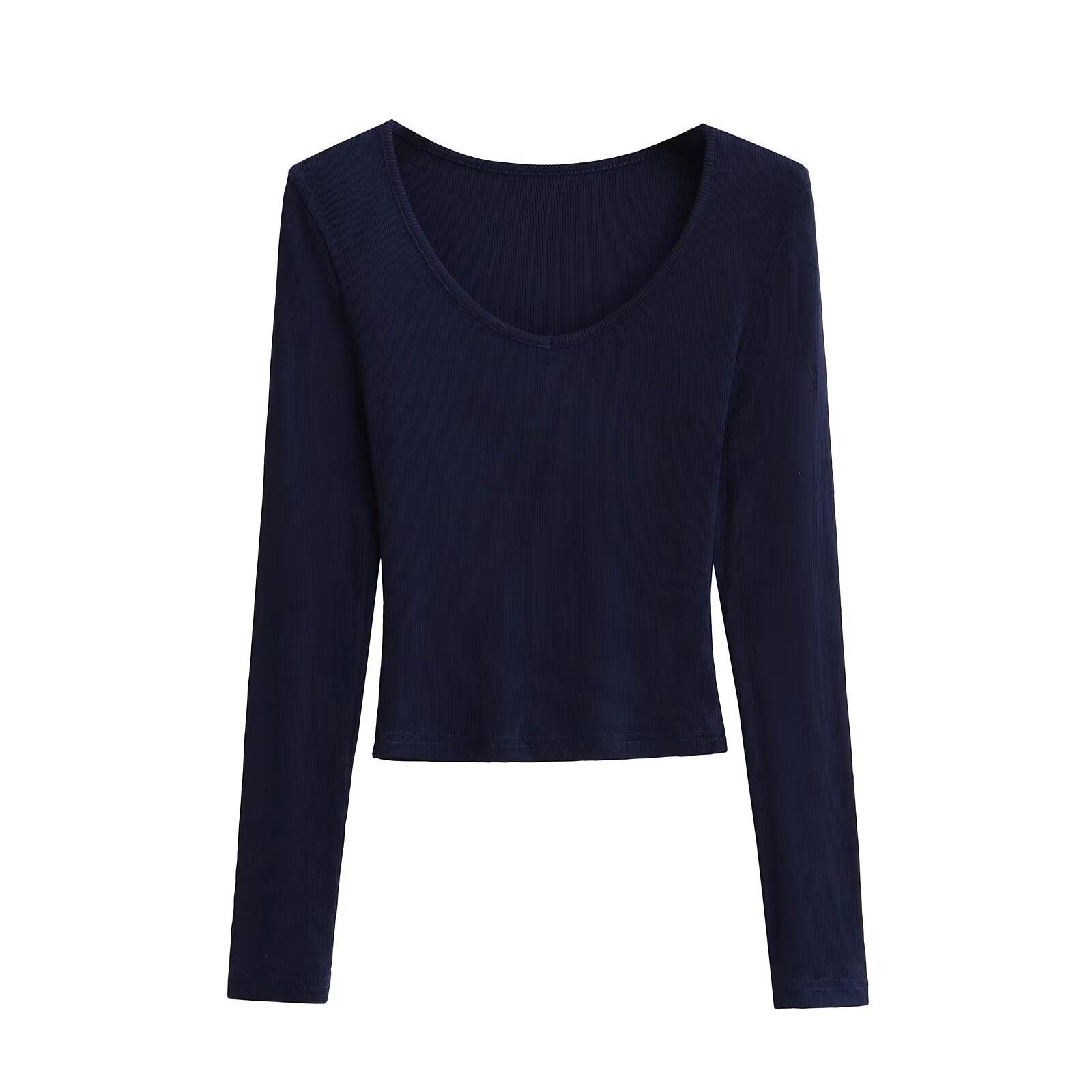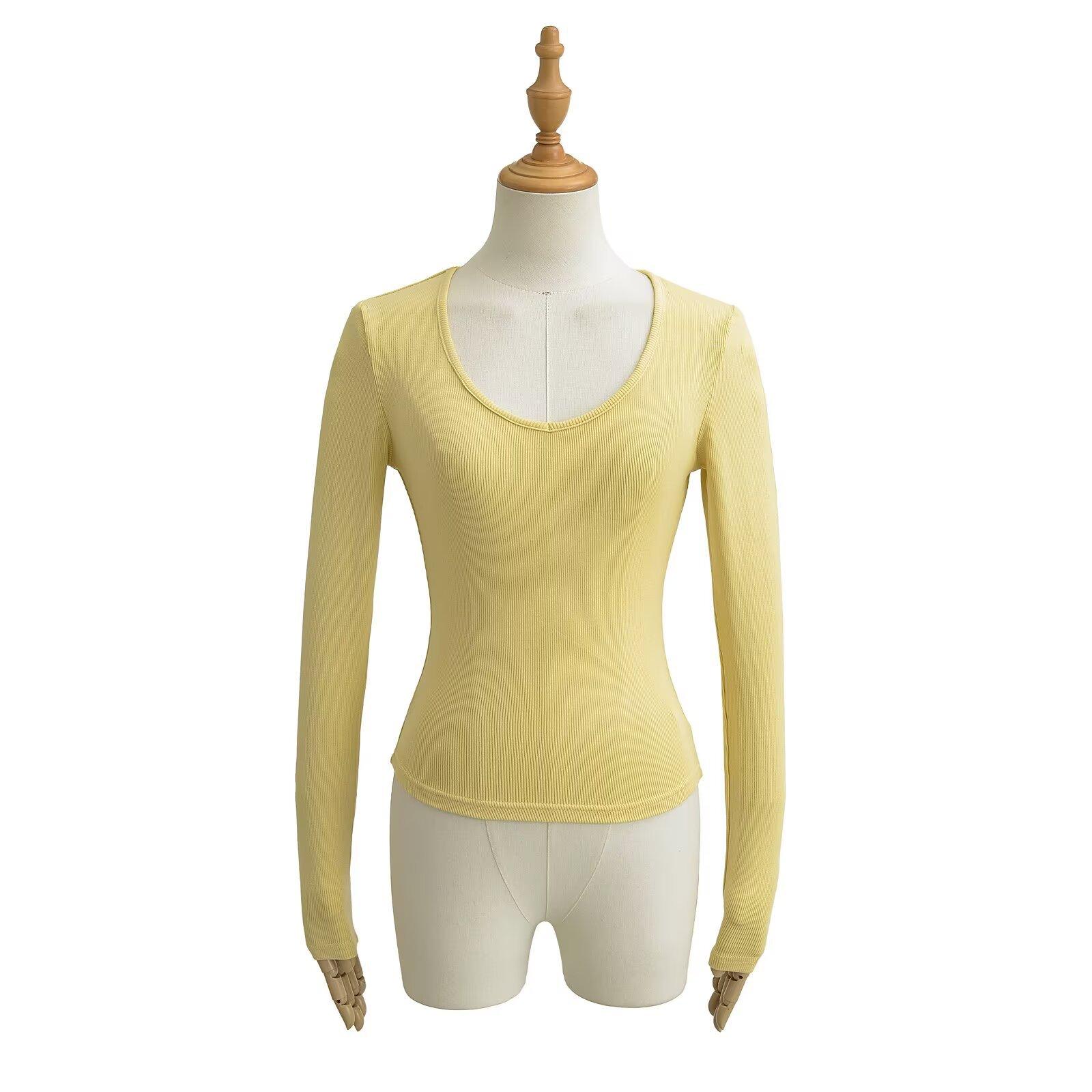 Camiseta de manga larga con cuello redondo para mujer, estilo europeo y americano, primavera 2025, color liso, ajustada, básica