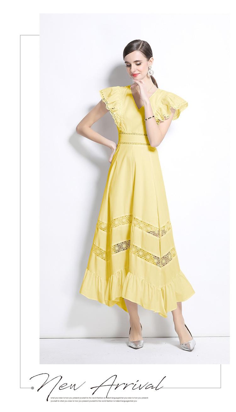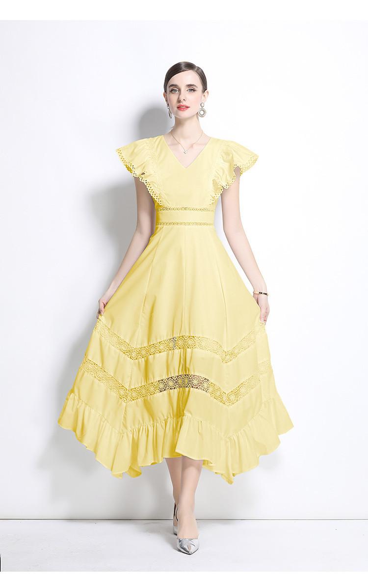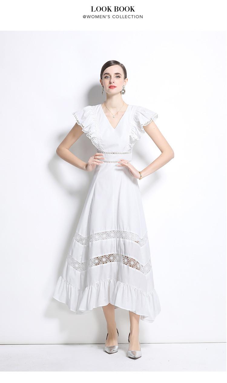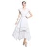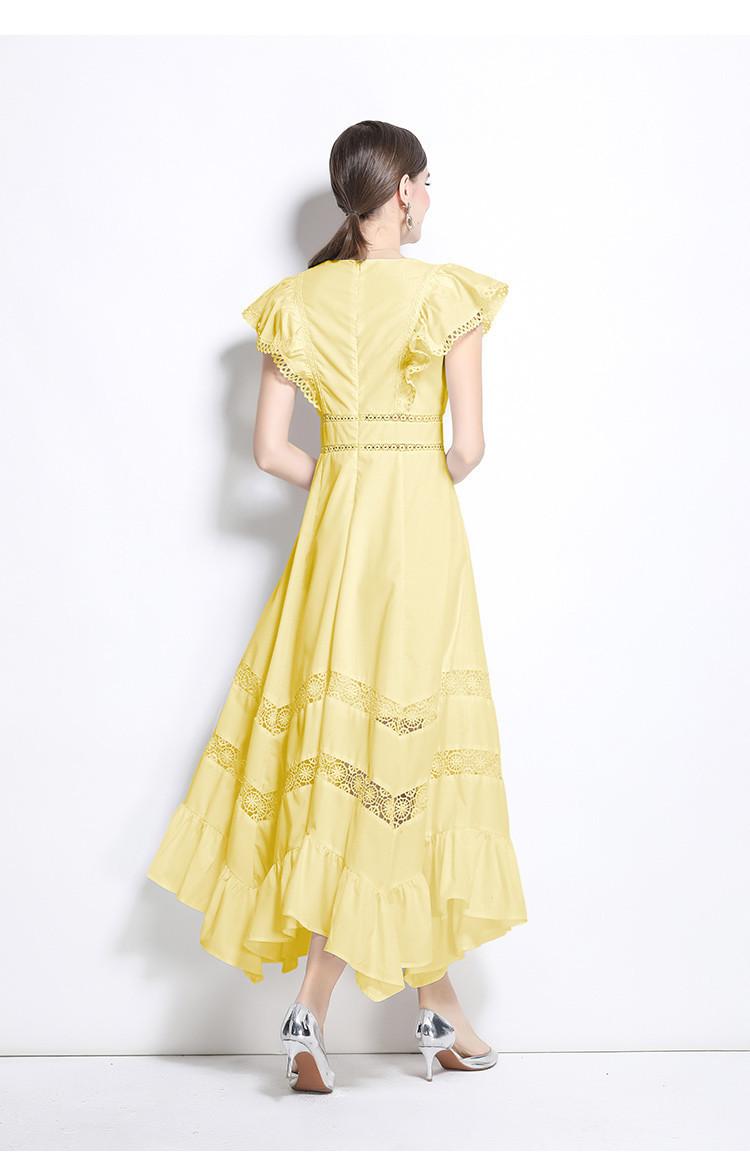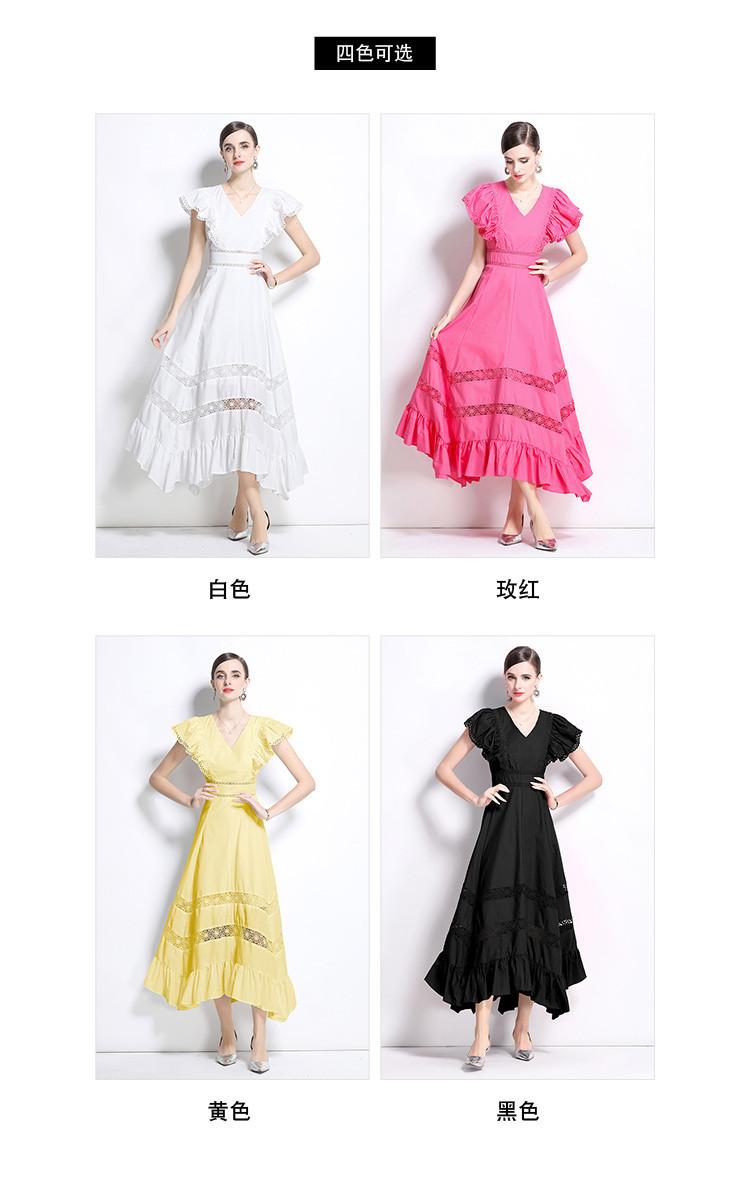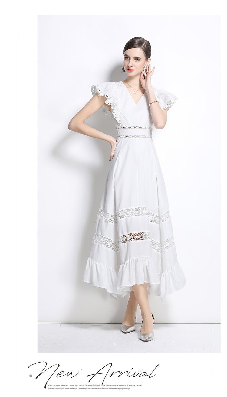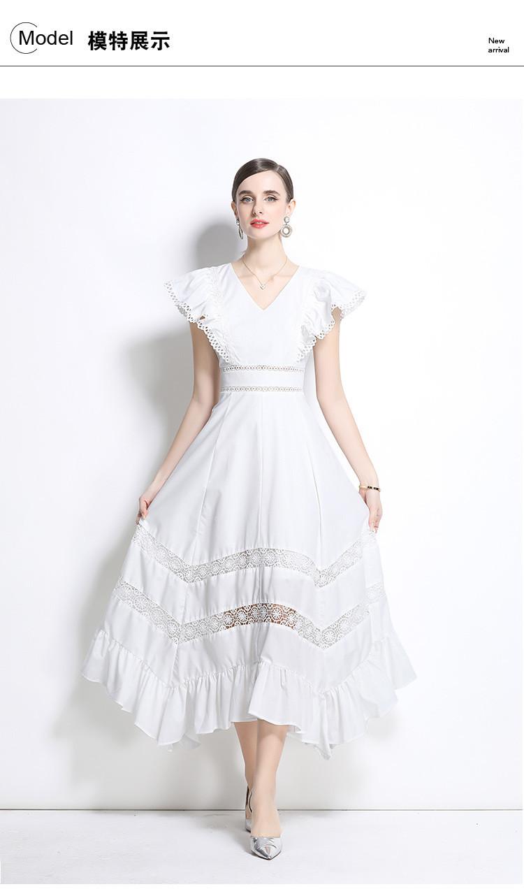 Vestido sexy temperamental transfronterizo europeo y americano estilo vacacional cuello en V manga volada encaje calado vestido