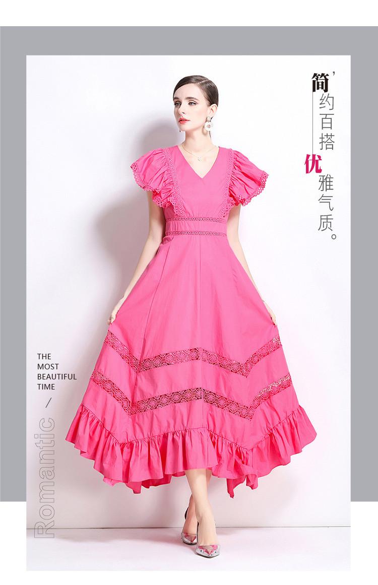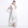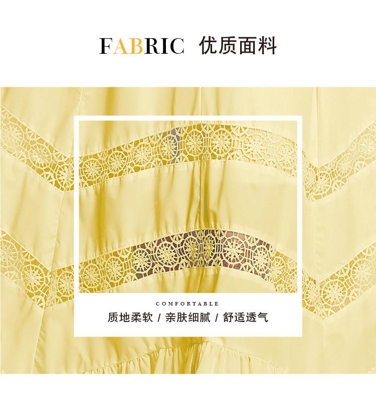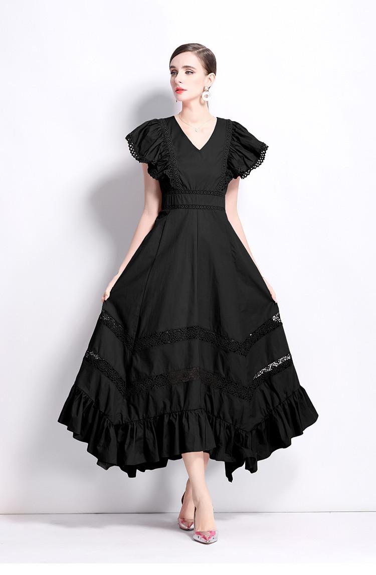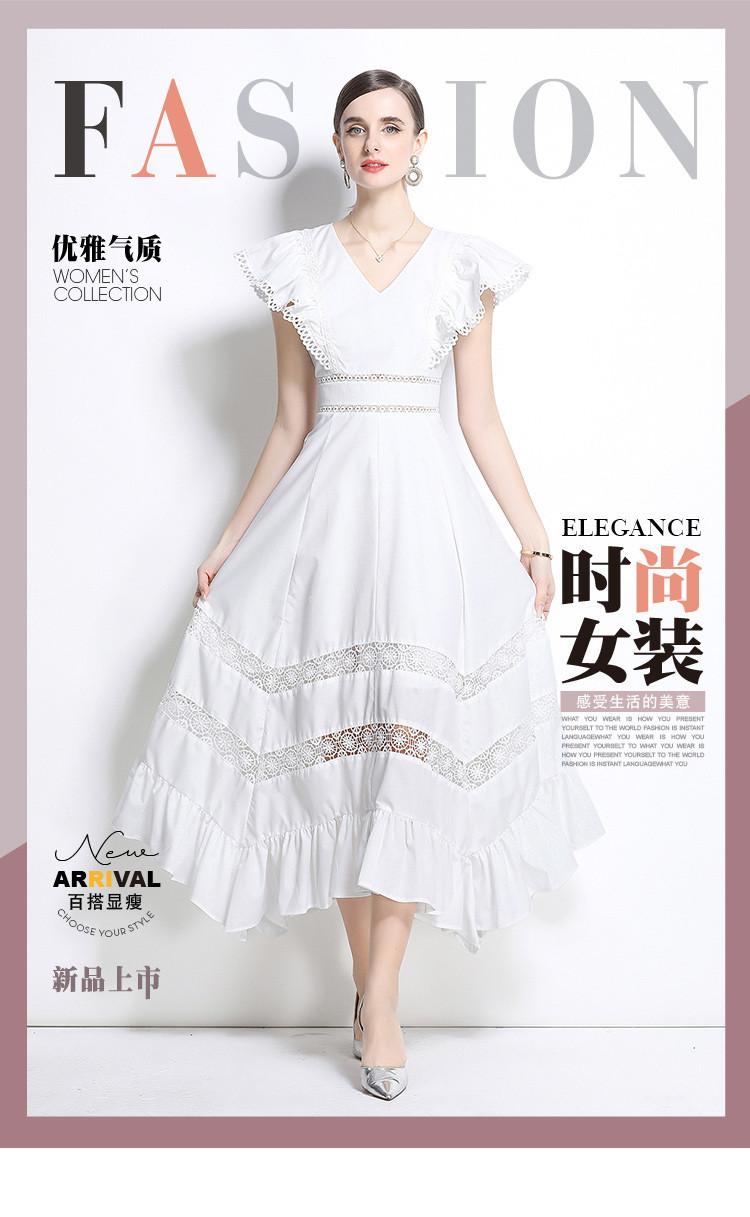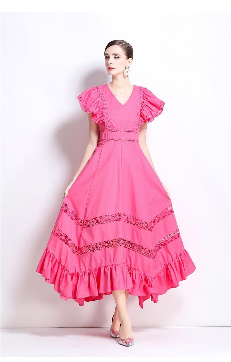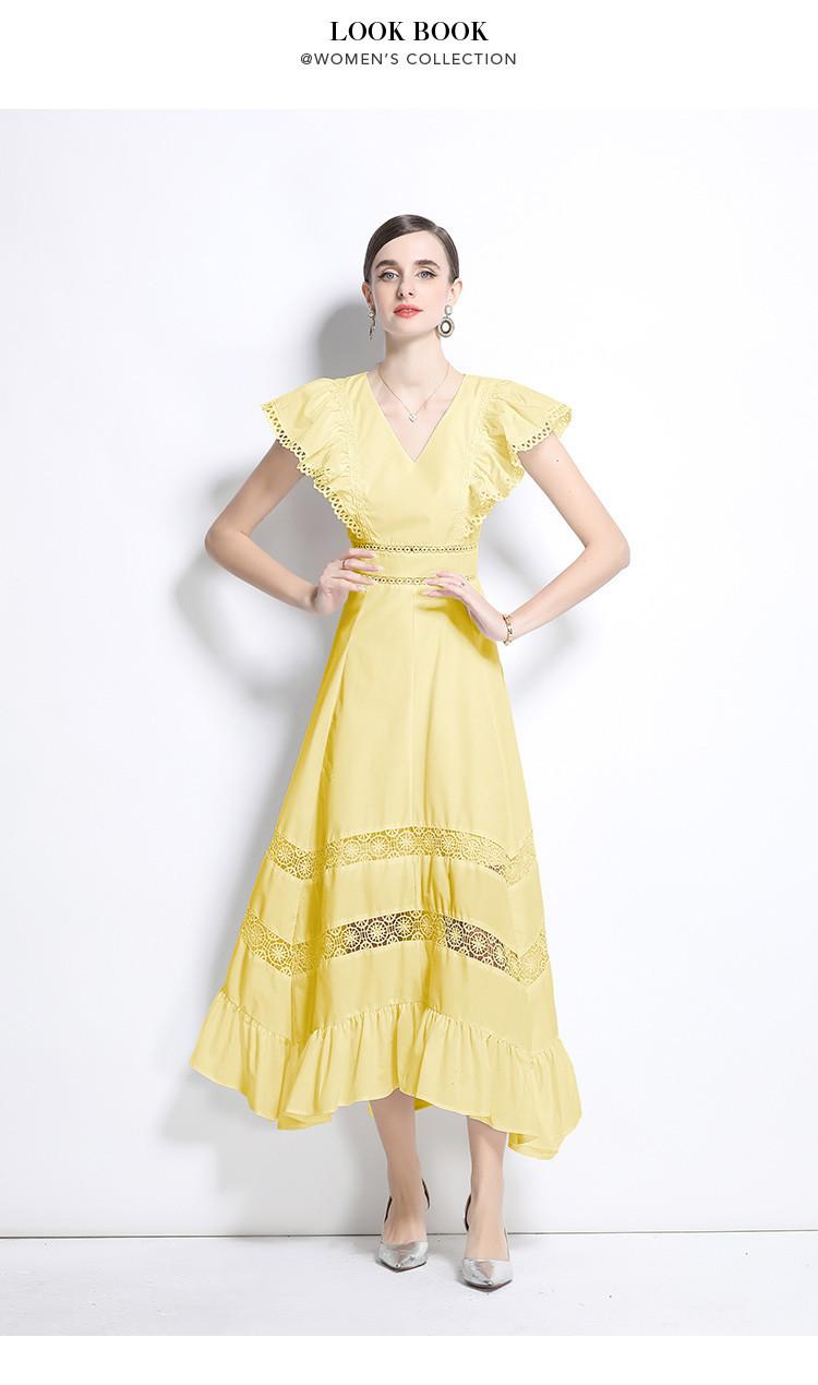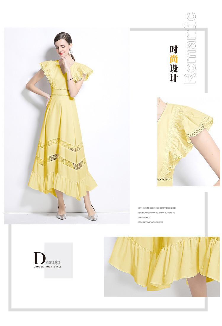Vestido sexy temperamental transfronterizo europeo y americano estilo vacacional cuello en V manga volada encaje calado vestido