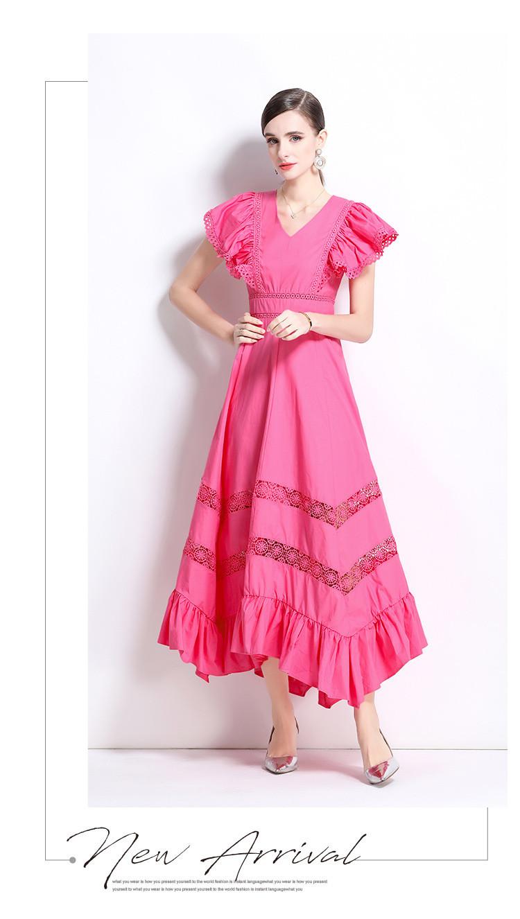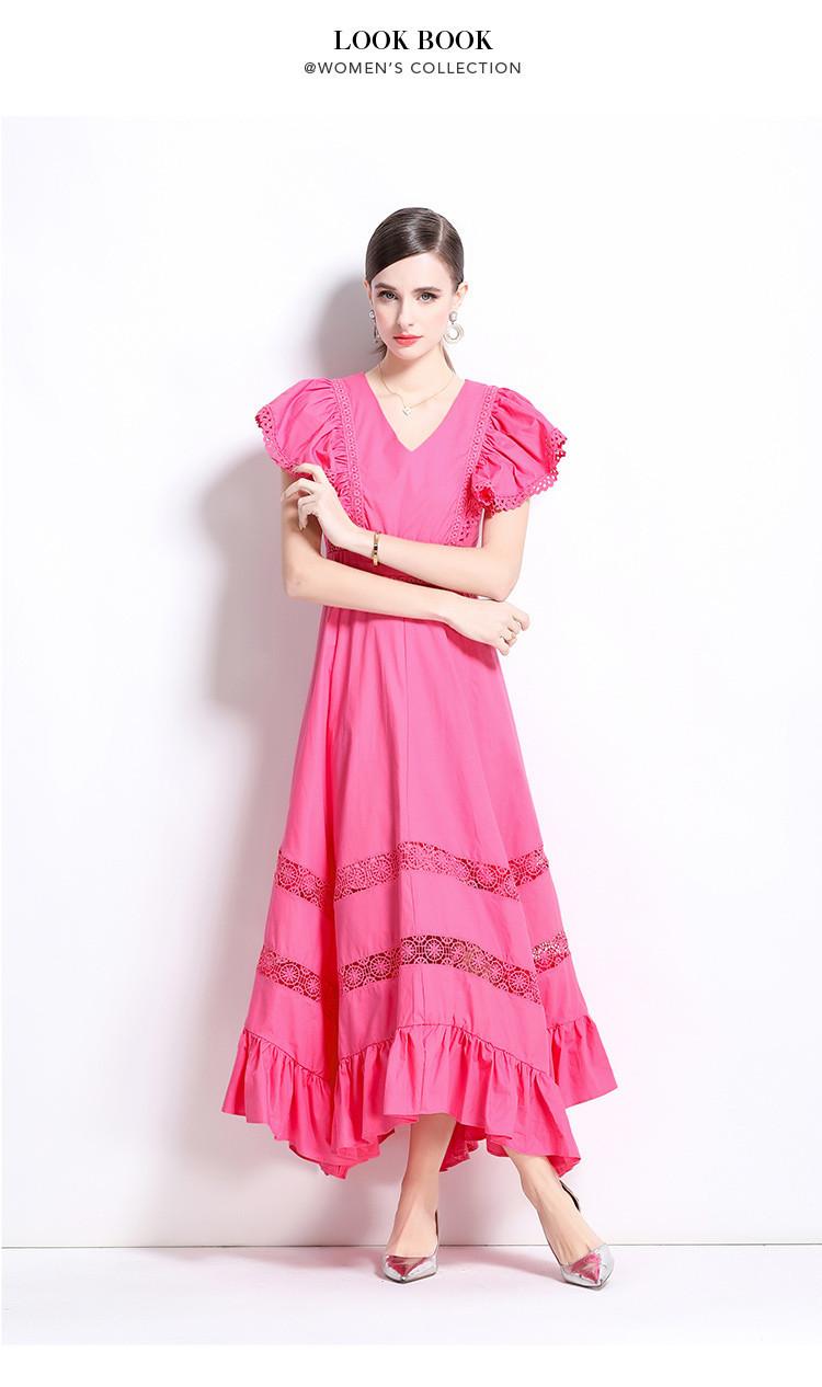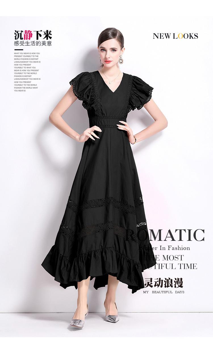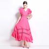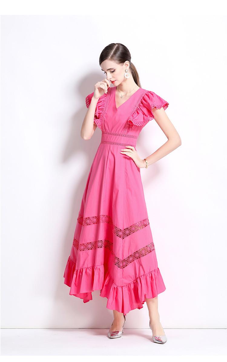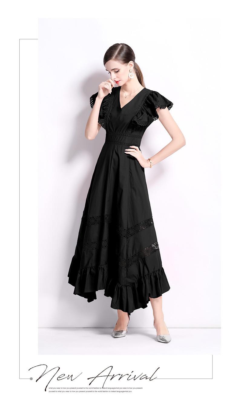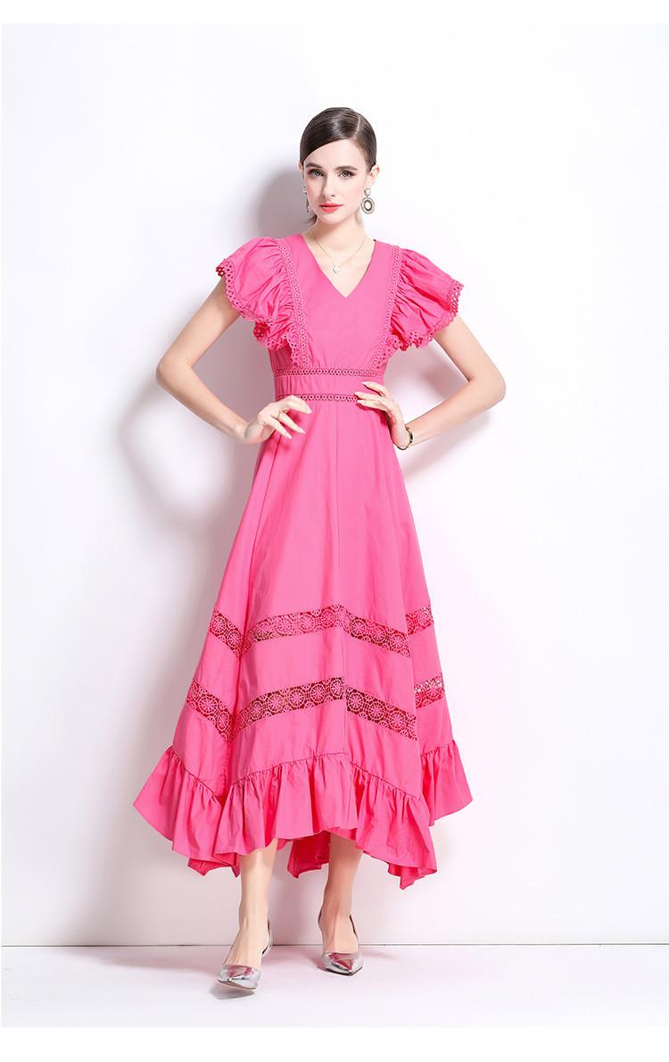 Vestido sexy temperamental transfronterizo europeo y americano estilo vacacional cuello en V manga volada encaje calado vestido