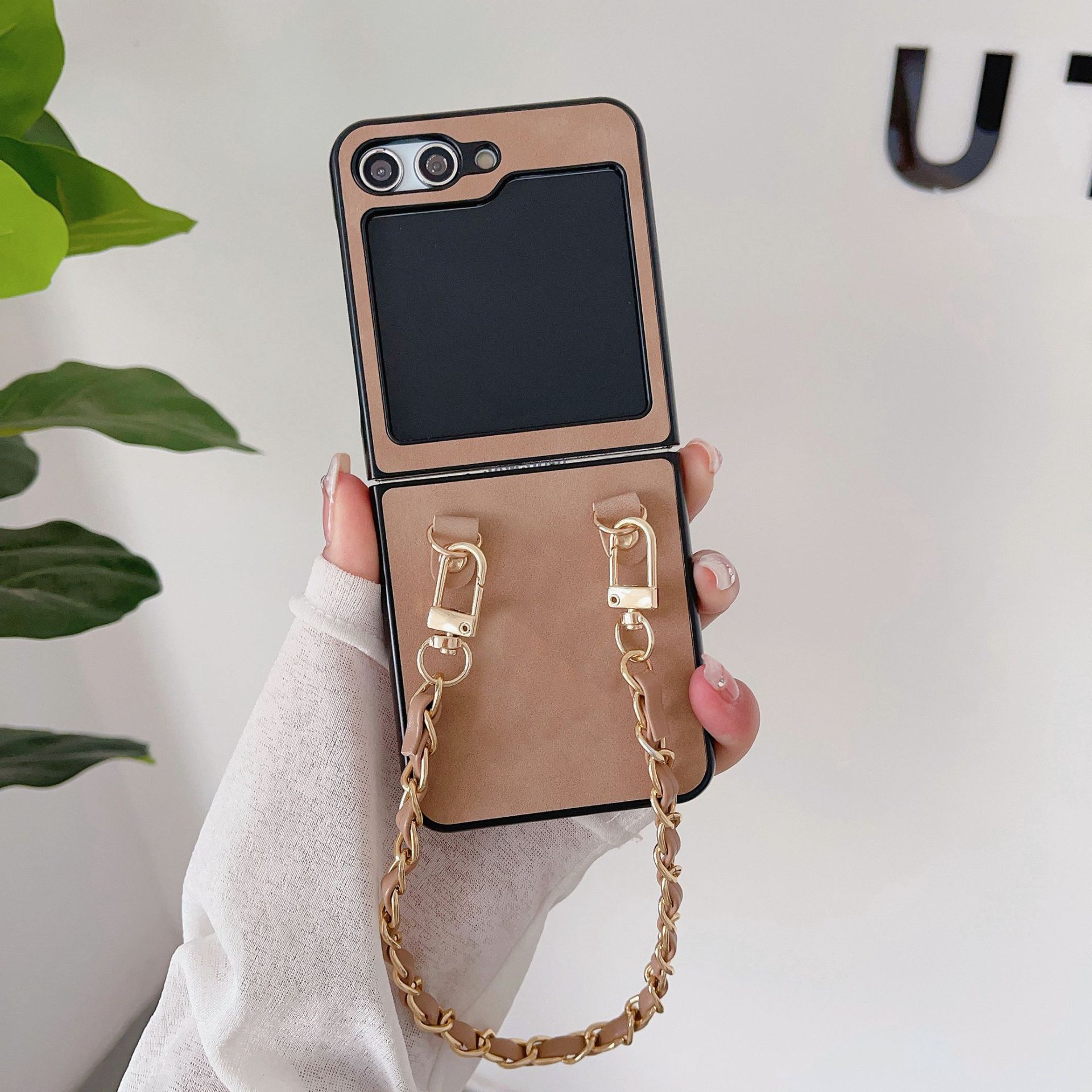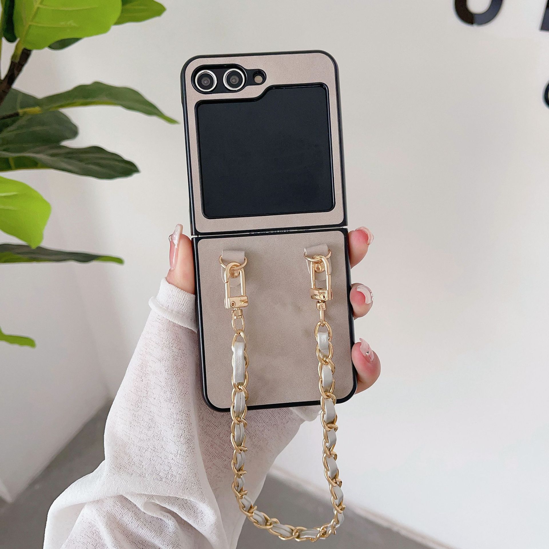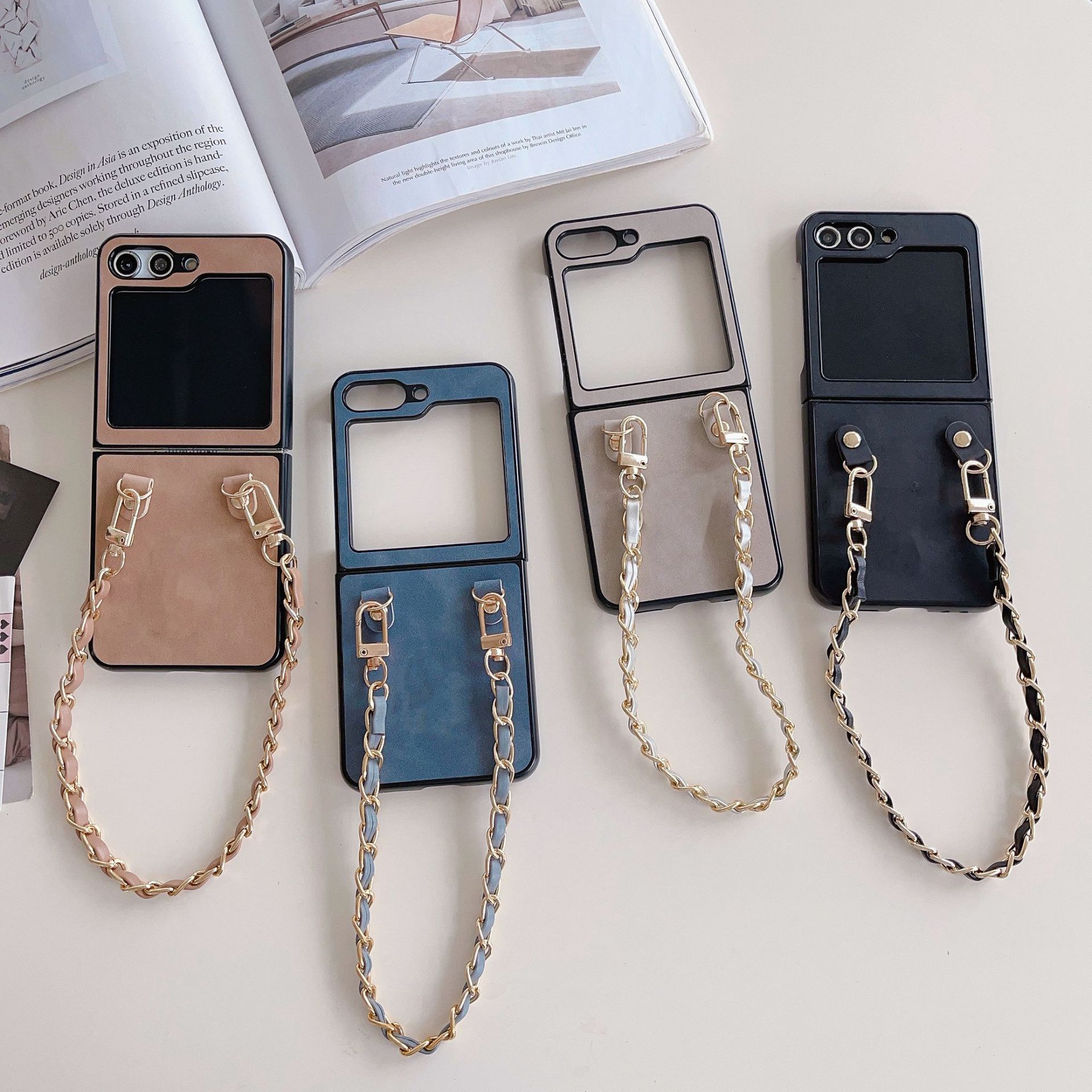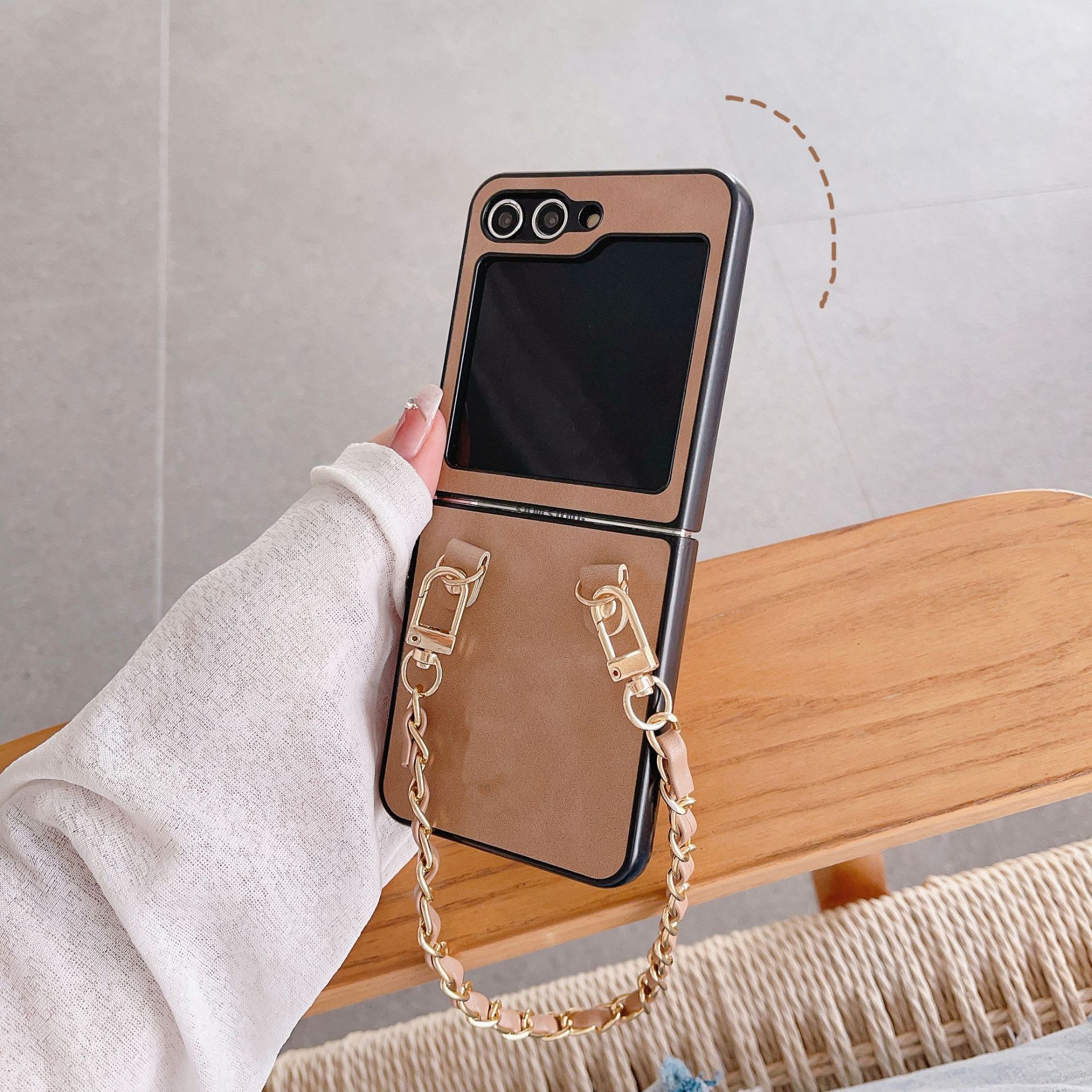 Aplicable a la funda plegable para teléfono Samsung ZFlip5 con cadena de cuero vintage ZFlip4, funda protectora portátil resistente a caídas, Japón y Corea del Sur