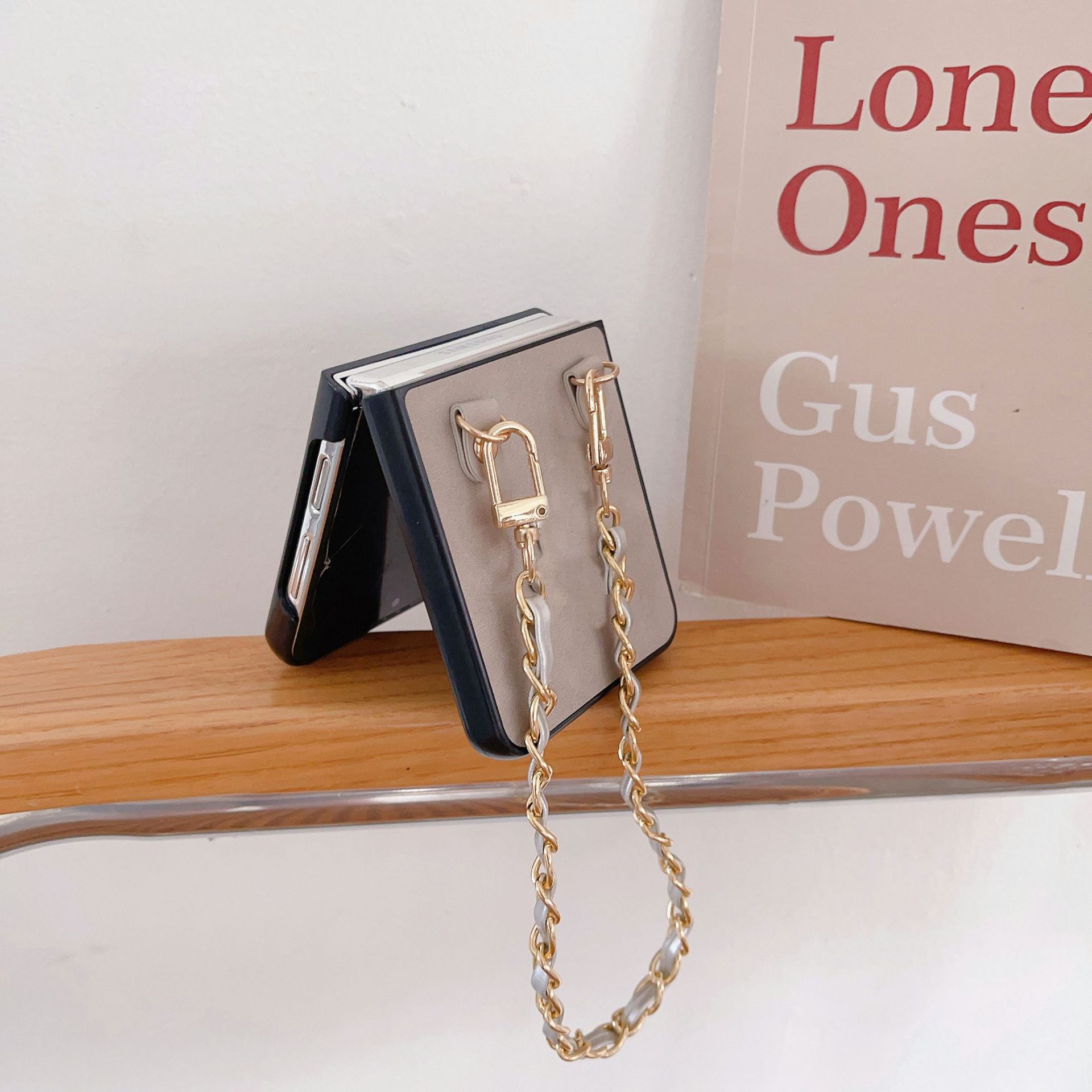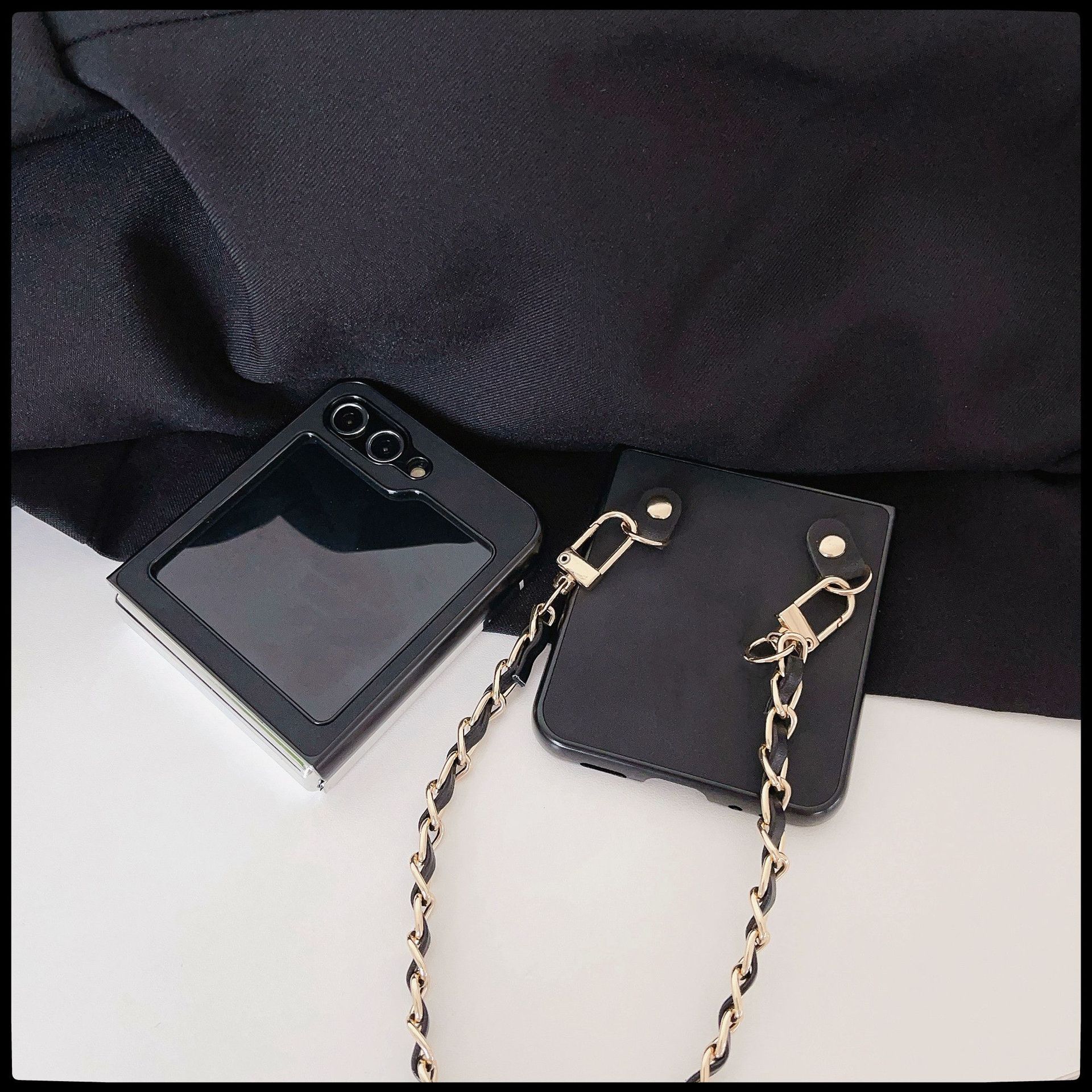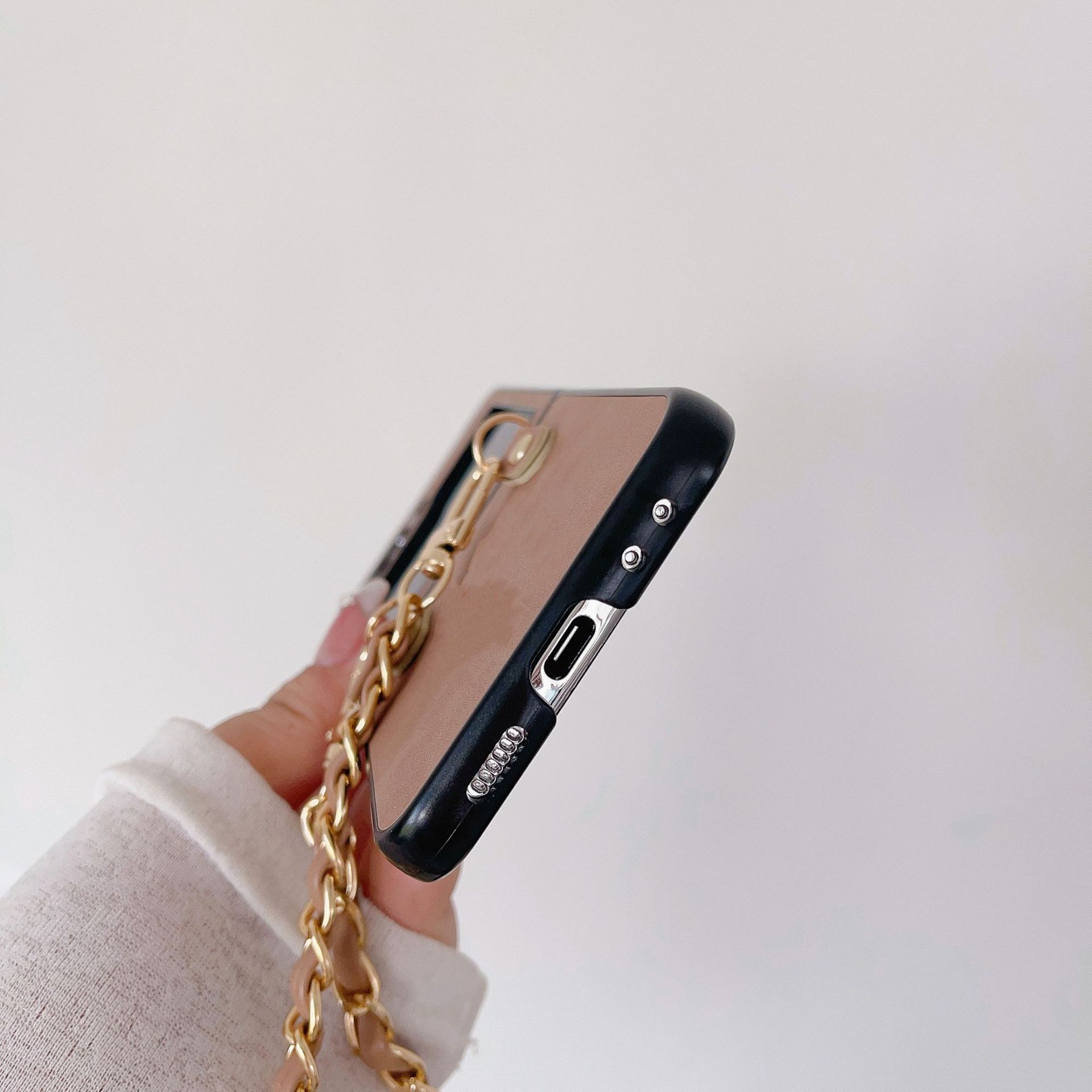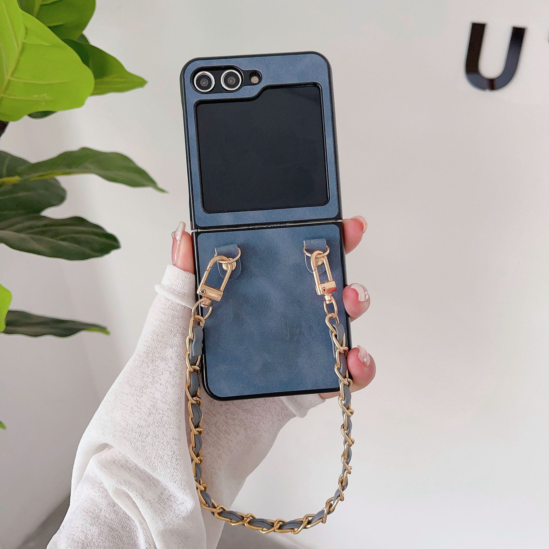 Aplicable a la funda plegable para teléfono Samsung ZFlip5 con cadena de cuero vintage ZFlip4, funda protectora portátil resistente a caídas, Japón y Corea del Sur