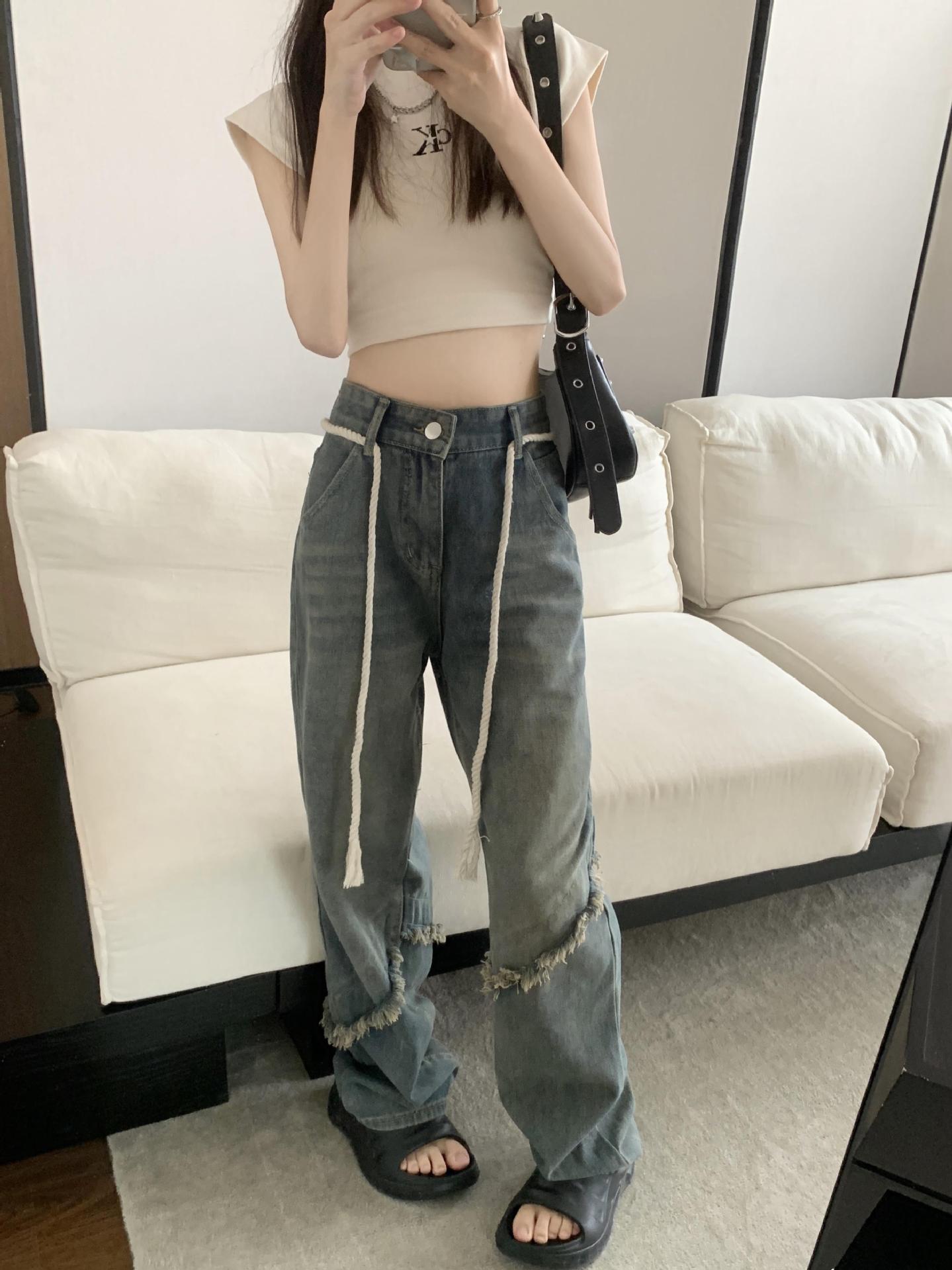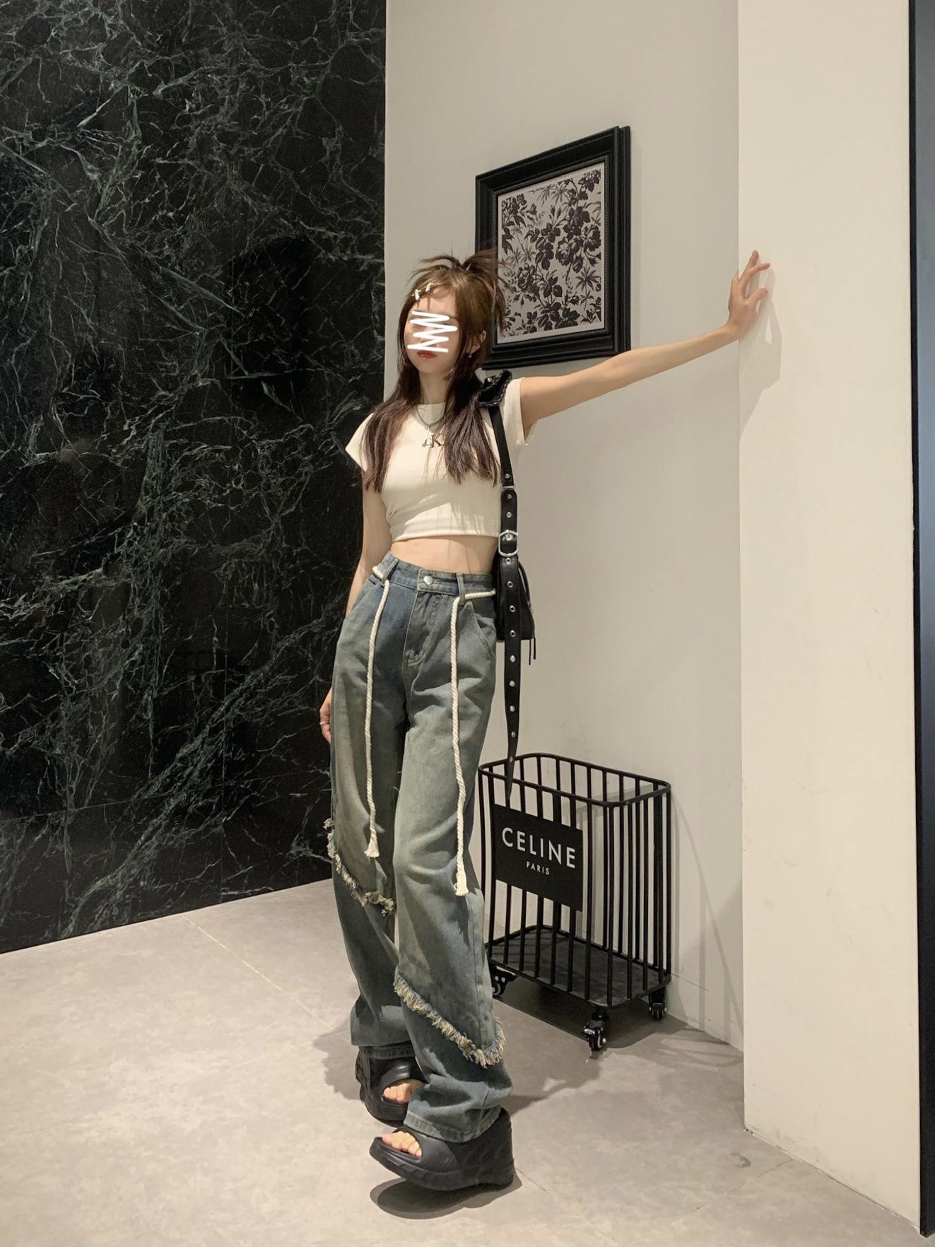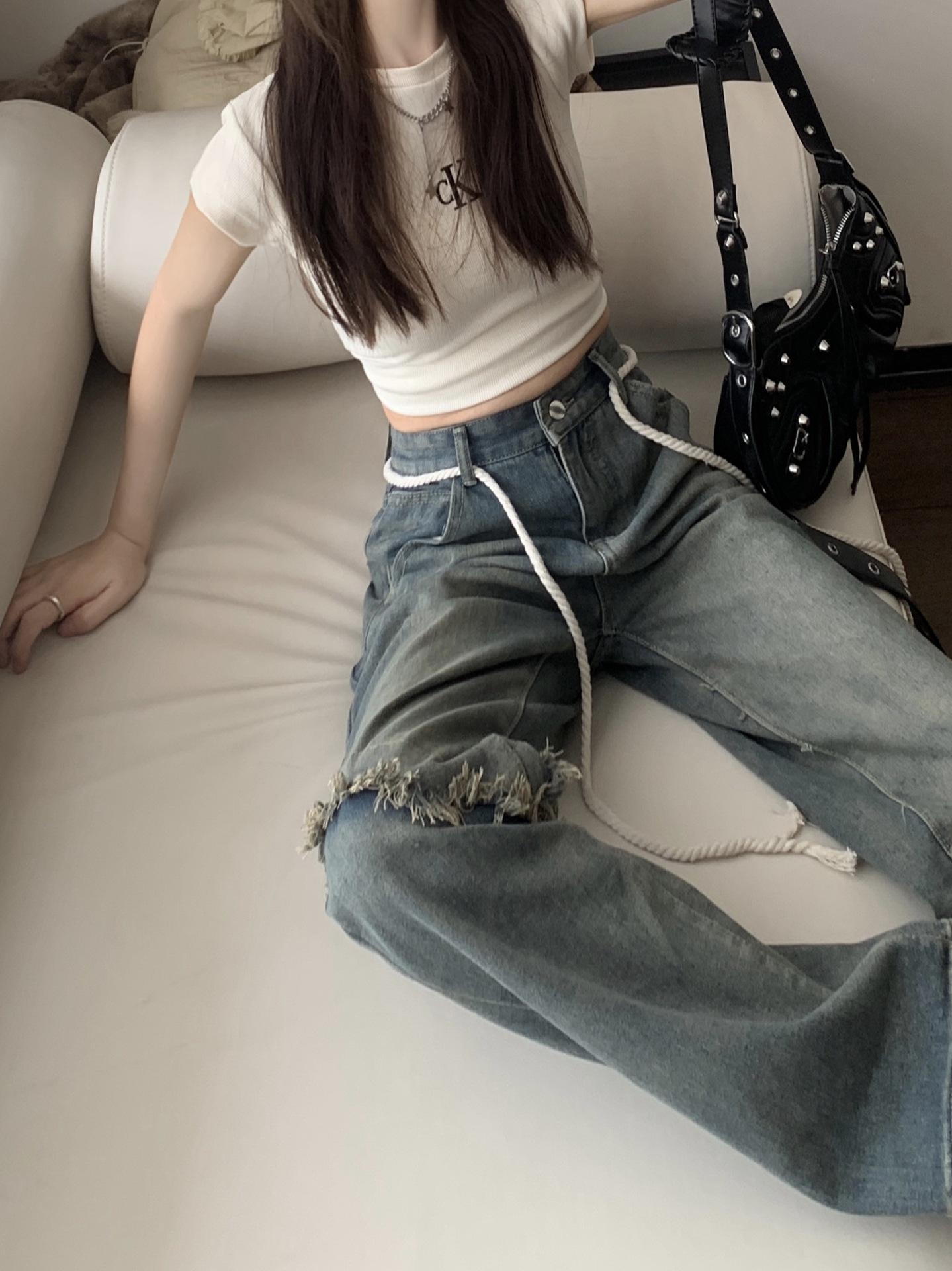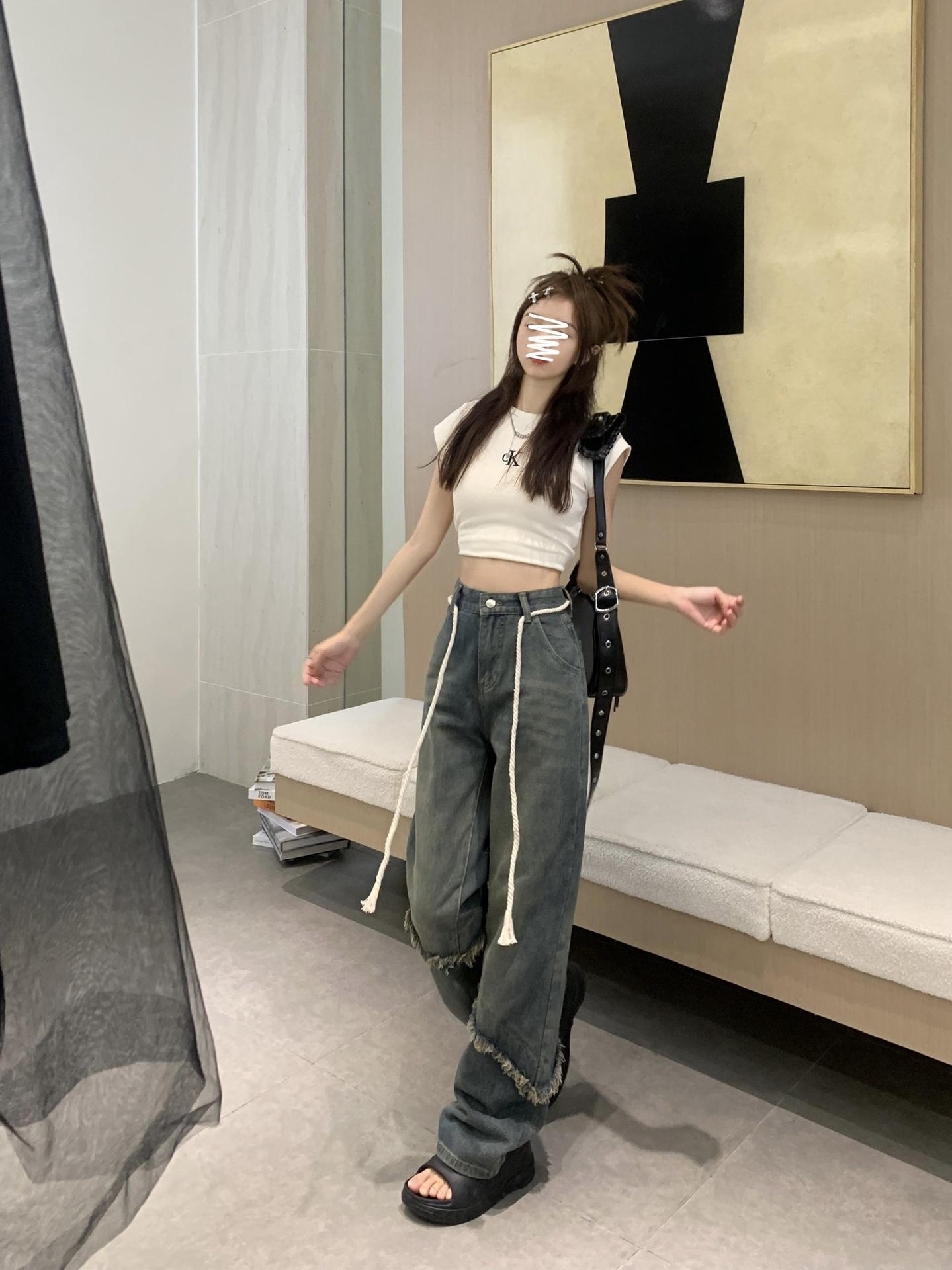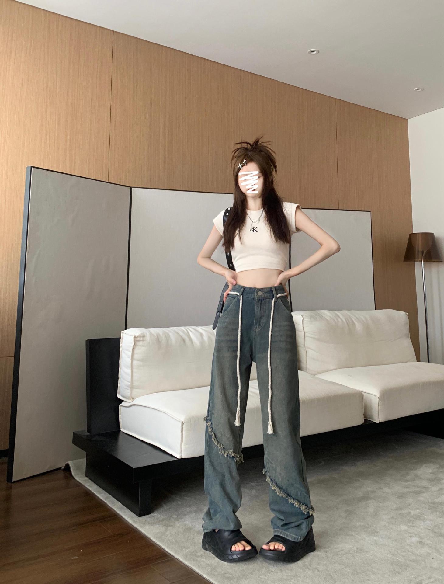 Jeans Americanos Retro de Diseño Nicho de Cintura Alta con Orilla Cruda para Mujer Pantalones Rectos Holgados Adelgazantes de Calle Alta