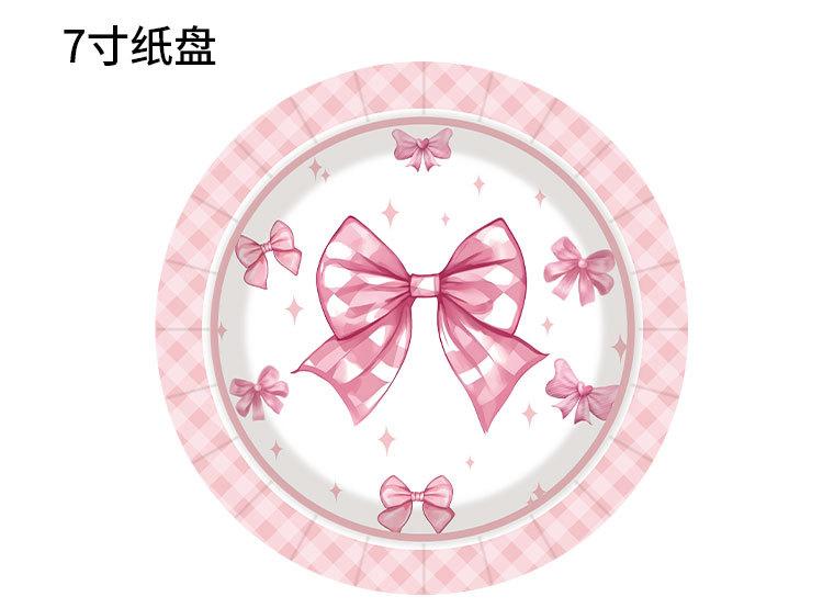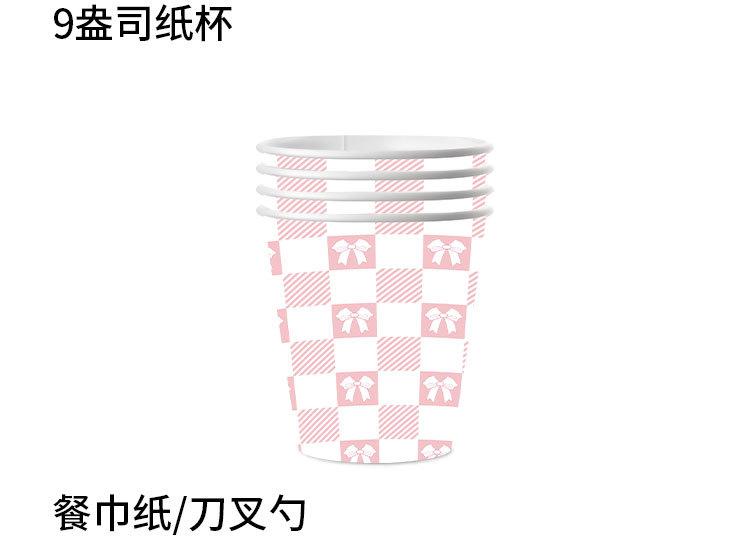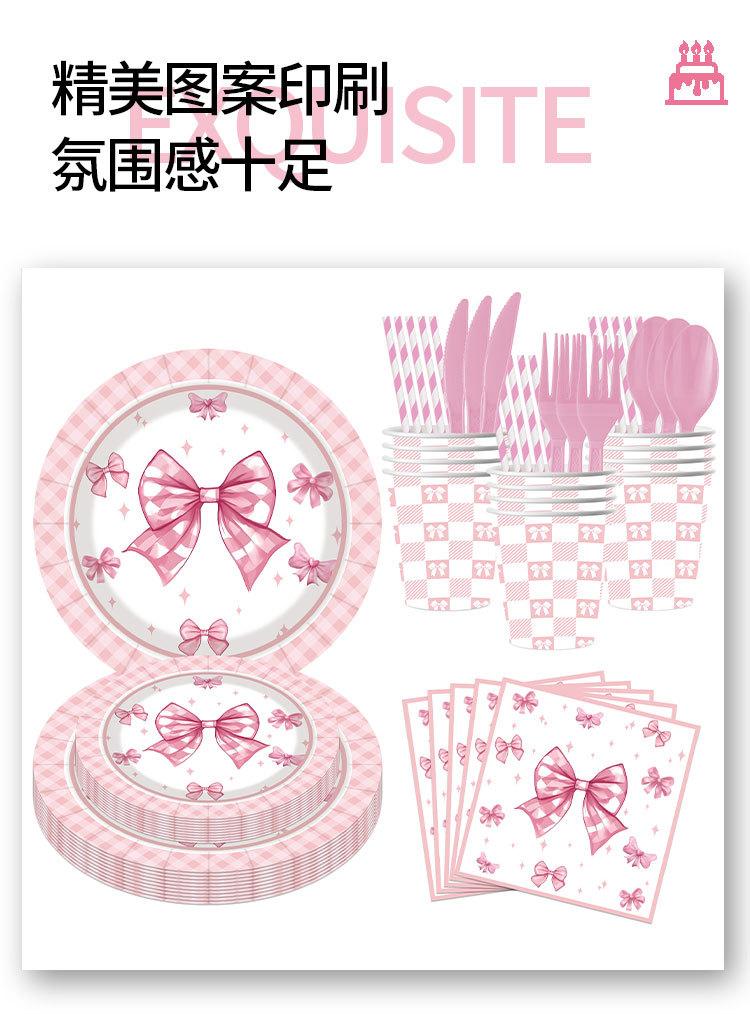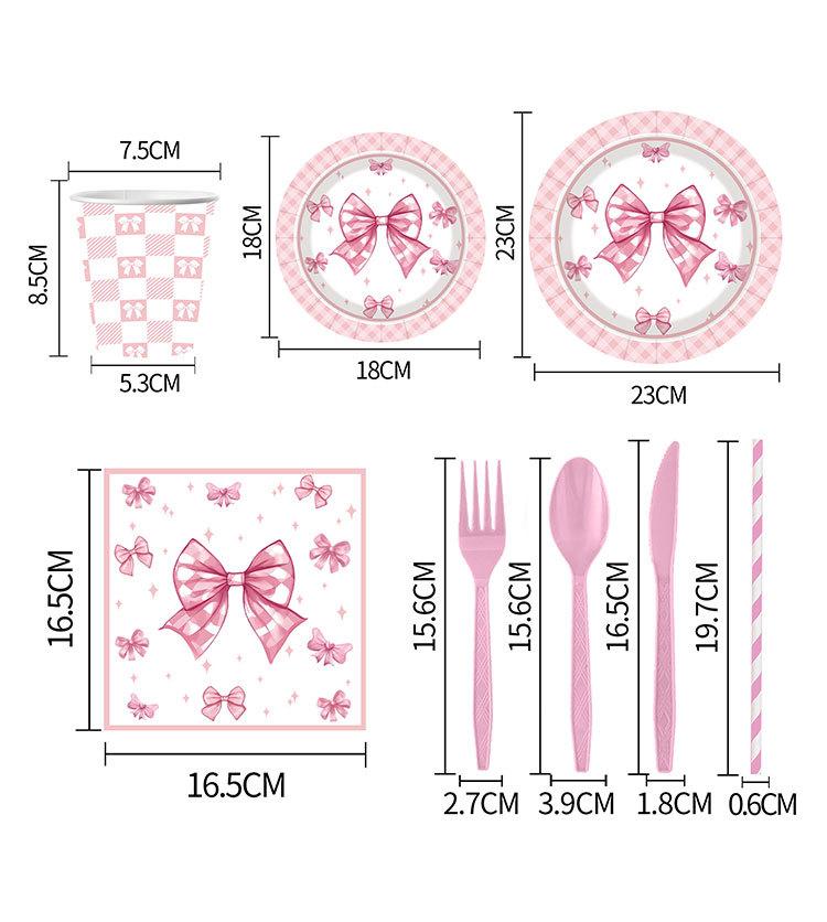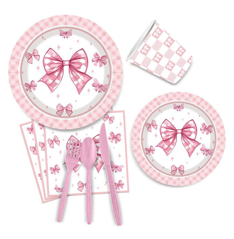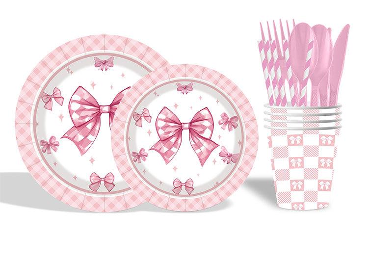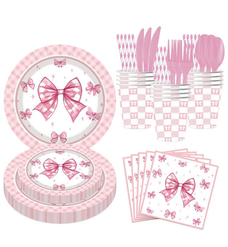 Artículos para fiestas con lazo, vajilla desechable, vasos de papel, platos de papel, tartas de cumpleaños, vajilla decorativa de papel.