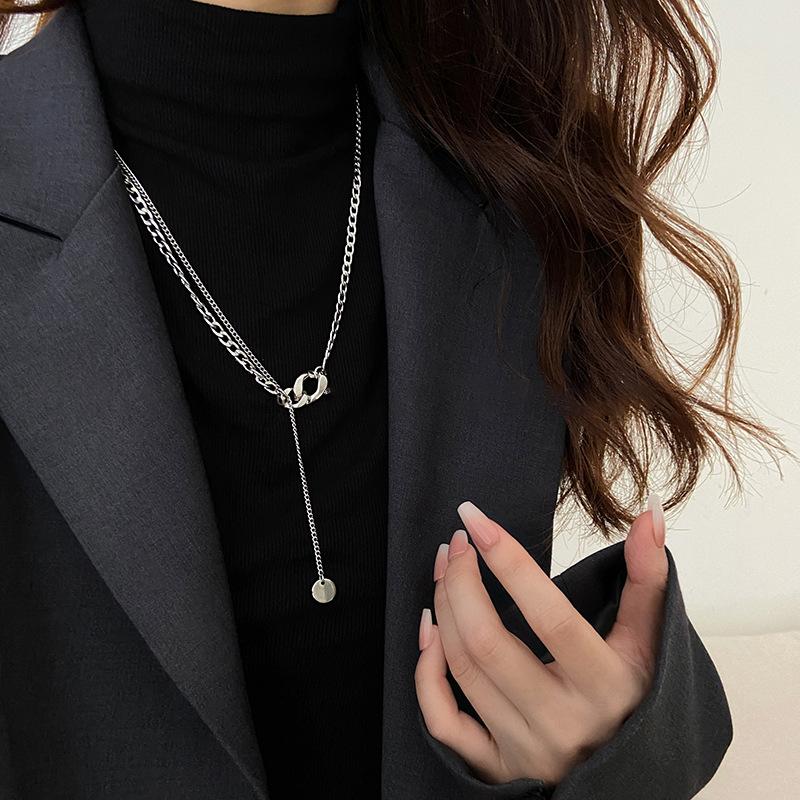 Collar con colgante redondo de plata de marca para otoño e invierno, estilo frío para mujer, cadena larga de lana sin color, accesorios modernos de hip-hop.