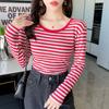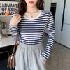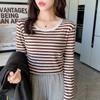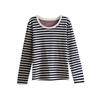 Otoño e invierno Nueva camiseta cálida a rayas para mujer, forro polar, gruesa, de una pieza, de terciopelo, cuello redondo interior, manga larga, camiseta para mujer