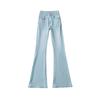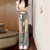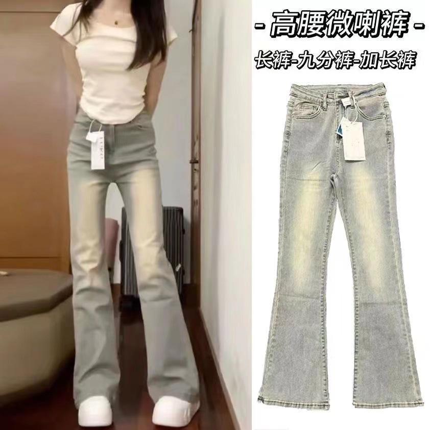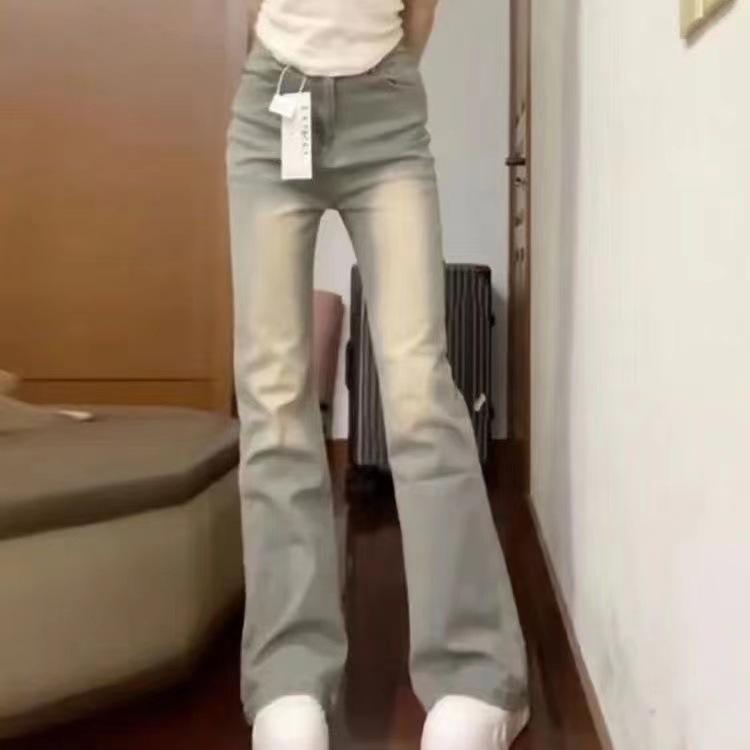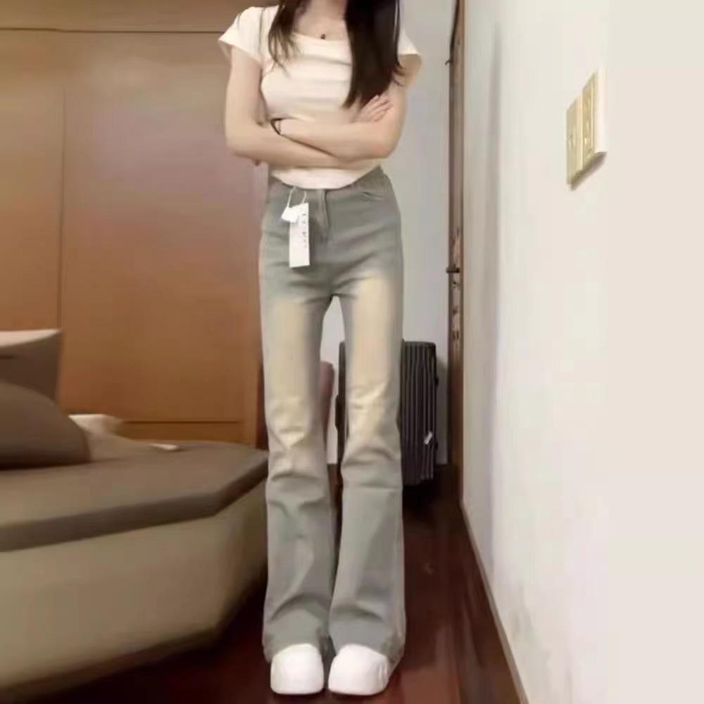 Jeans Americanos Microacampanados para Personas Pequeñas, Jeans Amarillentos Ensuciados para Mujer, Nuevo Look Adelgazante de Cintura, Pantalones Horseshoe