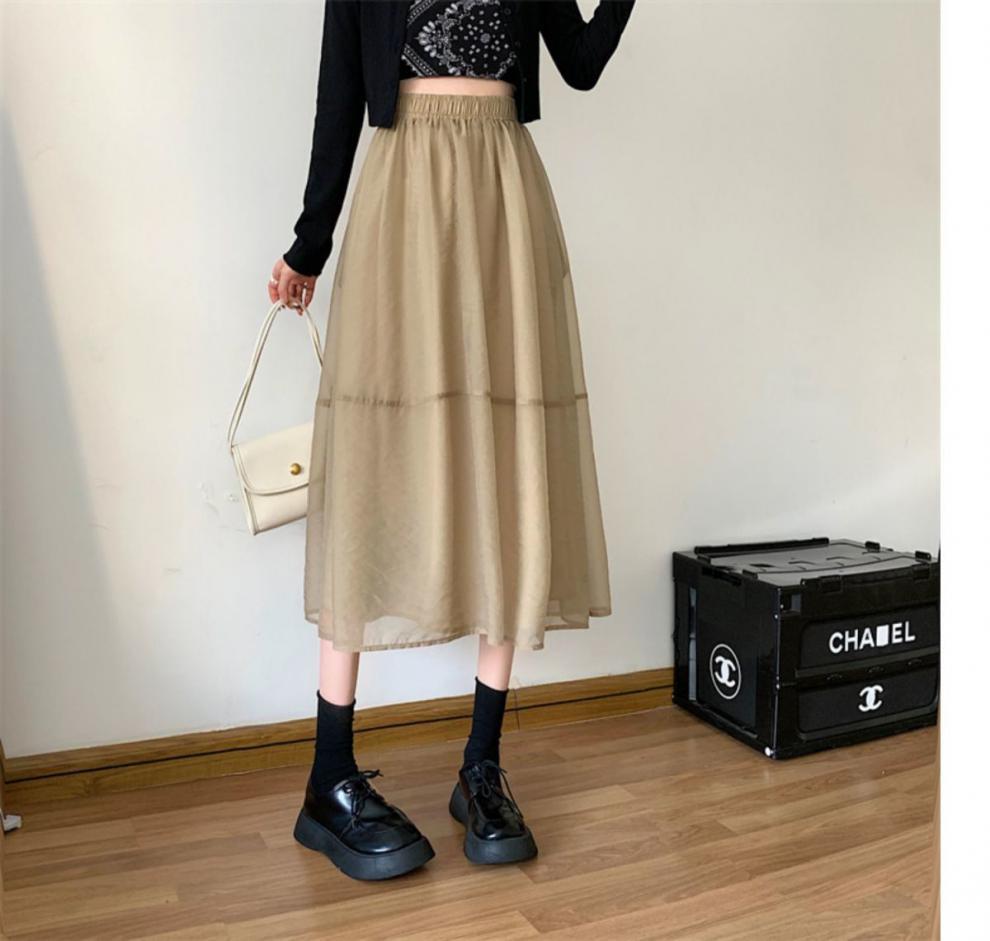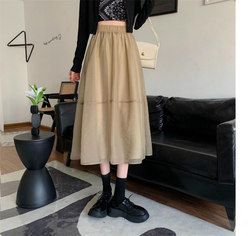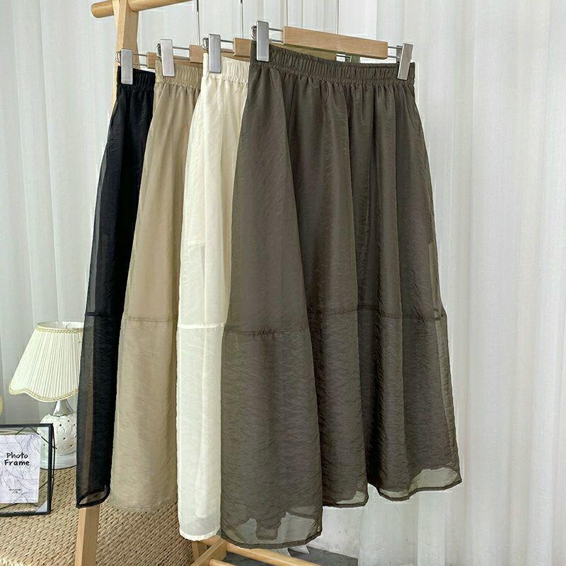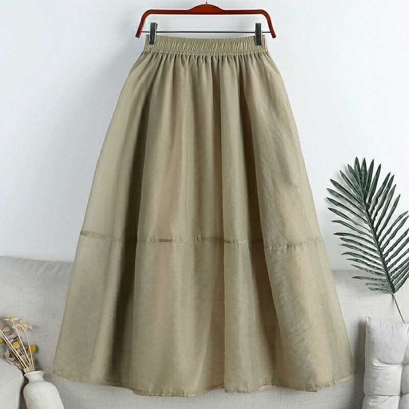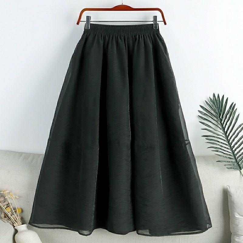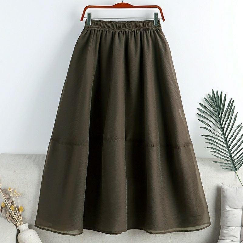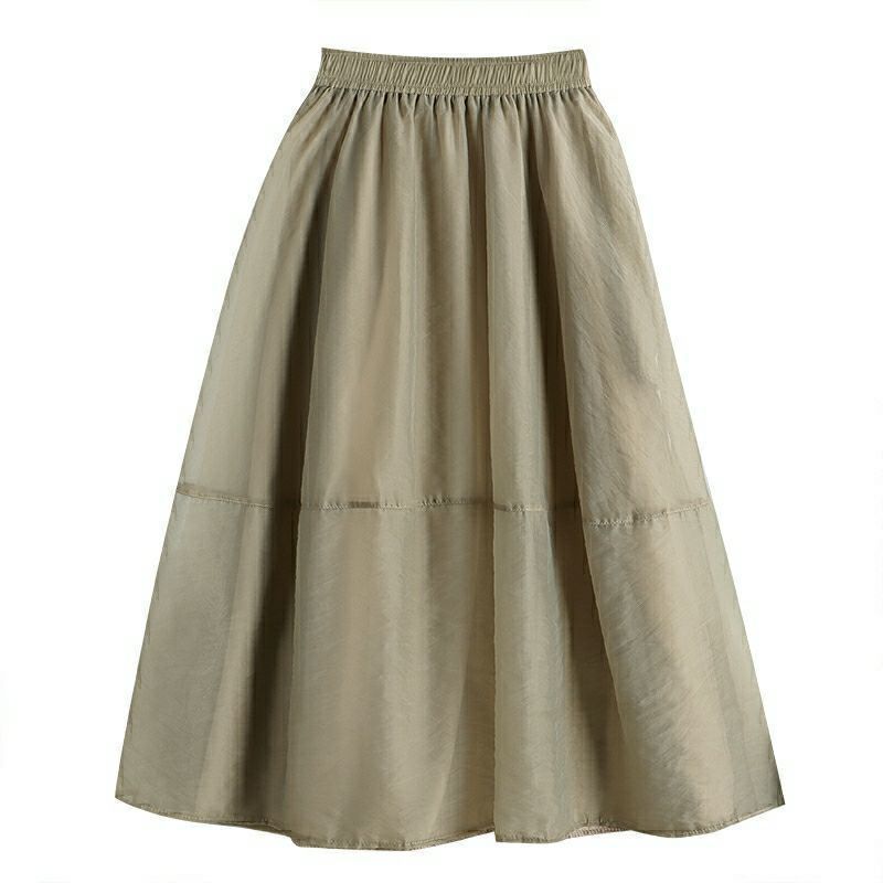 Falda de media pierna de estilo A para mujer, estilo veraniego, de cintura alta, ajustada, de organza, con bolsillos y solapa, empalmada, de largo medio y dobladillo grande.