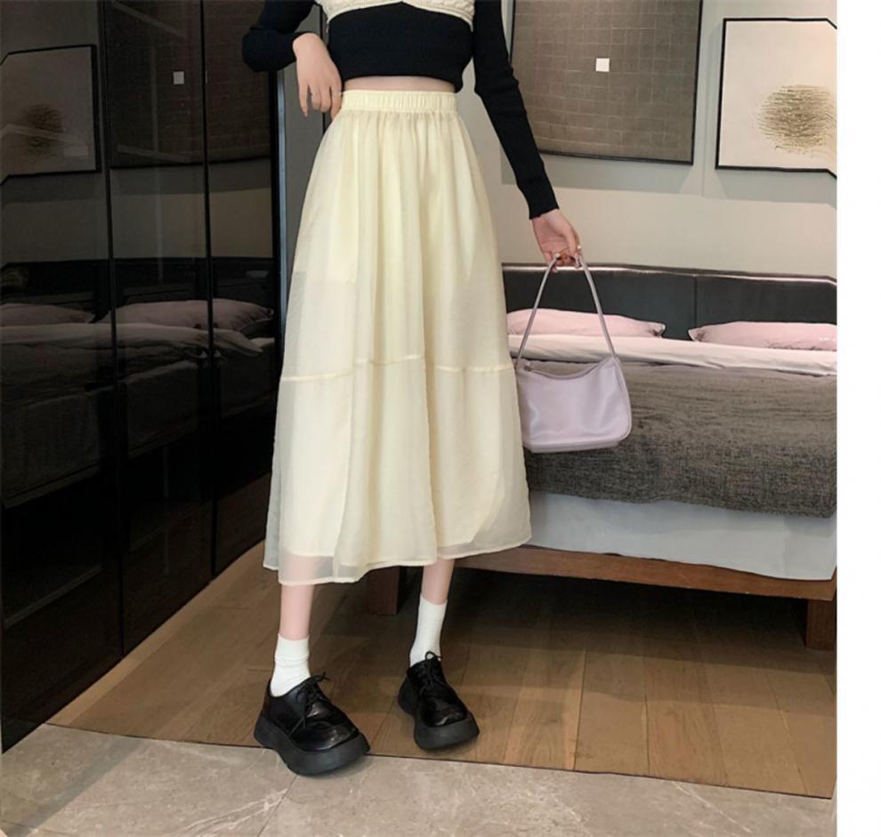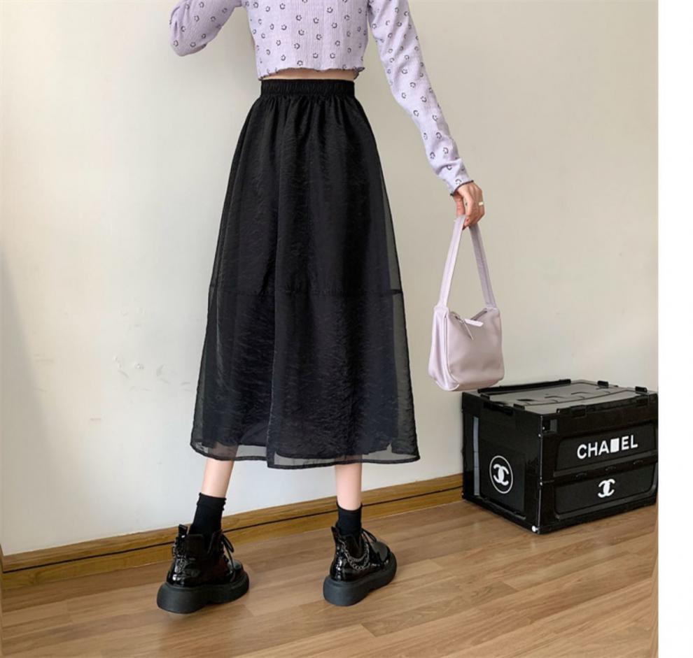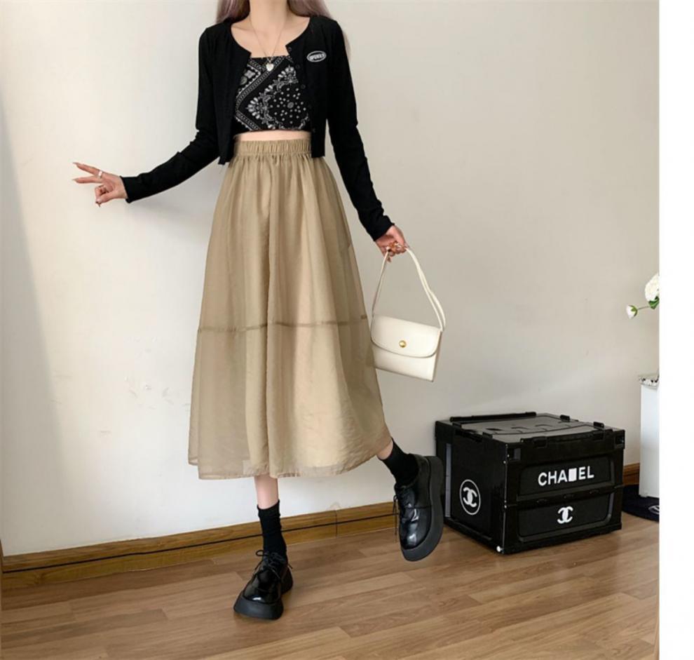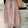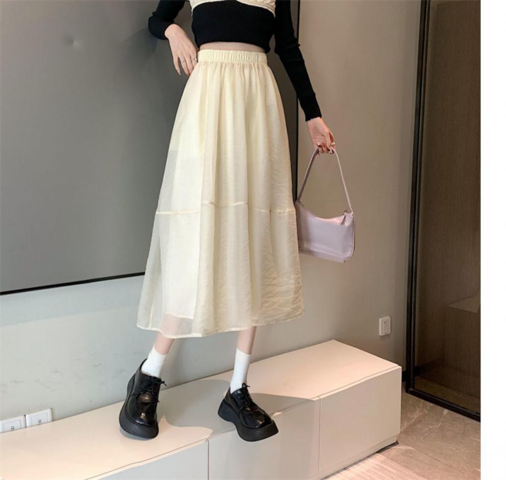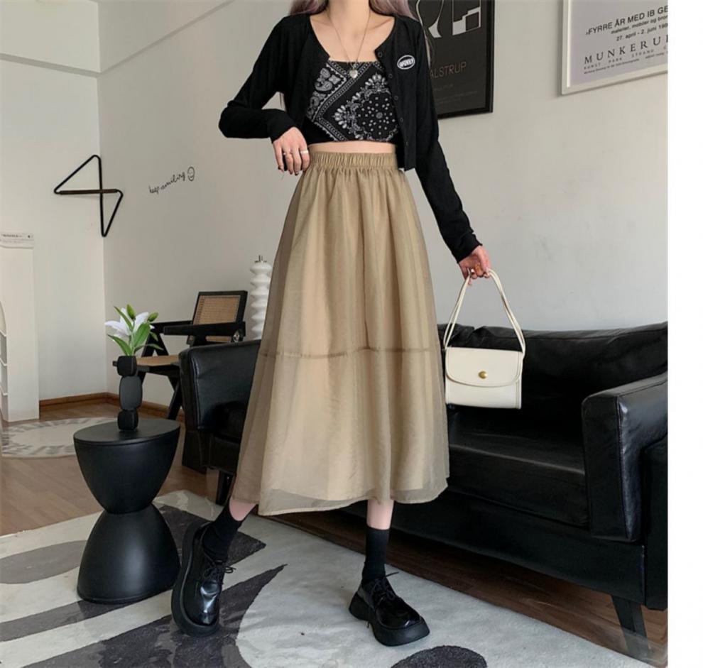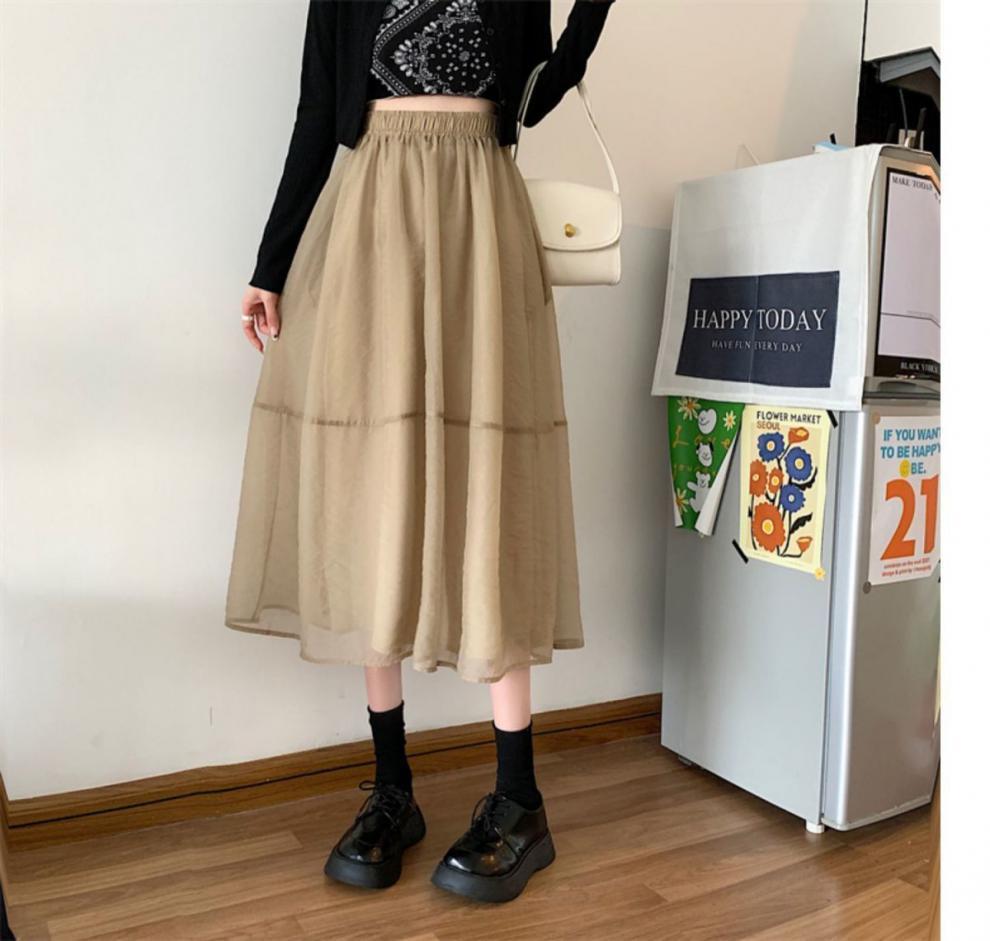 Falda de media pierna de estilo A para mujer, estilo veraniego, de cintura alta, ajustada, de organza, con bolsillos y solapa, empalmada, de largo medio y dobladillo grande.