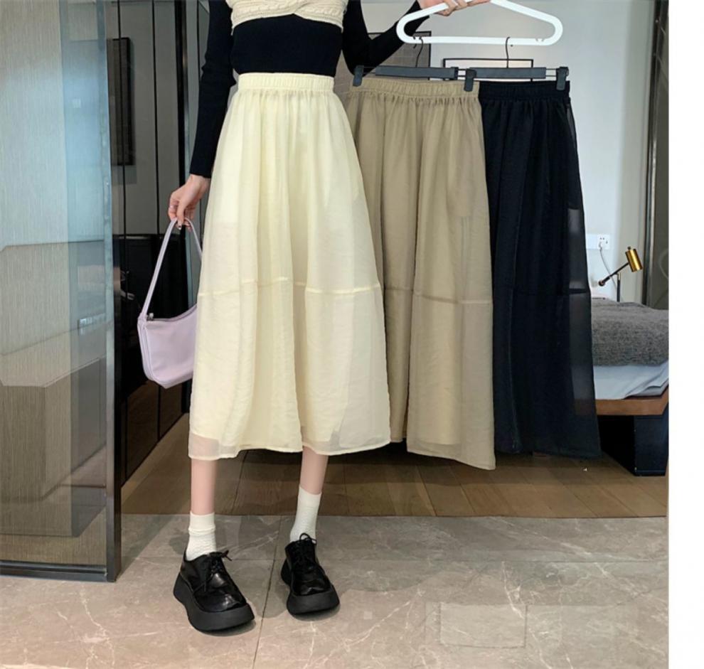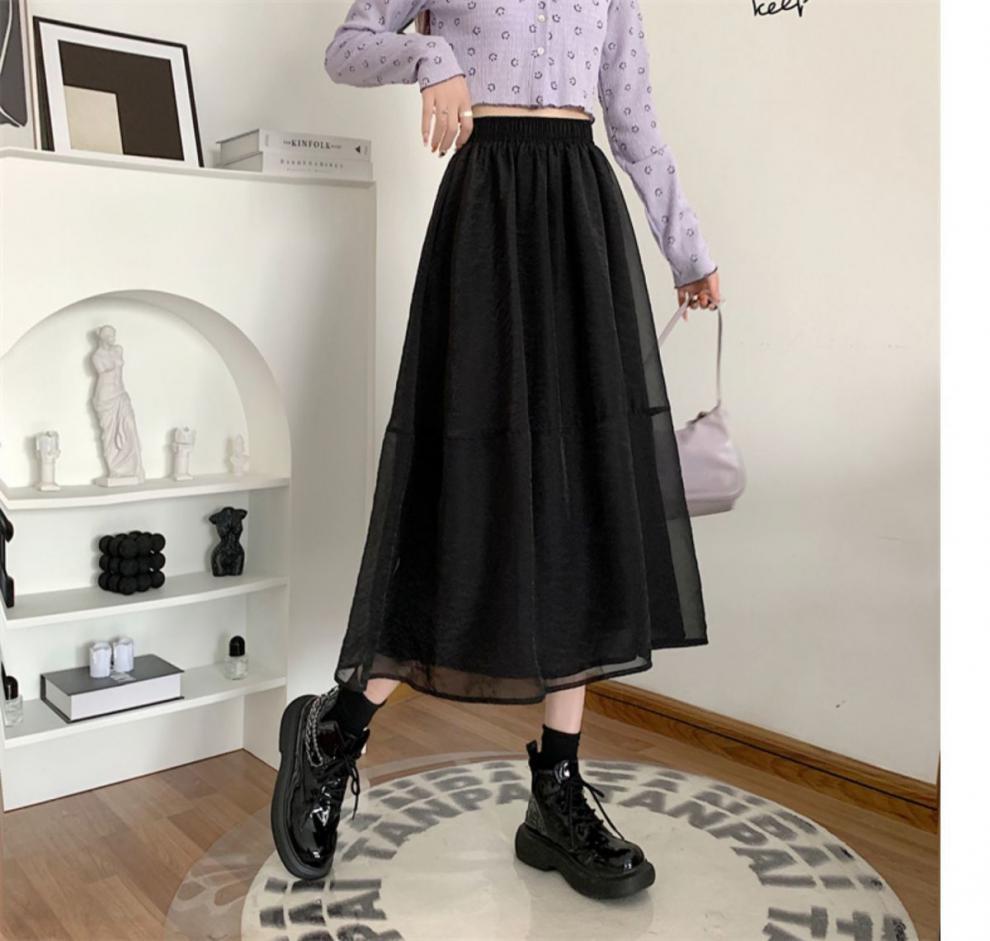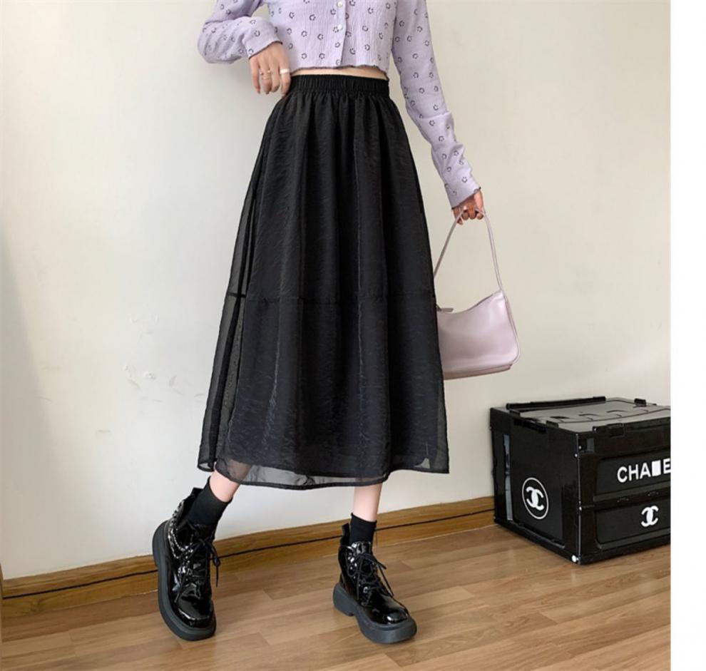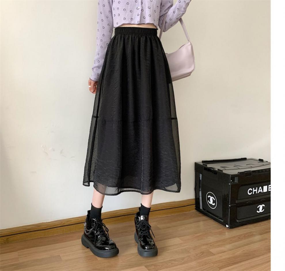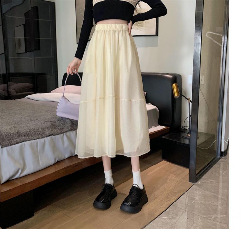 Falda de media pierna de estilo A para mujer, estilo veraniego, de cintura alta, ajustada, de organza, con bolsillos y solapa, empalmada, de largo medio y dobladillo grande.