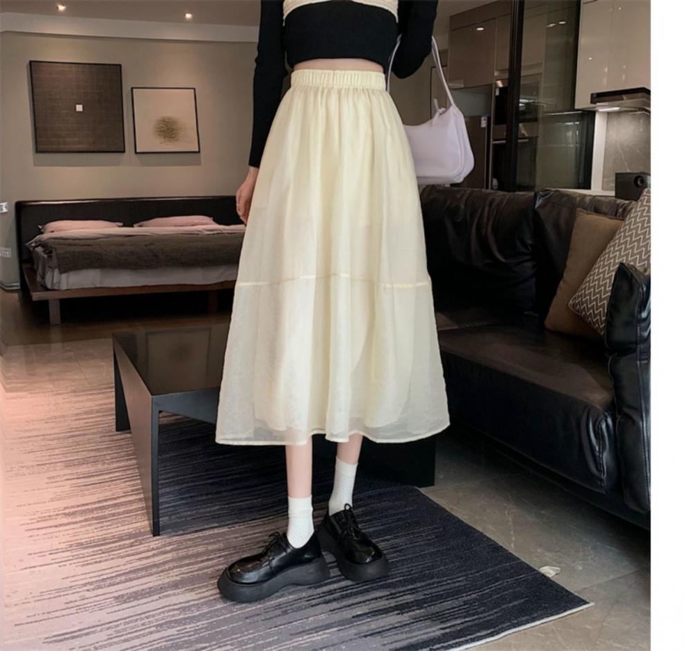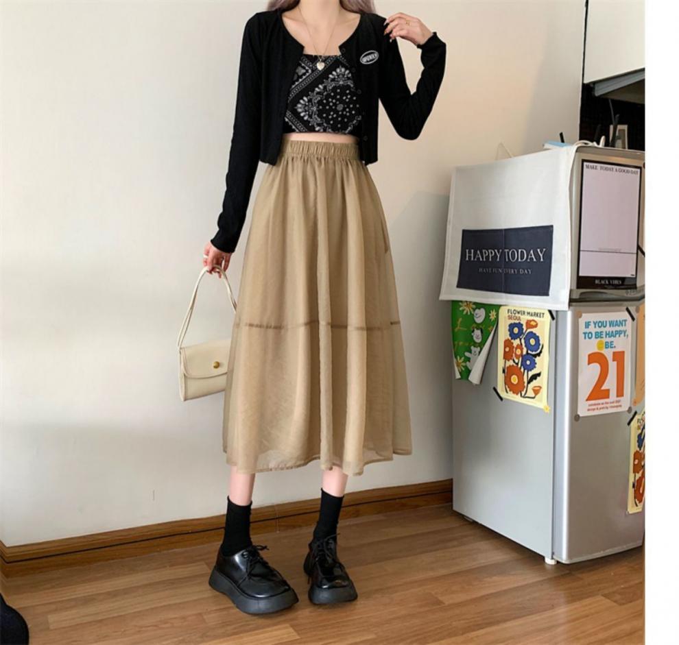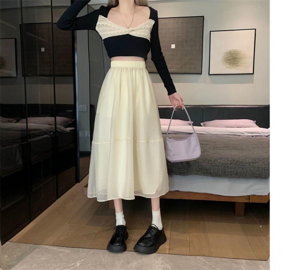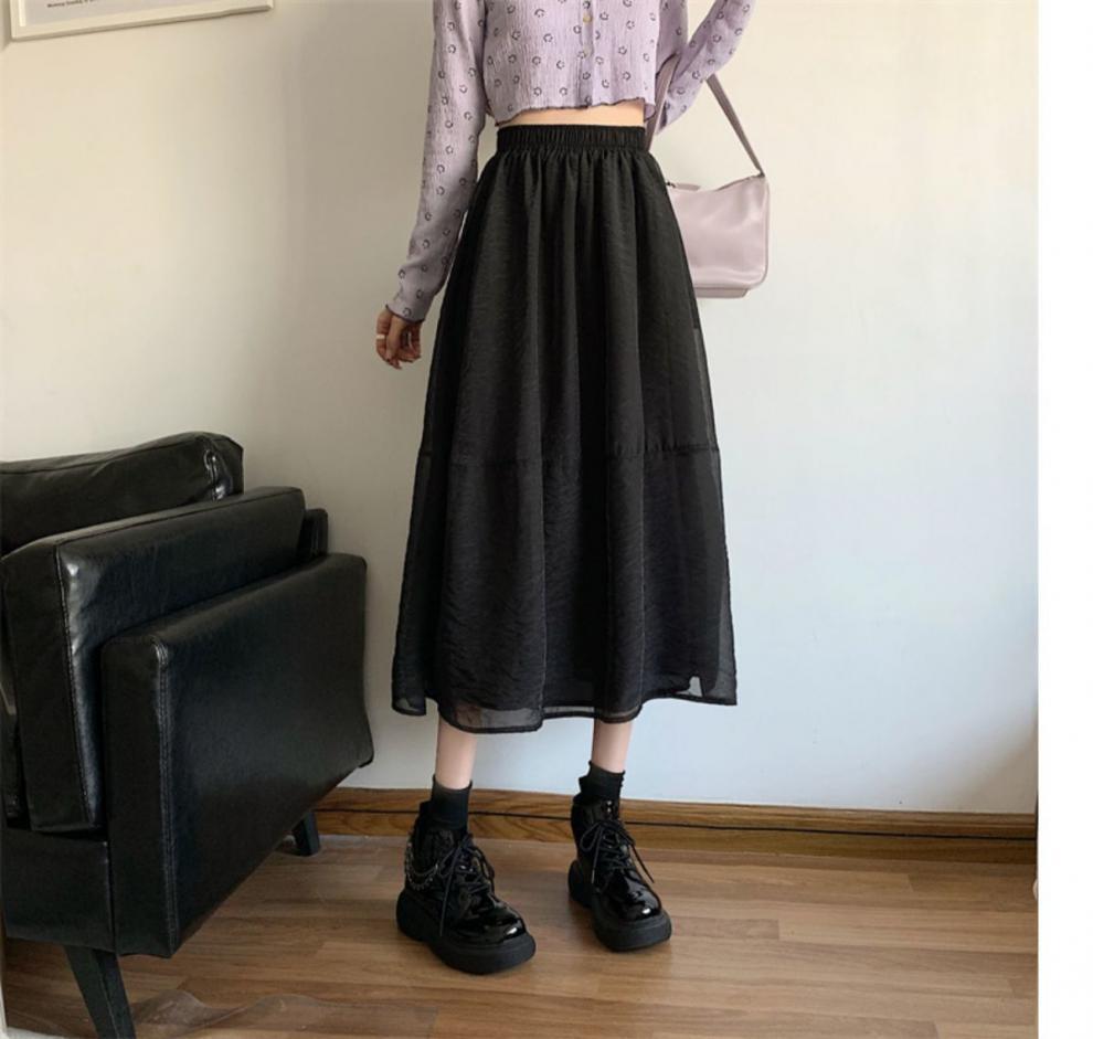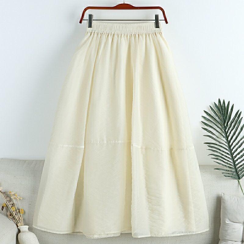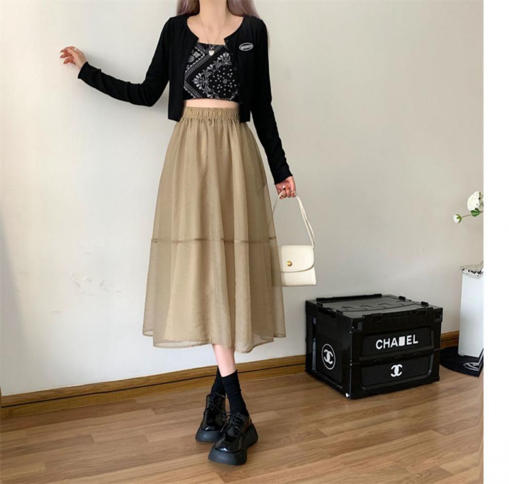 Falda de media pierna de estilo A para mujer, estilo veraniego, de cintura alta, ajustada, de organza, con bolsillos y solapa, empalmada, de largo medio y dobladillo grande.